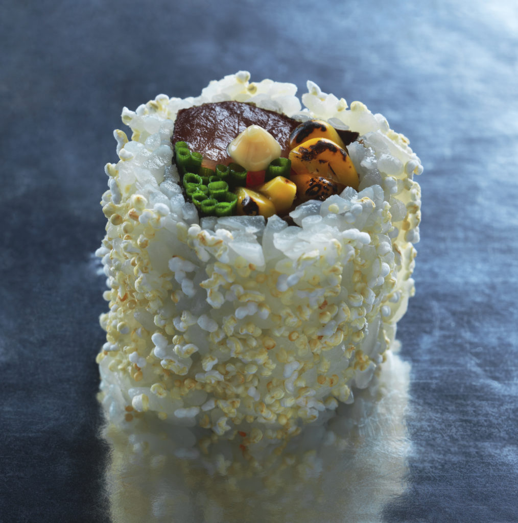 Un gunkan enroulé d’une algue nori garni de dés de daurade, de mangue fraîche et de perles de vinaigre de mangue. Une véritable explosion de saveurs !