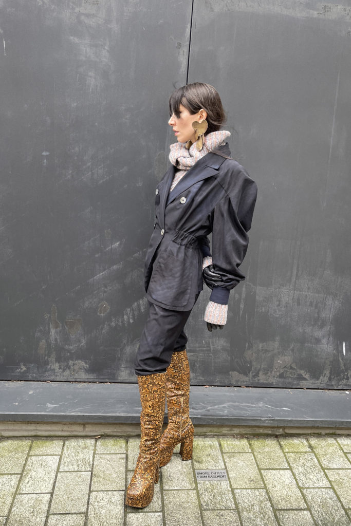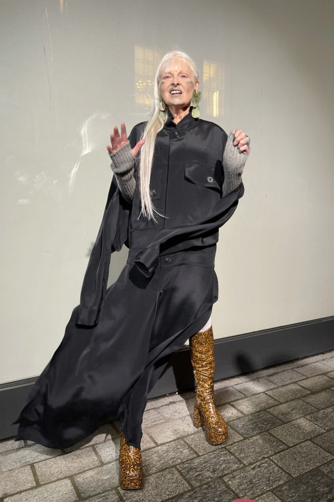 Qui est cet intellectuel en robe noire, belles bottes + cheveux argentés, buvant sa tasse de thé ? Le couturier « Andreas » met les femmes sur un piédestal, les vêtements sont transformateurs, la robe est une expression de la personnalité + aspiration.