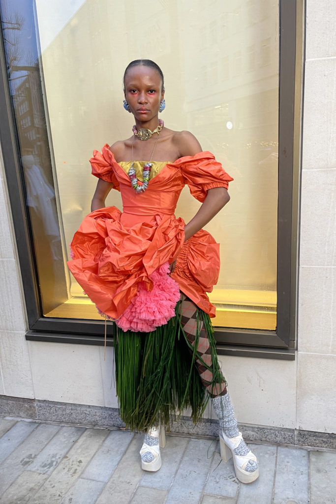 Nous avons pensé à Eliza + sa forte personnalité quand nous avons conçu la nouvelle collection. « Tout ce que je veux, c’est une chambre quelque part … » …” vendant des fleurs bandeau tricoté à la main, tutu de fée, collants à imprimés serpent, larges sandales à plateforme en satin; elle aurait pu se procurer dans un magasin de charité ; elle est protégée par Pygmalion – le cardigan à carreaux Tattersall de Higgins.