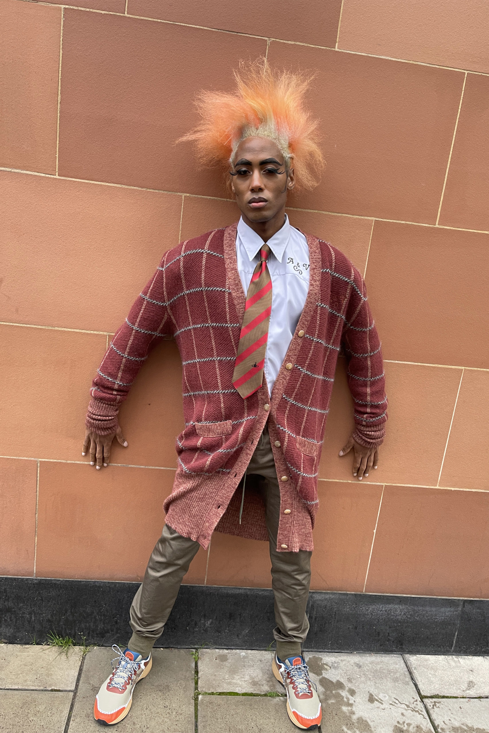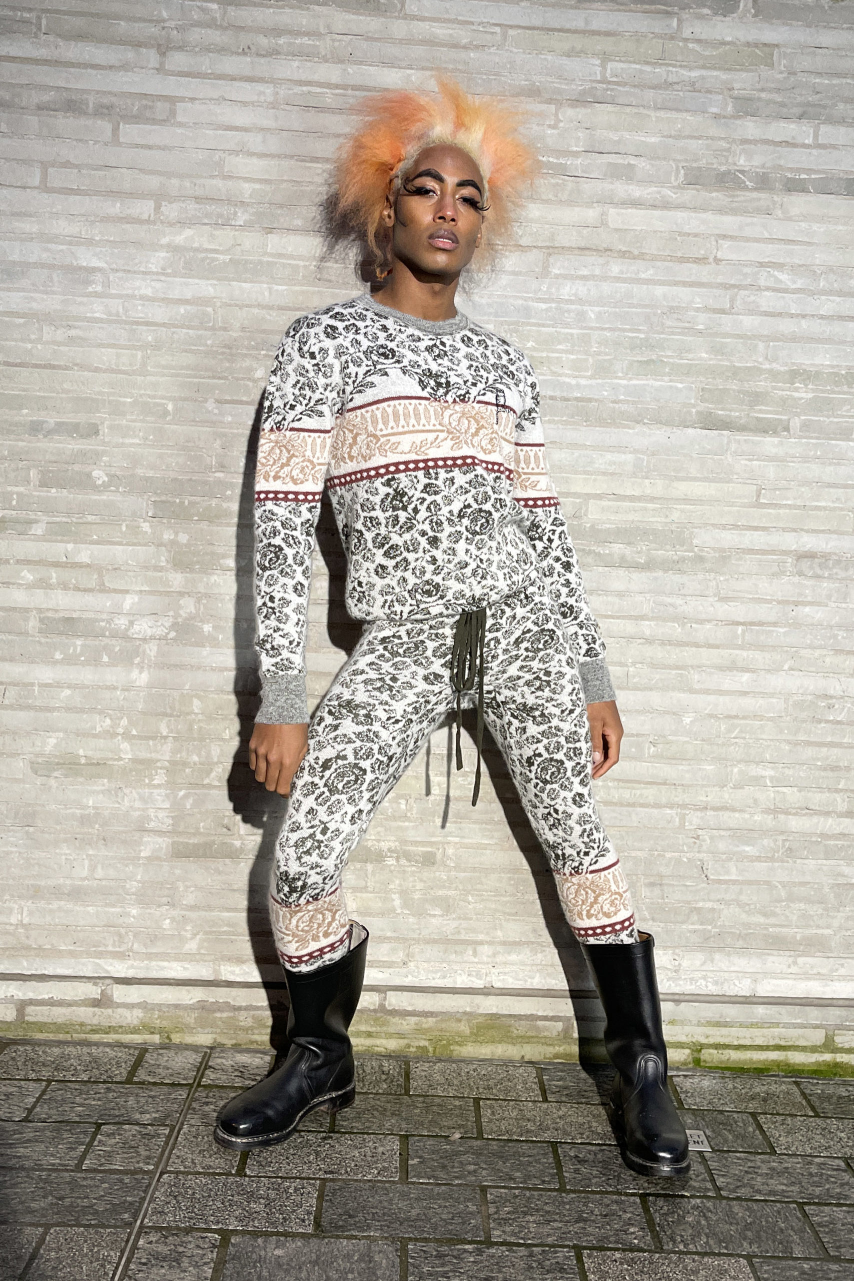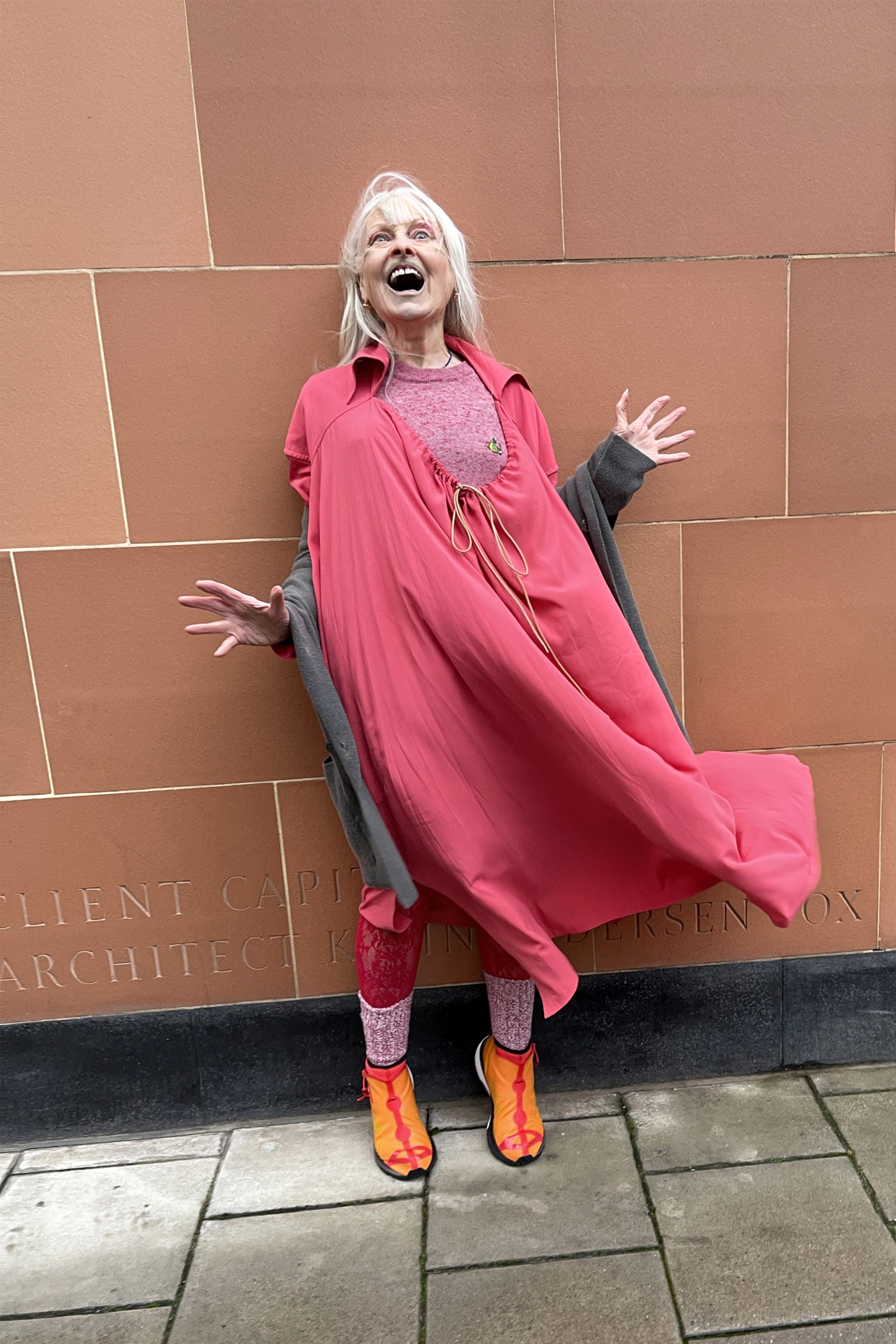 Freddy aux cheveux roses, marchant dans la rue ; ils rêvaient d’Eliza. Nous les avons habillés de style colonial avec un long manteau Kaki. Nos robes longues + manteaux sont un thème. Historiquement les robes longues nous viennent des somptueuses soies de l’Orient. Ils sont la robe des rois, des papes, des moines et des savants.