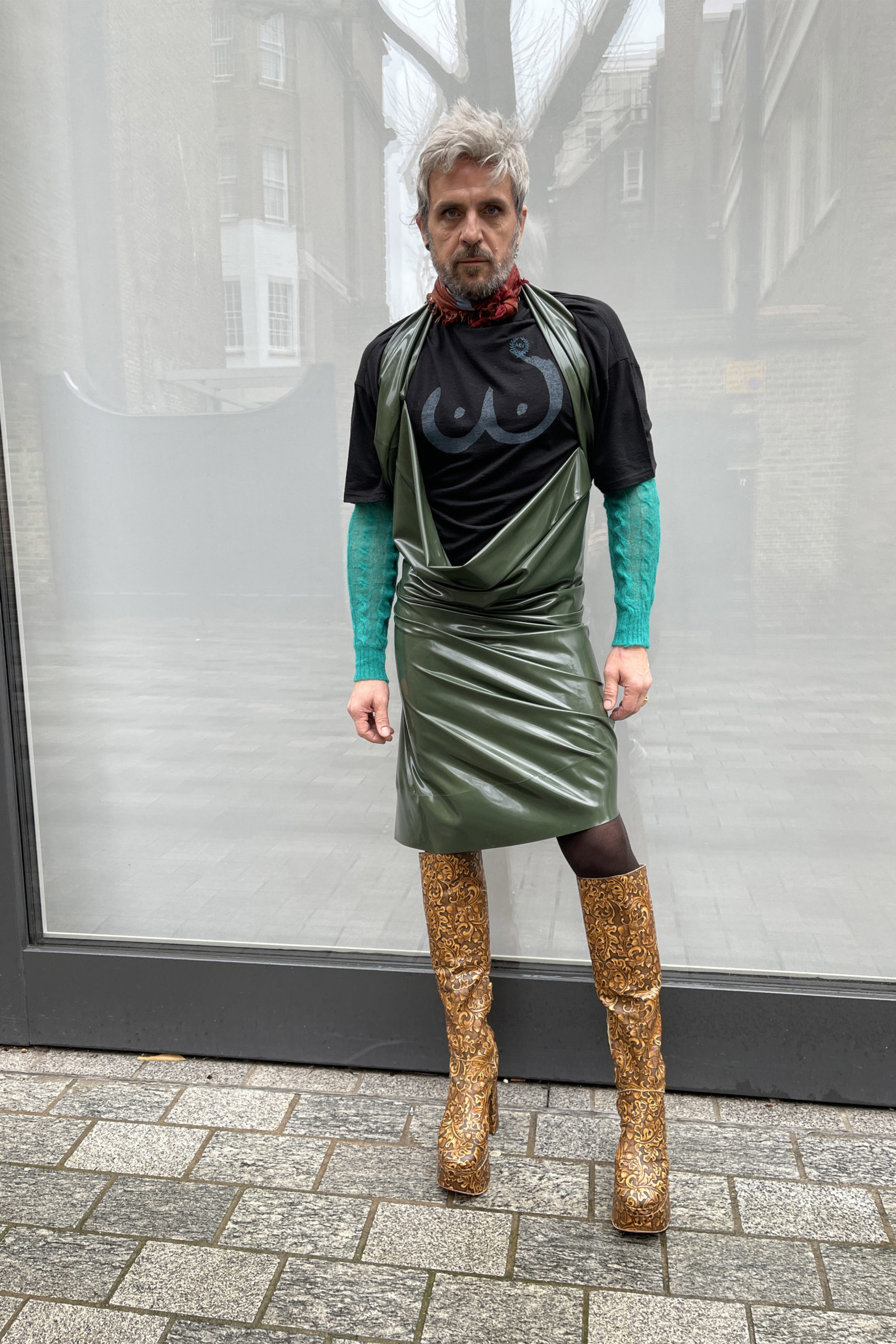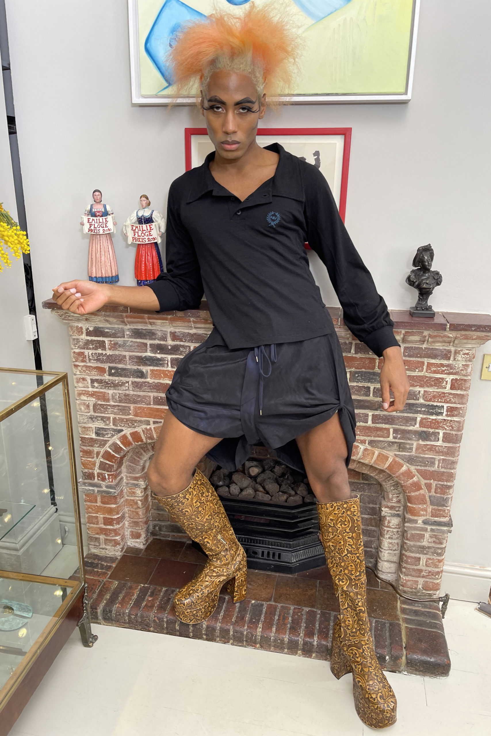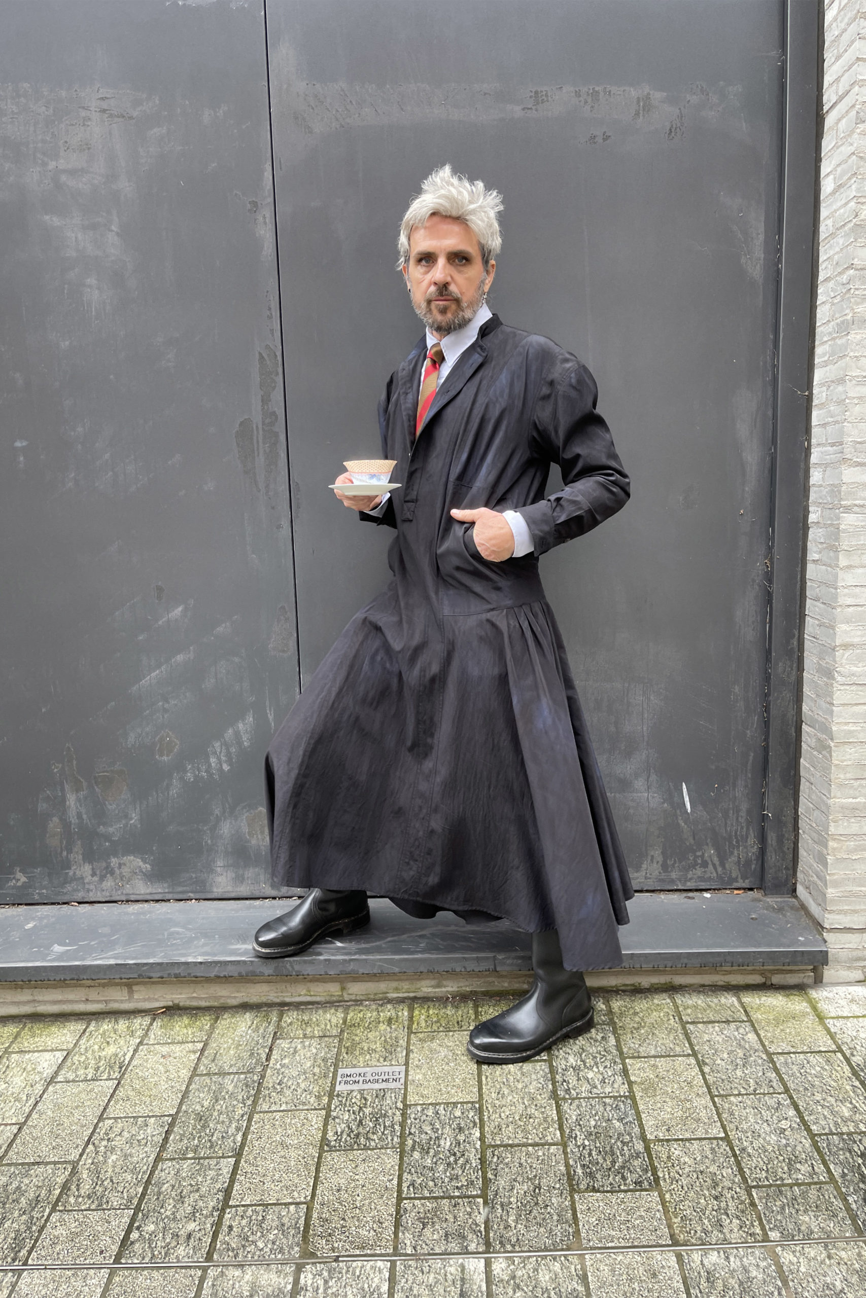 Qui est cet intellectuel en robe noire, belles bottes + cheveux argentés, buvant sa tasse de thé ? Le couturier « Andreas » met les femmes sur un piédestal, les vêtements sont transformateurs, la robe est une expression de la personnalité + aspiration.