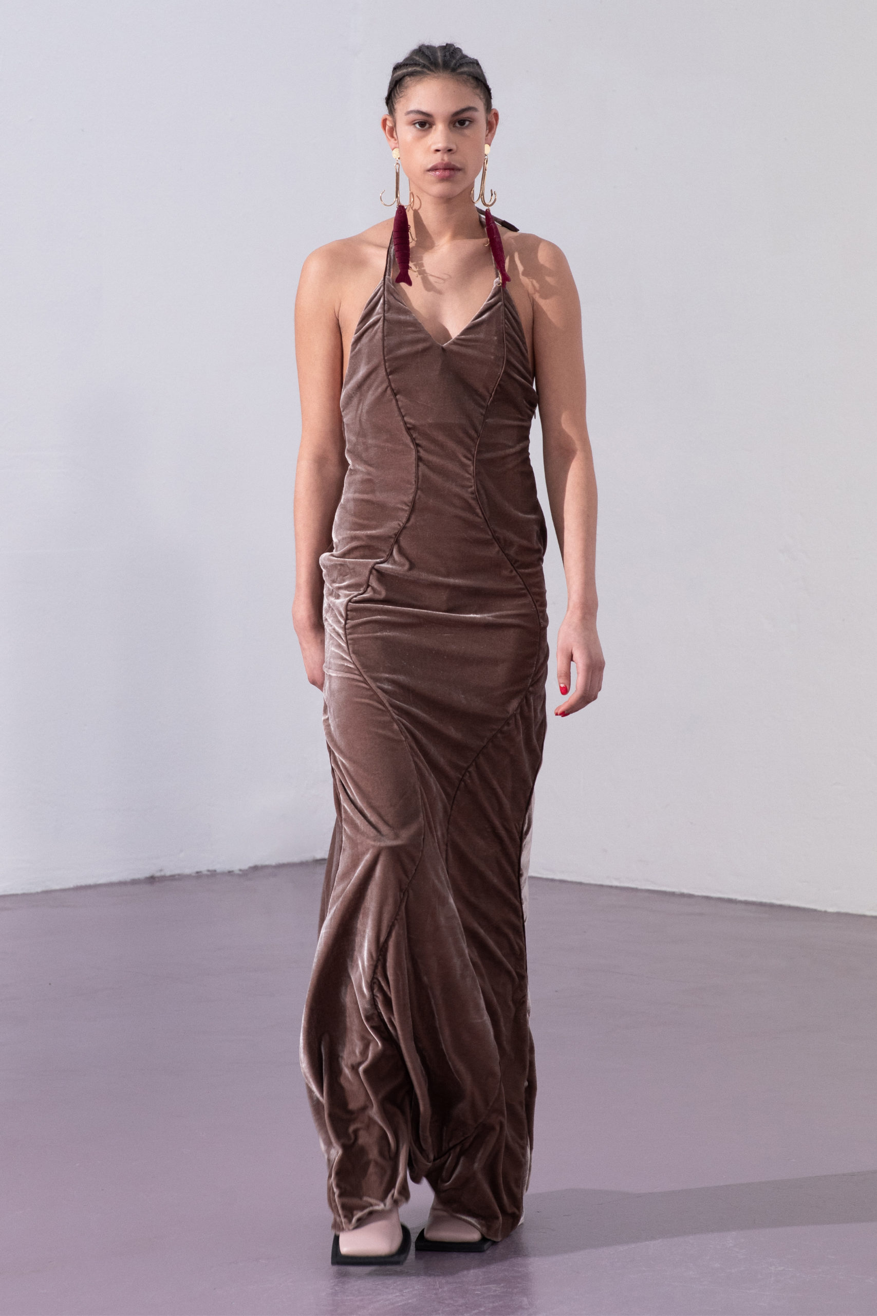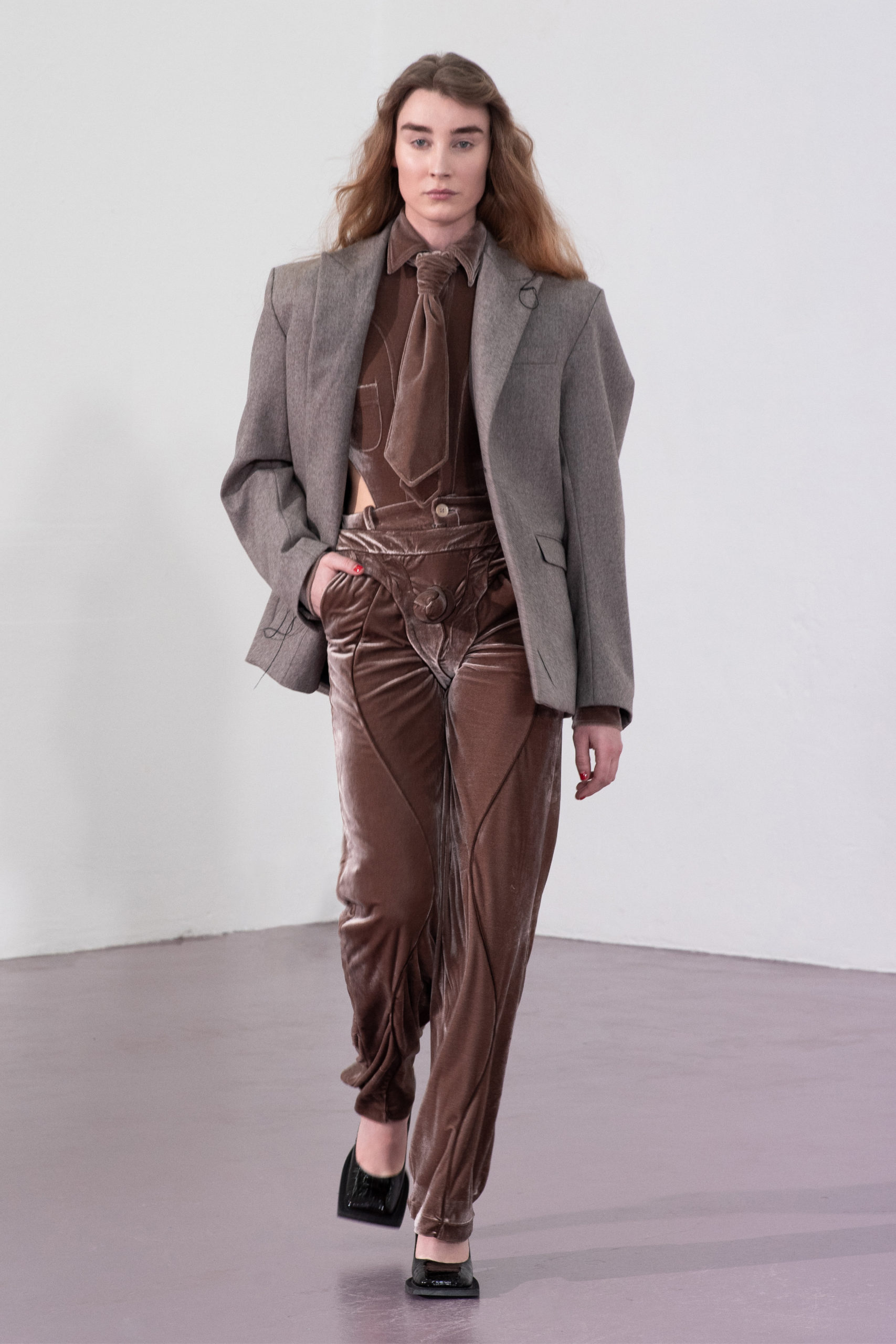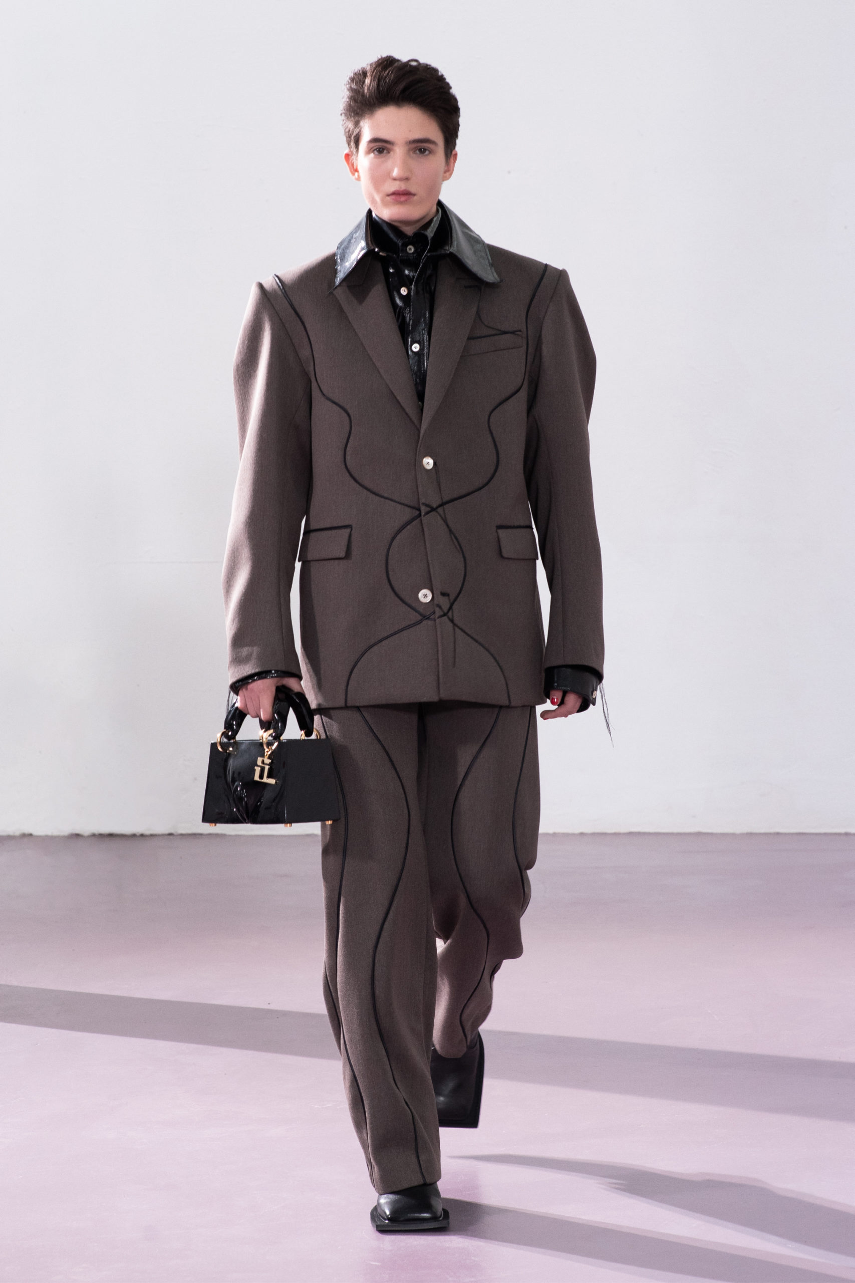 Contrasting the suppleness of velvet and the discomfort of vinyl tells the story of seduction: both romantic and aggressive. The velvety antlers of male deers is the perfect paradigm seen in nature. During mating season the velvet on their antlers shed and they use their antlers to fight for male dominance. The deception of sensuality and violence in nature, as seen in snake trails (a sign of either mating or conflict), translates into the hypnotic, undulating seams in the recurring garments.