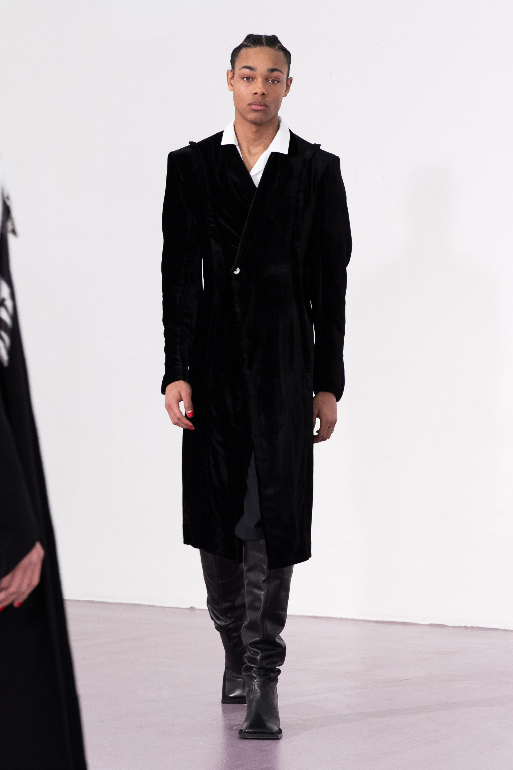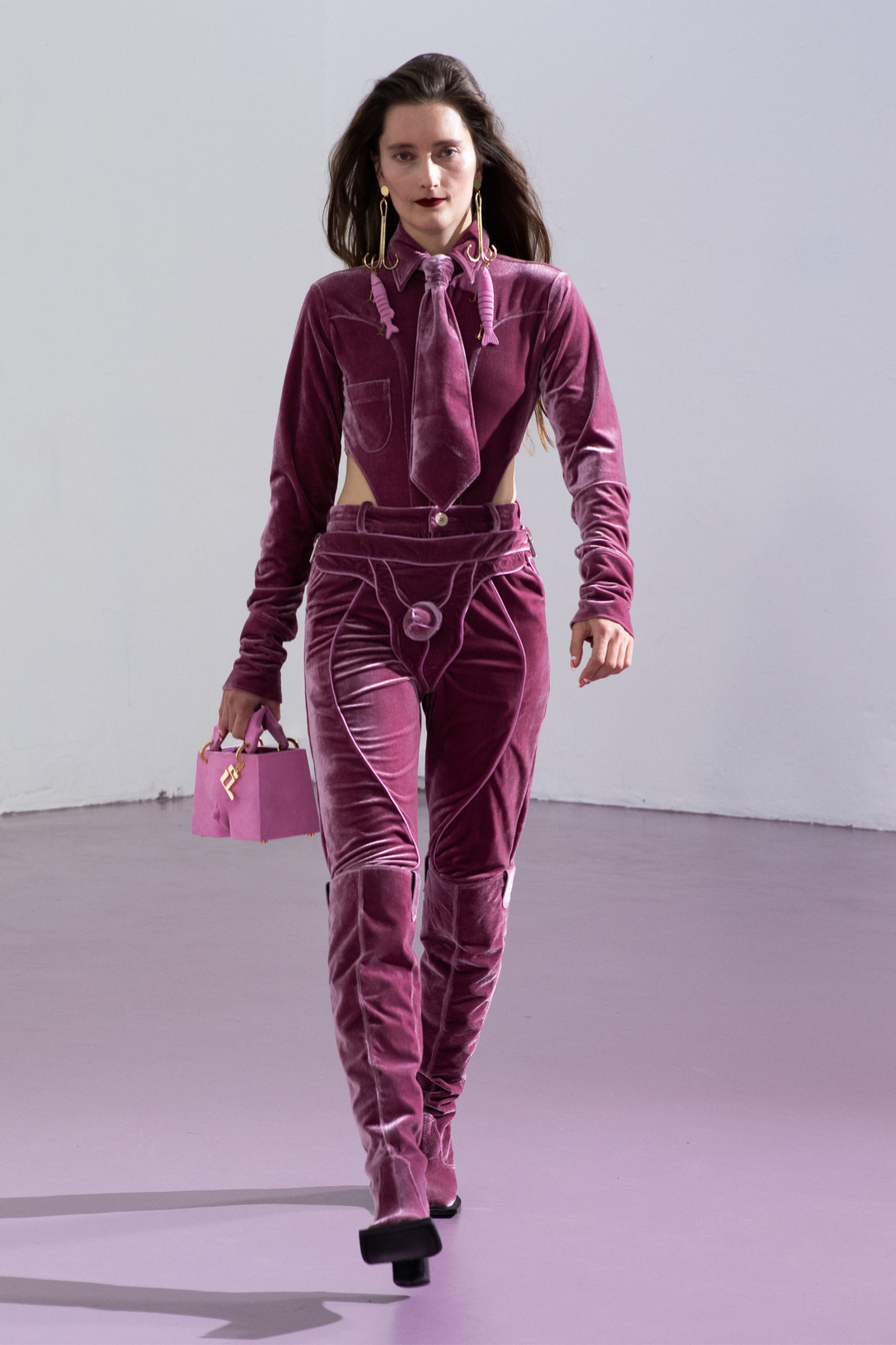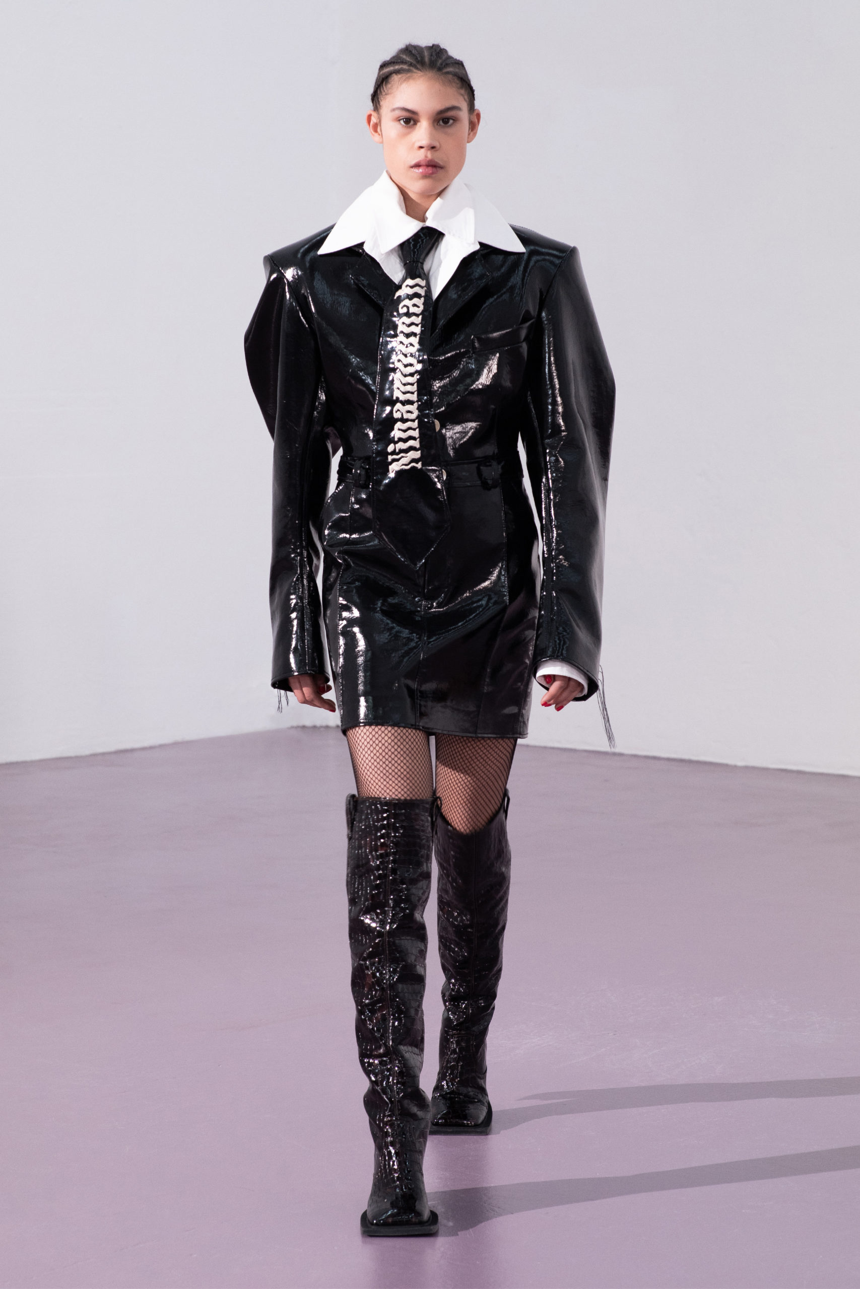 Contrasting the suppleness of velvet and the discomfort of vinyl tells the story of seduction: both romantic and aggressive. The velvety antlers of male deers is the perfect paradigm seen in nature. During mating season the velvet on their antlers shed and they use their antlers to fight for male dominance. The deception of sensuality and violence in nature, as seen in snake trails (a sign of either mating or conflict), translates into the hypnotic, undulating seams in the recurring garments.