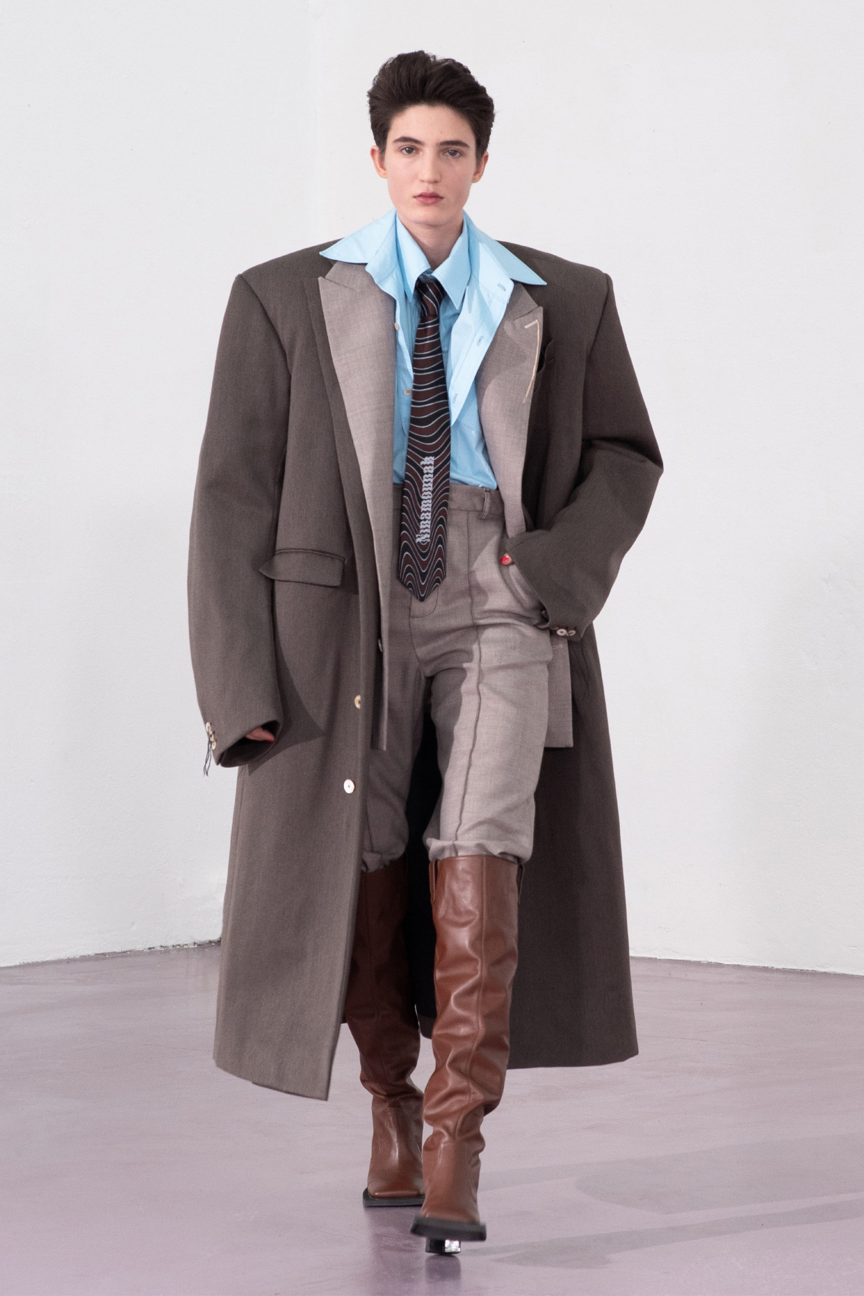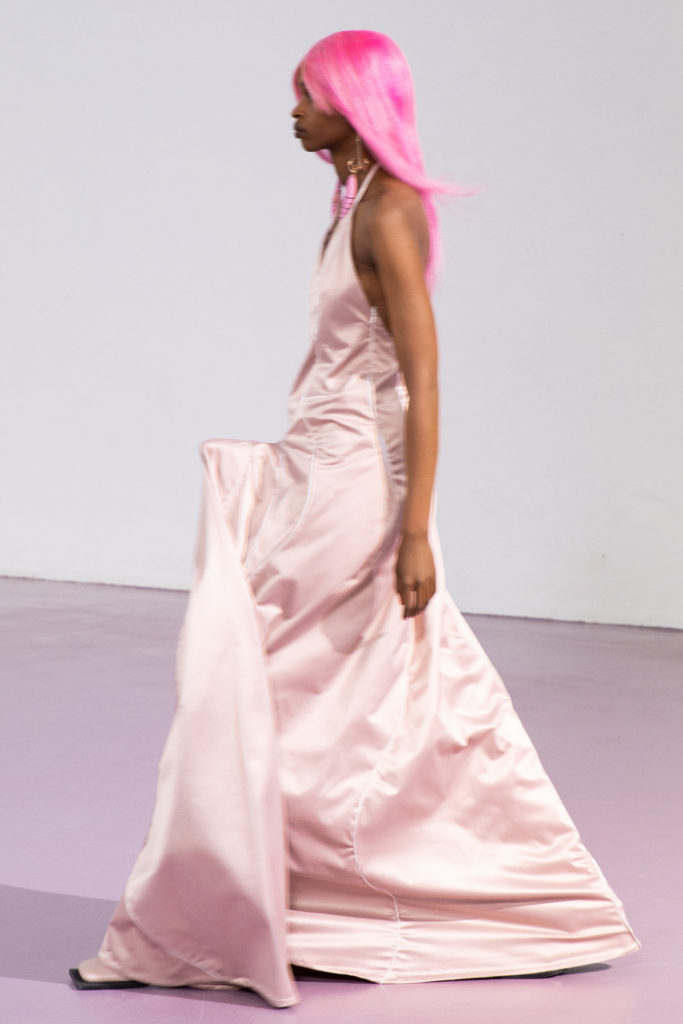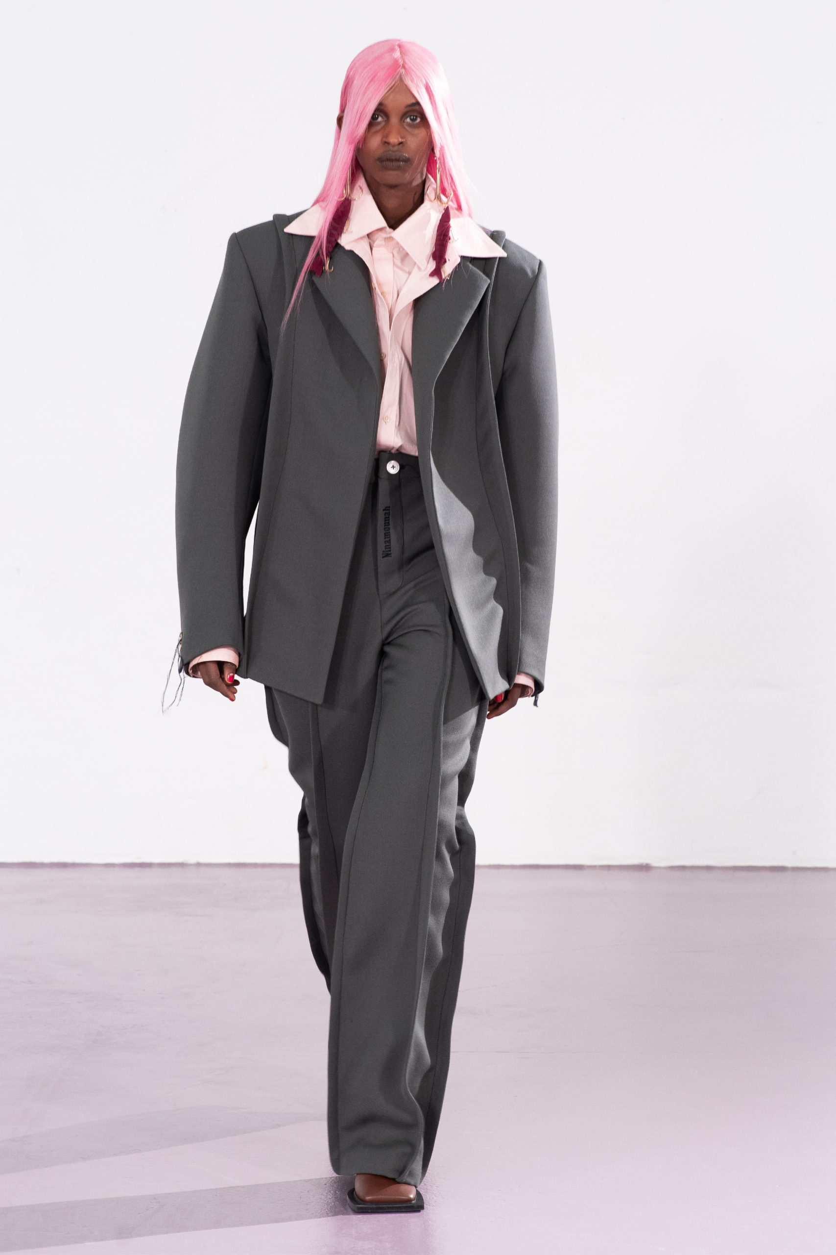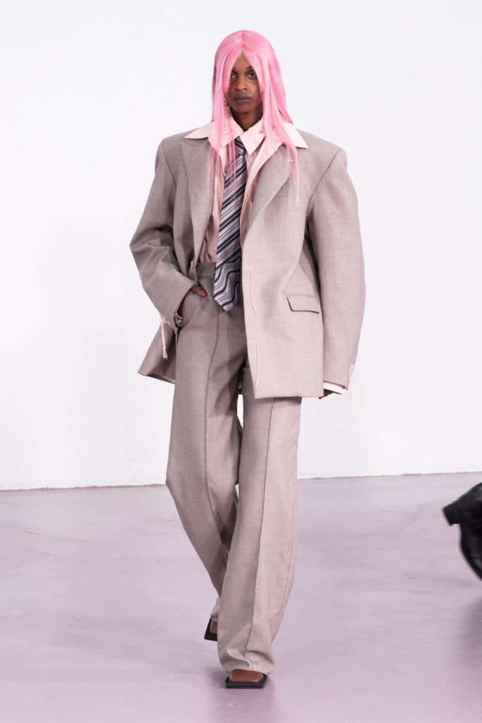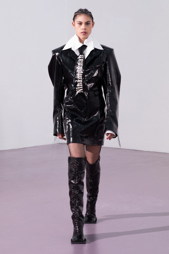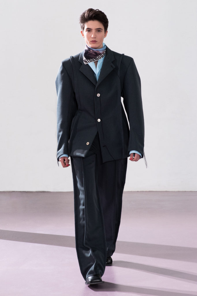 Exaggerated cuts and oversized tailoring takes inspiration from the sexual mimicry of the animal kingdom. The defense mechanism of certain species protecting themselves from more dominant individuals is parallel to the human experience of wearing garments as armor.