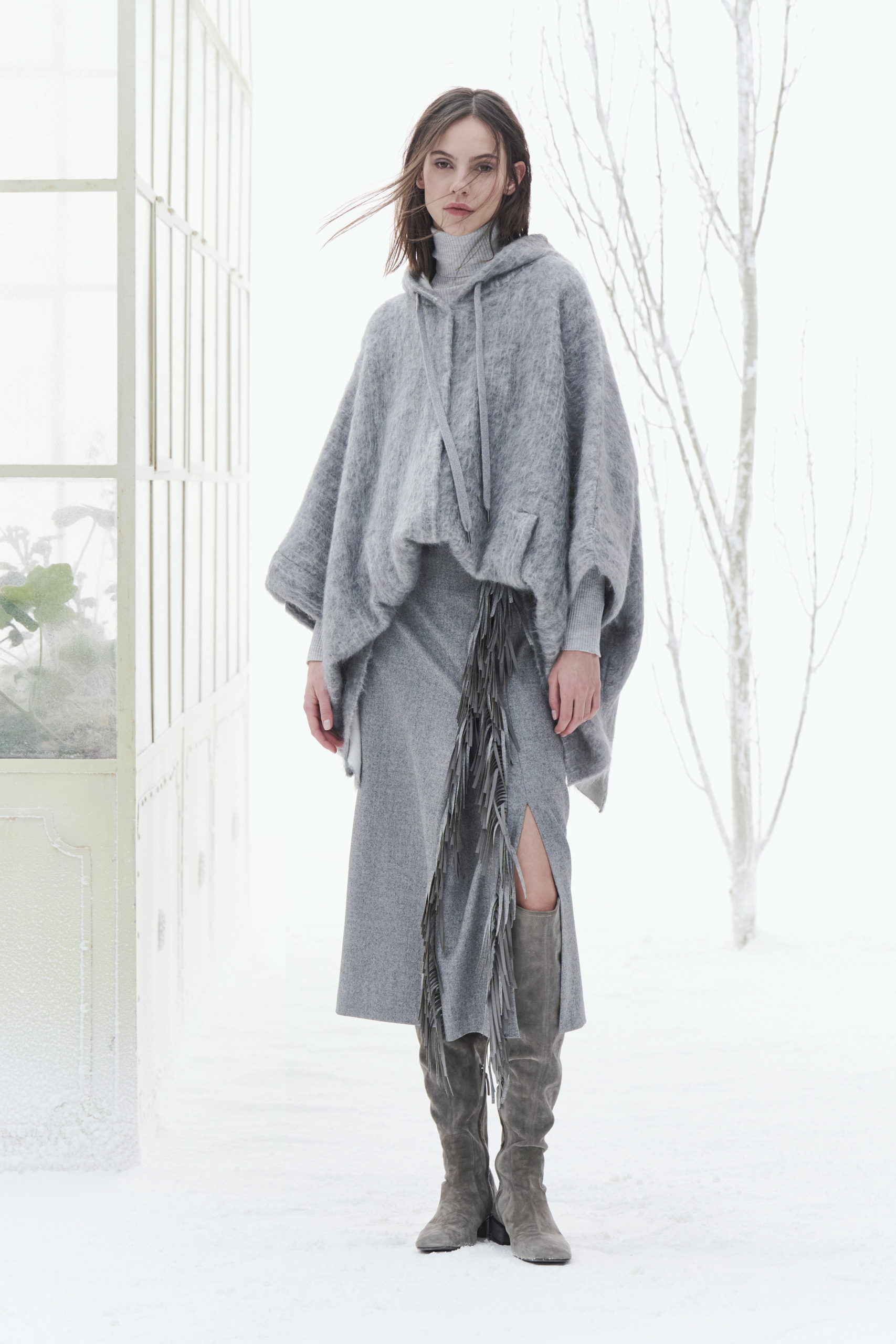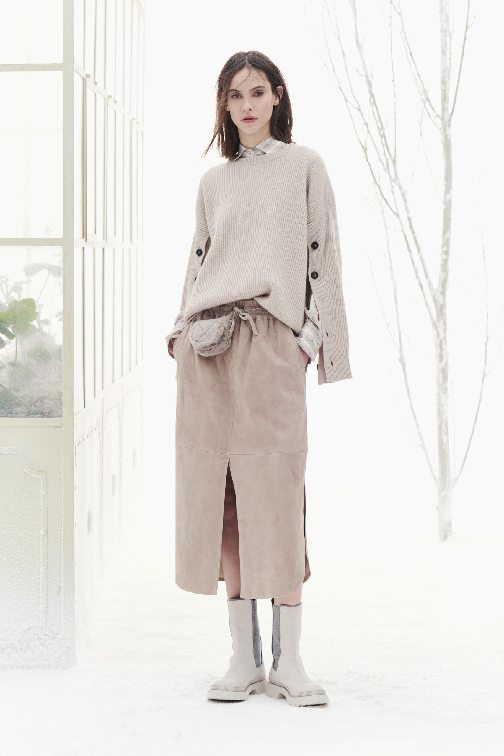Même les jupes proposent une interprétation transversale et polyvalente, qui accompagne les différents moments de la journée. Les lignes midi, à colonna, minimalistes sont caractérisées par des fentes généreuses et féminines ou soulignées par des interventions à effet tridimensionnel, fruit de travaux artisanaux ou sophistiqués. Les jupes aux volumes souples et à plis, en flanelle, organza ou tulle, sont mises en valeur par des broderies en mohair, inspirées des rayures des couvertures des tapis de selle au goût anglais, qui associent rustique et raffinement.
