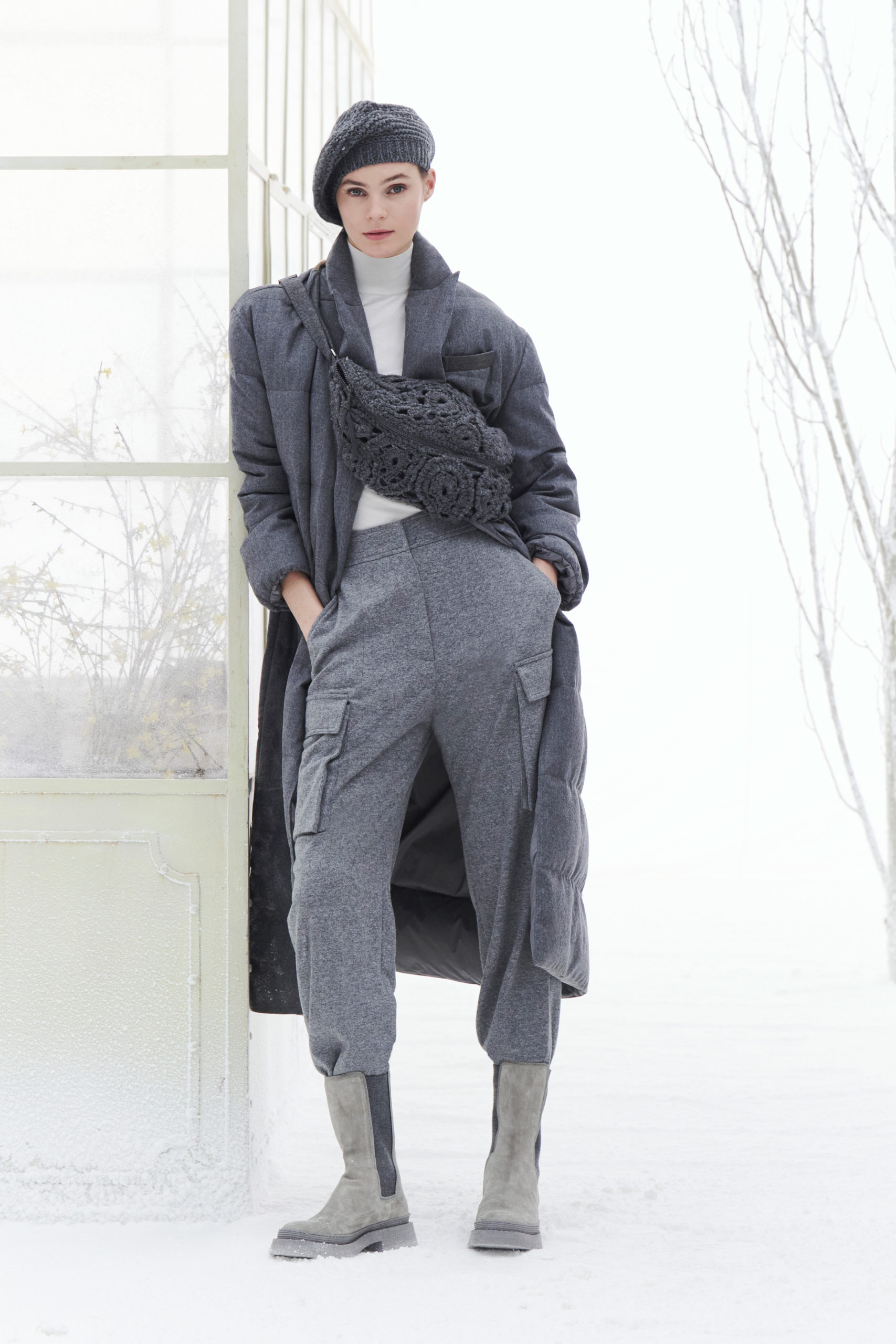 Les textures des amples et enveloppants manteaux deviennent tactiles alors que les vêtements d’extérieur de style sportif s’enrichissent du charme des tissus précieux et nobles. Avec les réinterprétations très douces en maille, prévalent les qualités des fibres naturelles, exprimées par les tissus doubles, les effets brossés et les pièces confortables en cachemire.