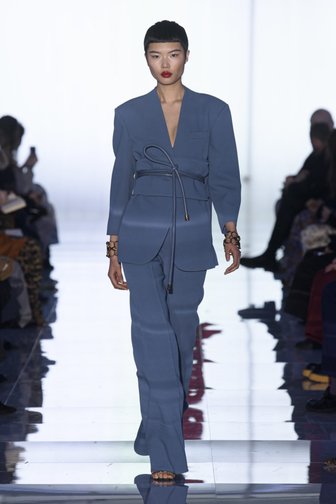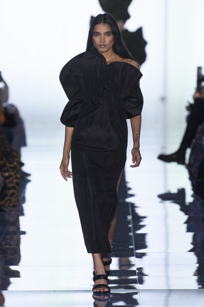 The state of matter changes from firm to airy, from matte to shiny as colors glide from bright to poisonous to black, and shapes evolve from sculptural to liquid. Tailoring is sharp and monochromatic. Dresses fall straight, drape, curve.