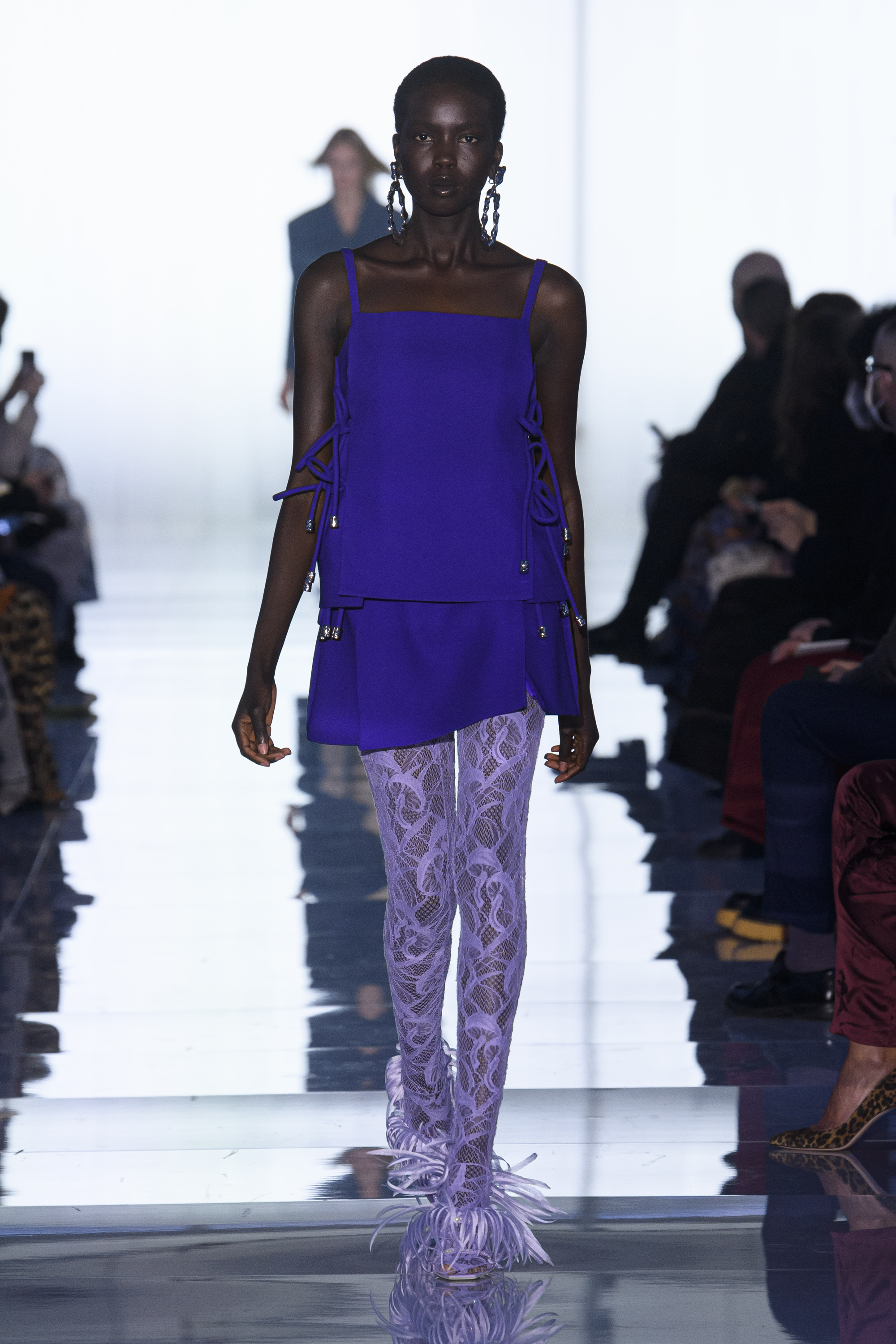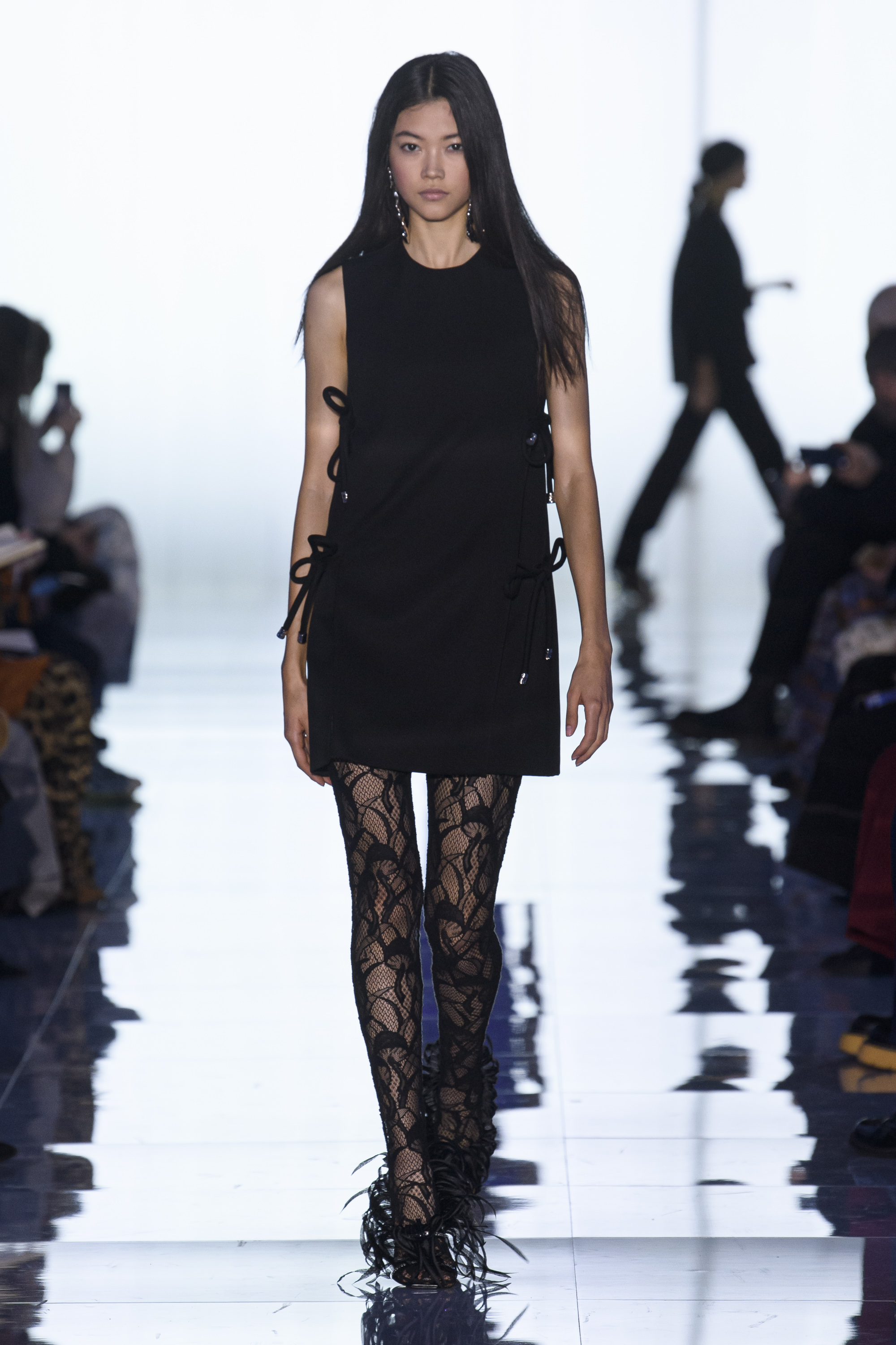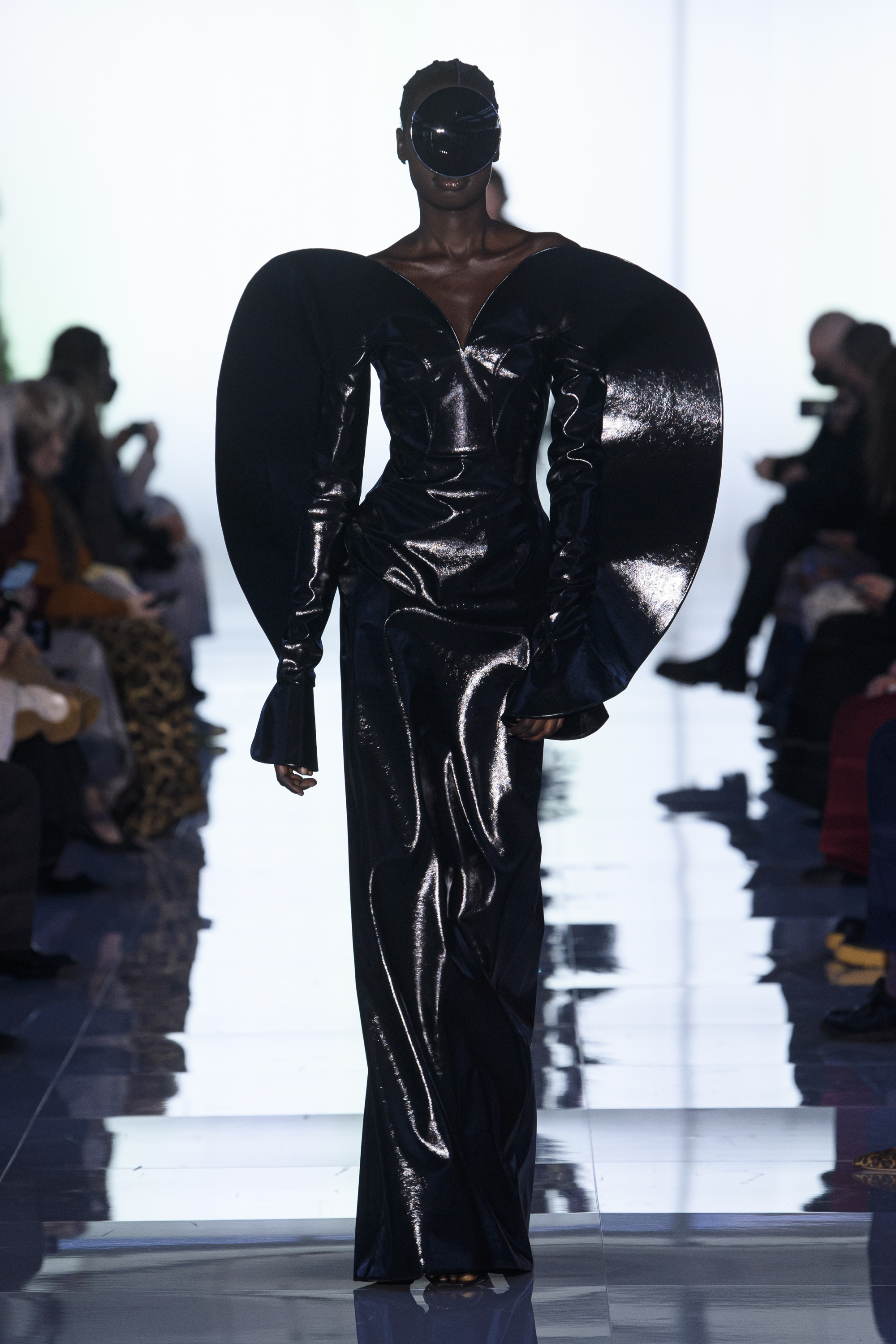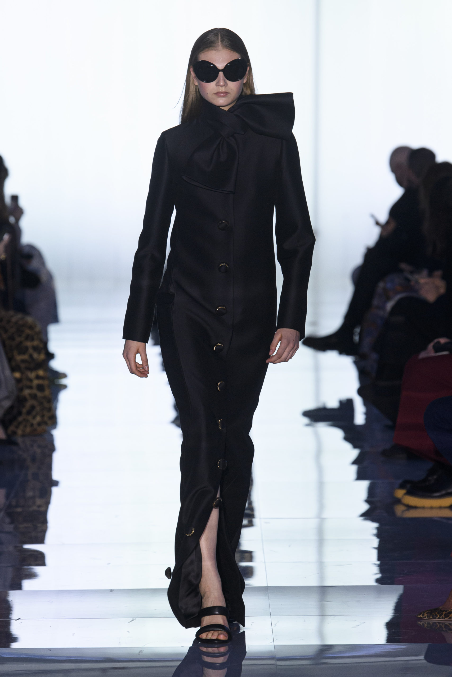The state of matter changes from firm to airy, from matte to shiny as colors glide from bright to poisonous to black, and shapes evolve from sculptural to liquid. Tailoring is sharp and monochromatic. Dresses fall straight, drape, curve.