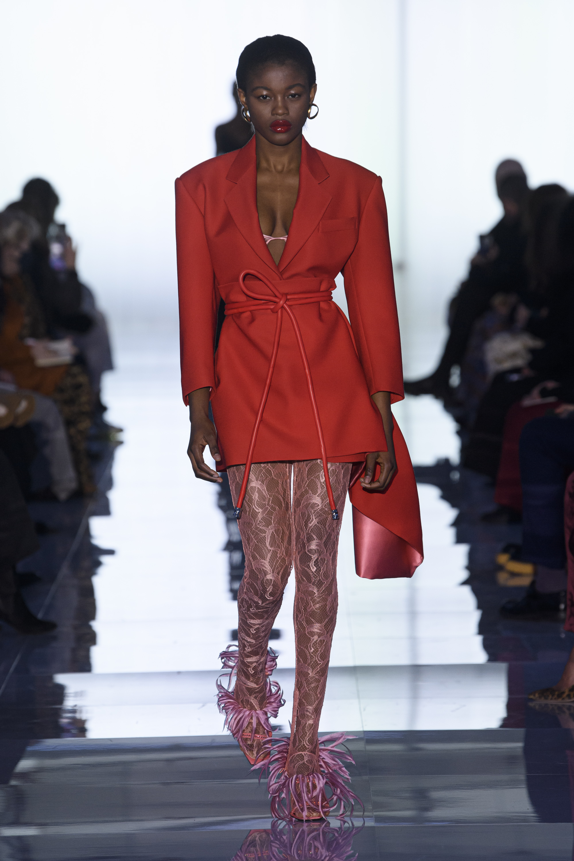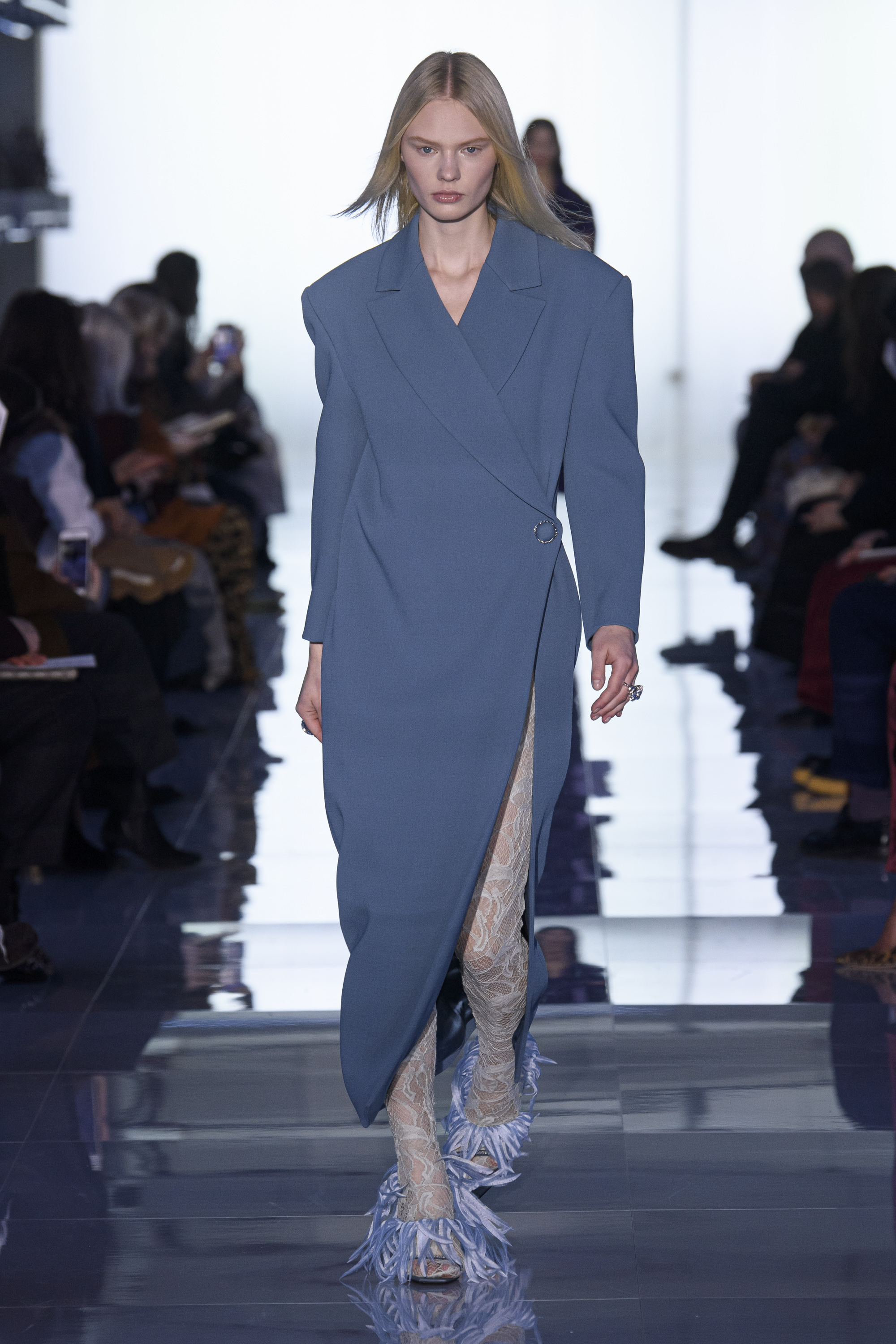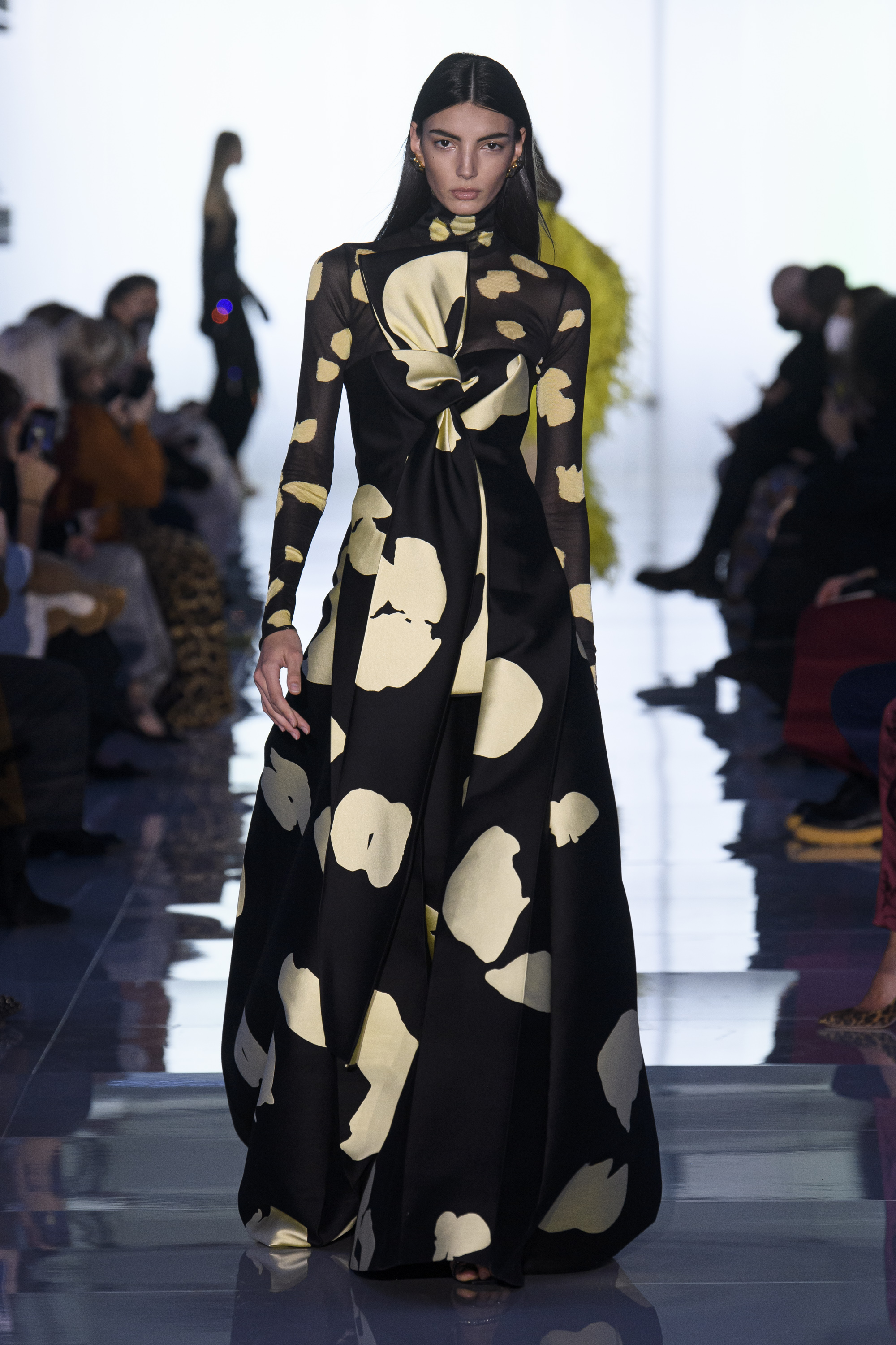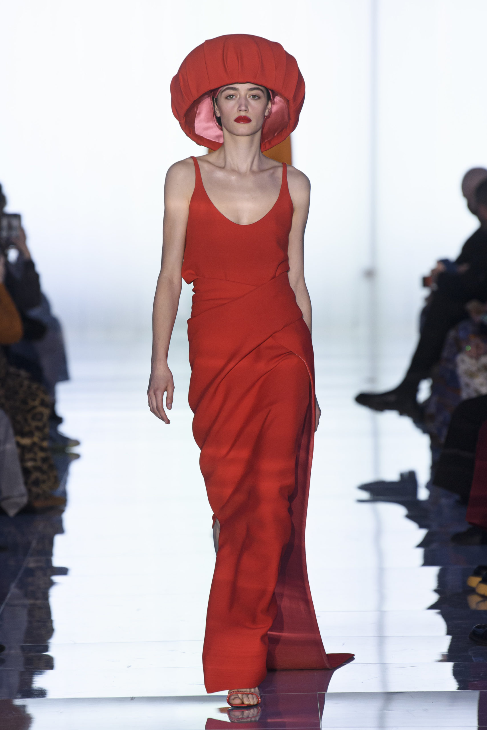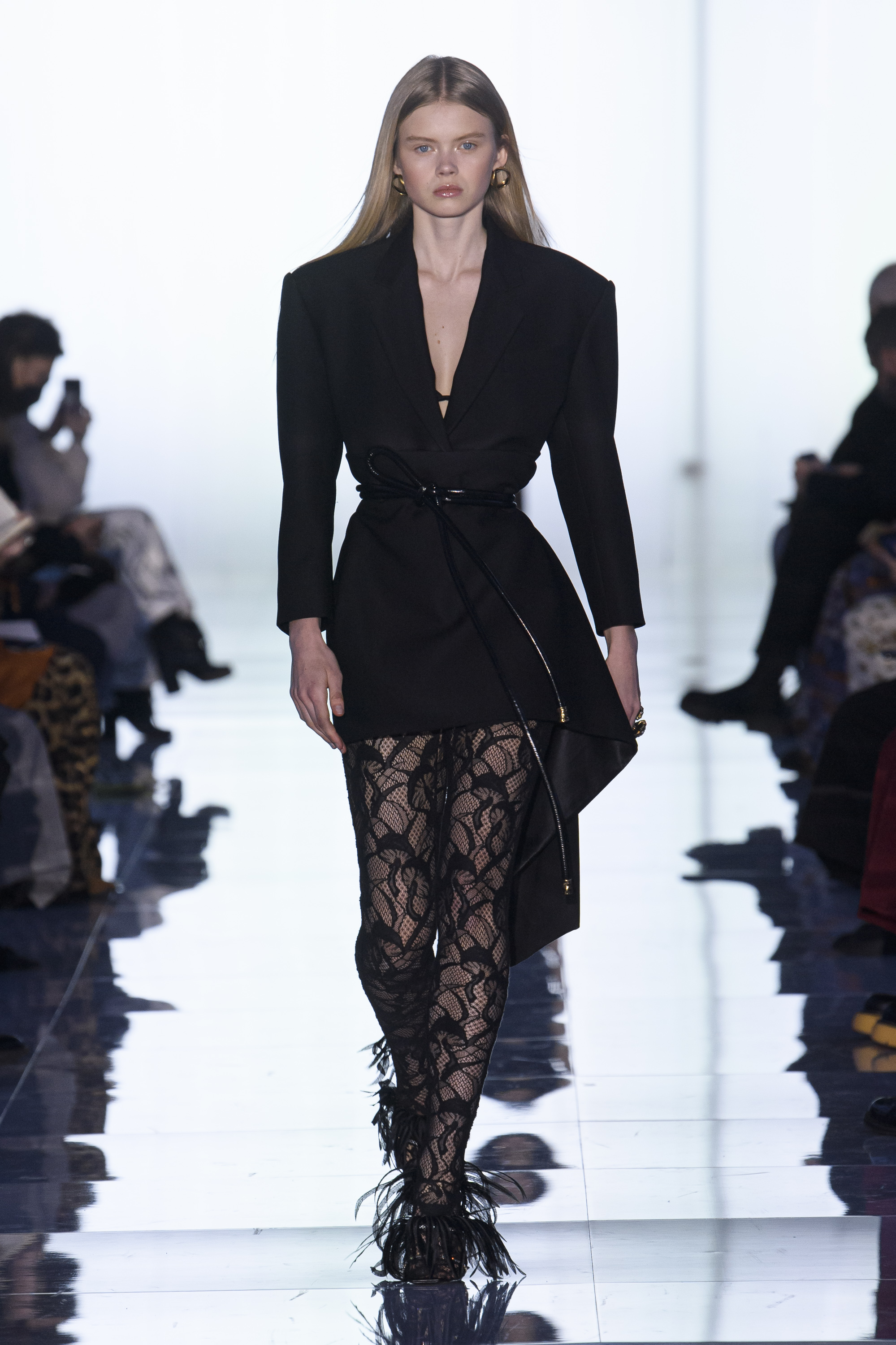 The state of matter changes from firm to airy, from matte to shiny as colors glide from bright to poisonous to black, and shapes evolve from sculptural to liquid. Tailoring is sharp and monochromatic. Dresses fall straight, drape, curve.