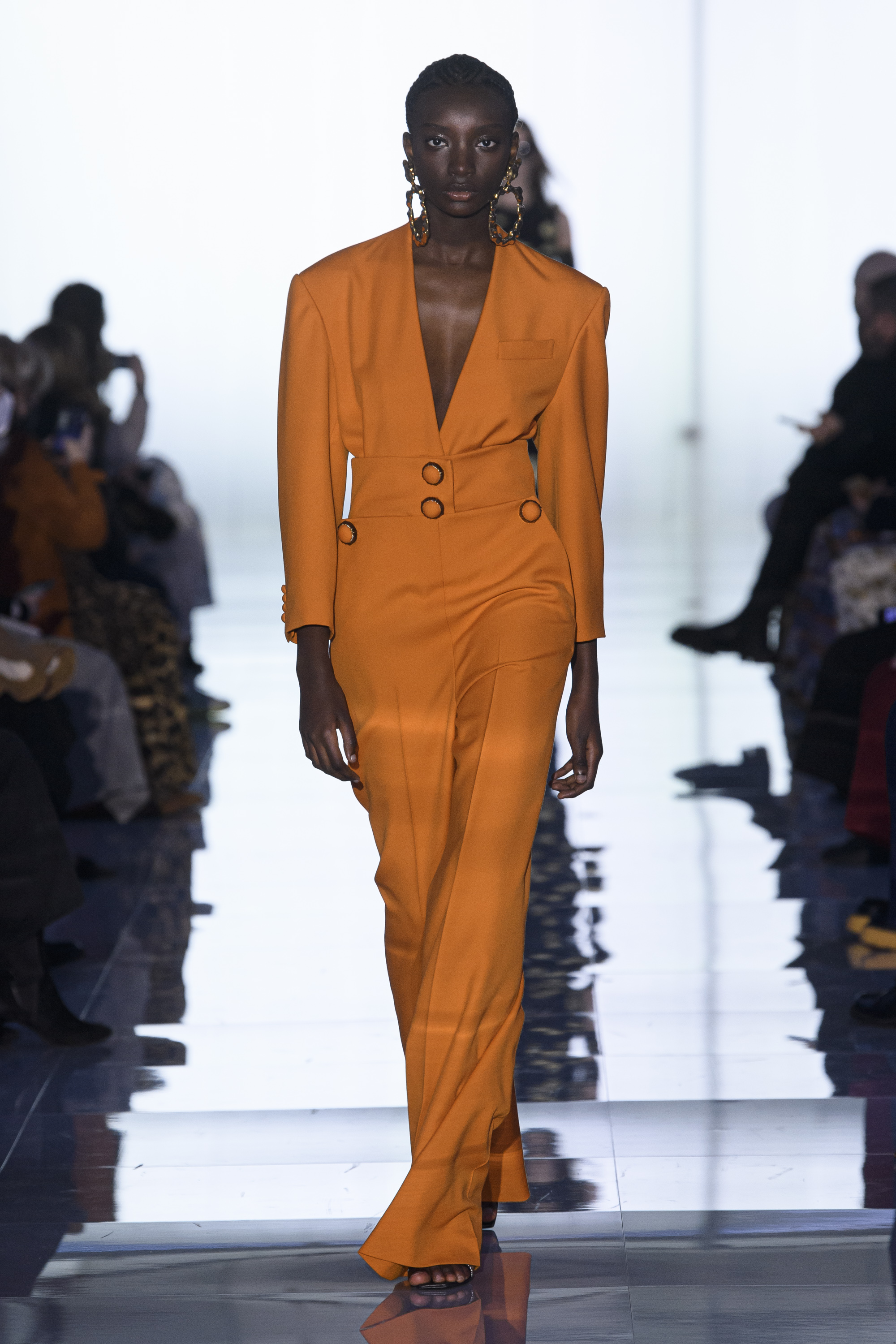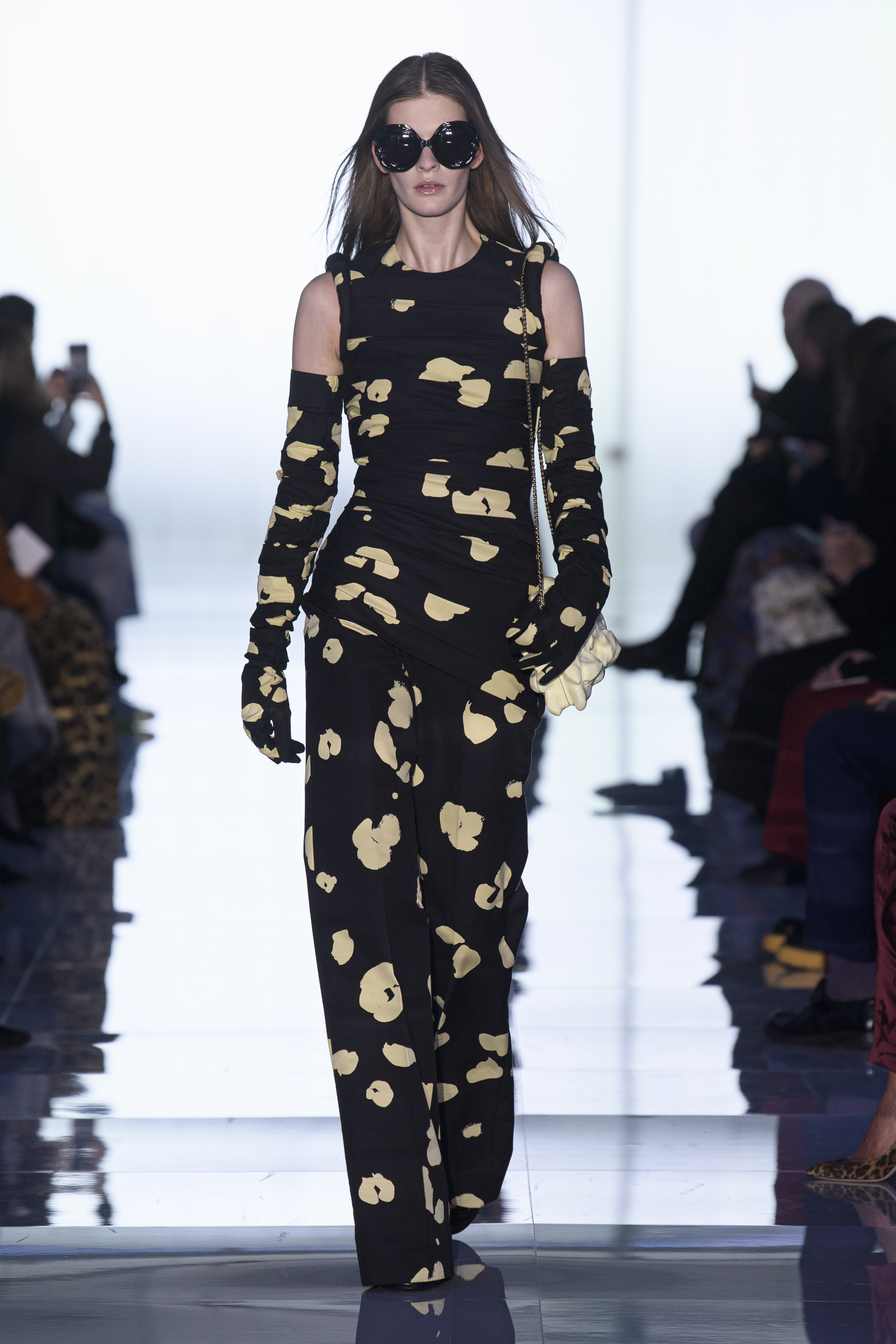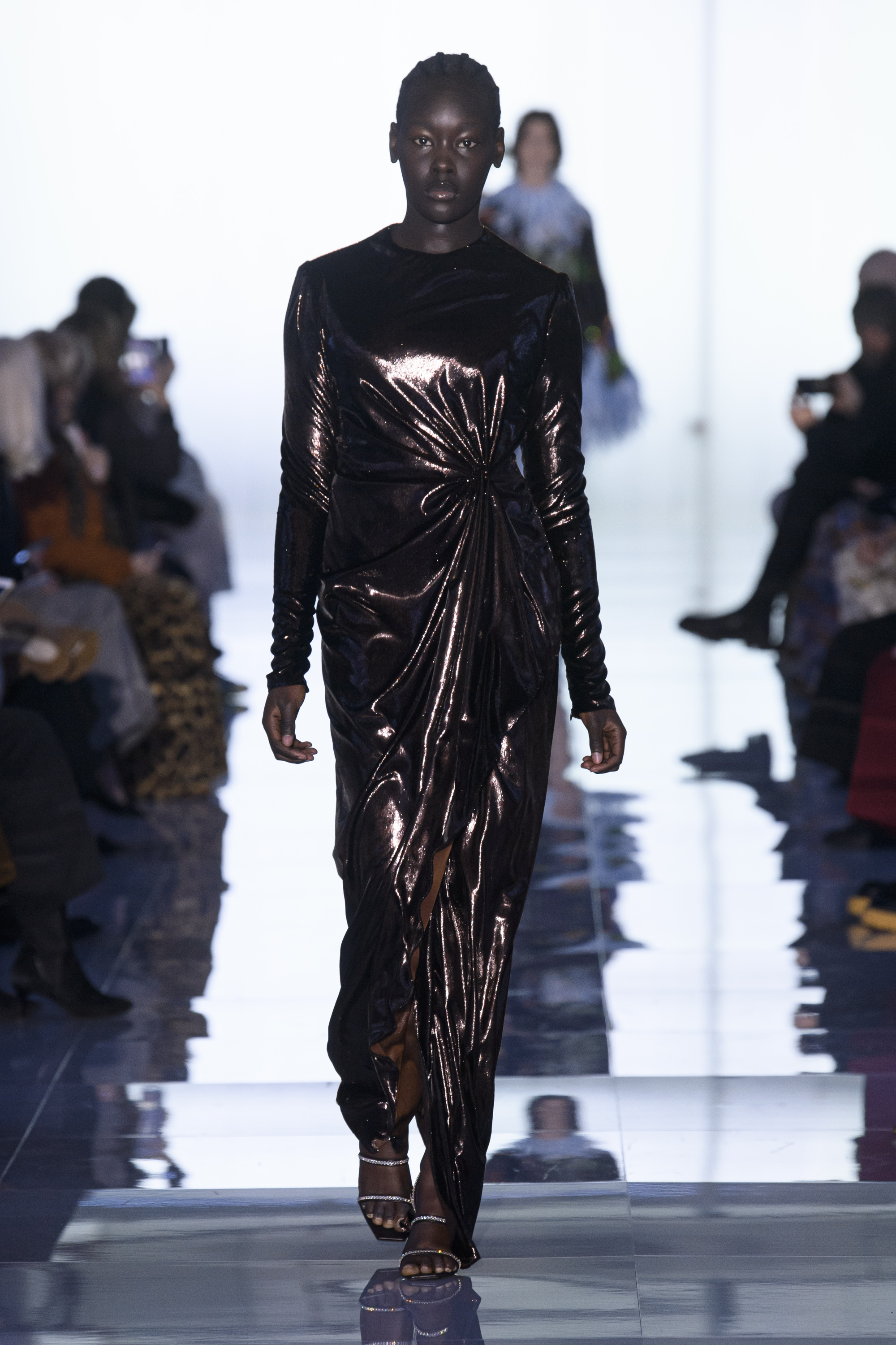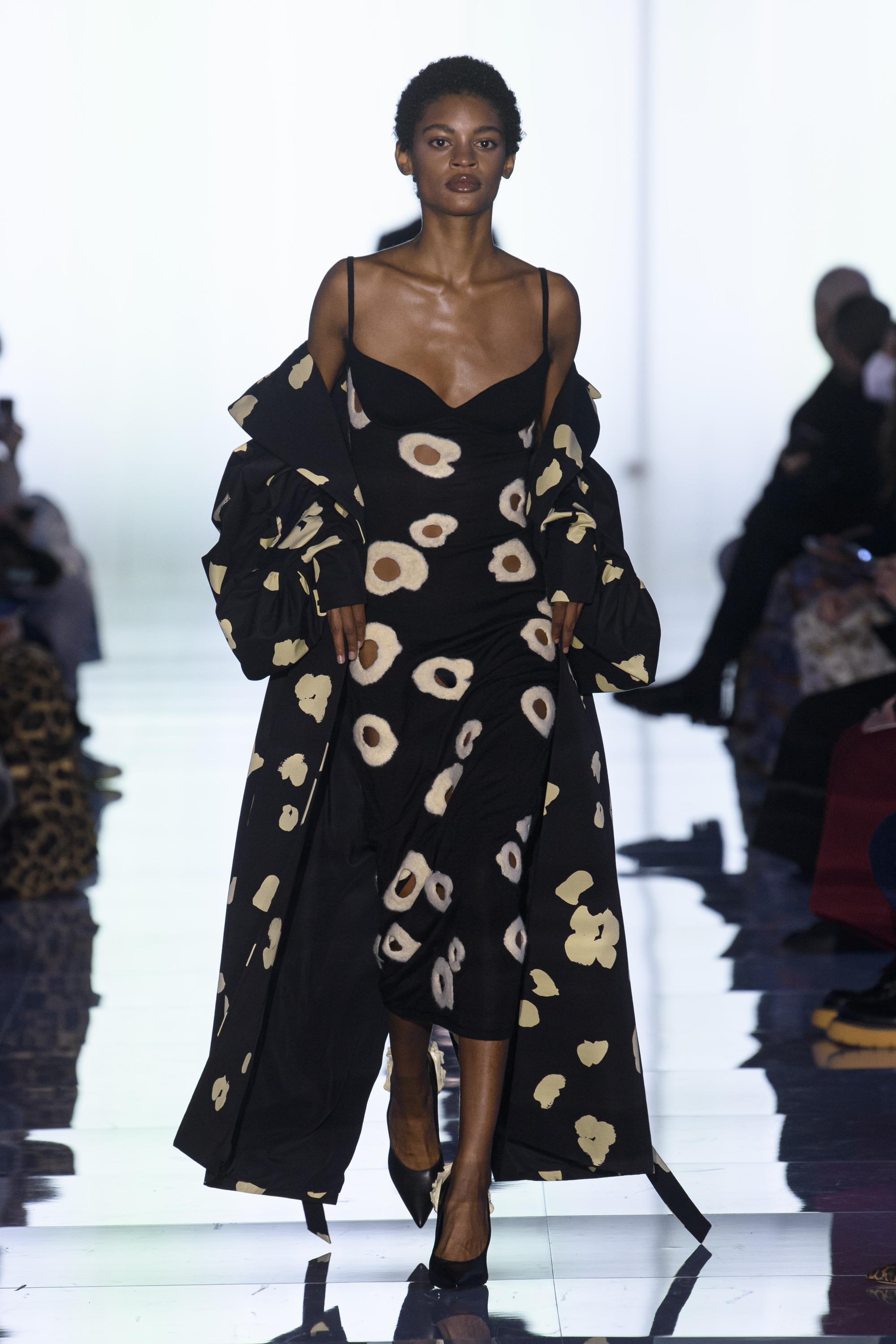 The state of matter changes from firm to airy, from matte to shiny as colors glide from bright to poisonous to black, and shapes evolve from sculptural to liquid. Tailoring is sharp and monochromatic. Dresses fall straight, drape, curve.