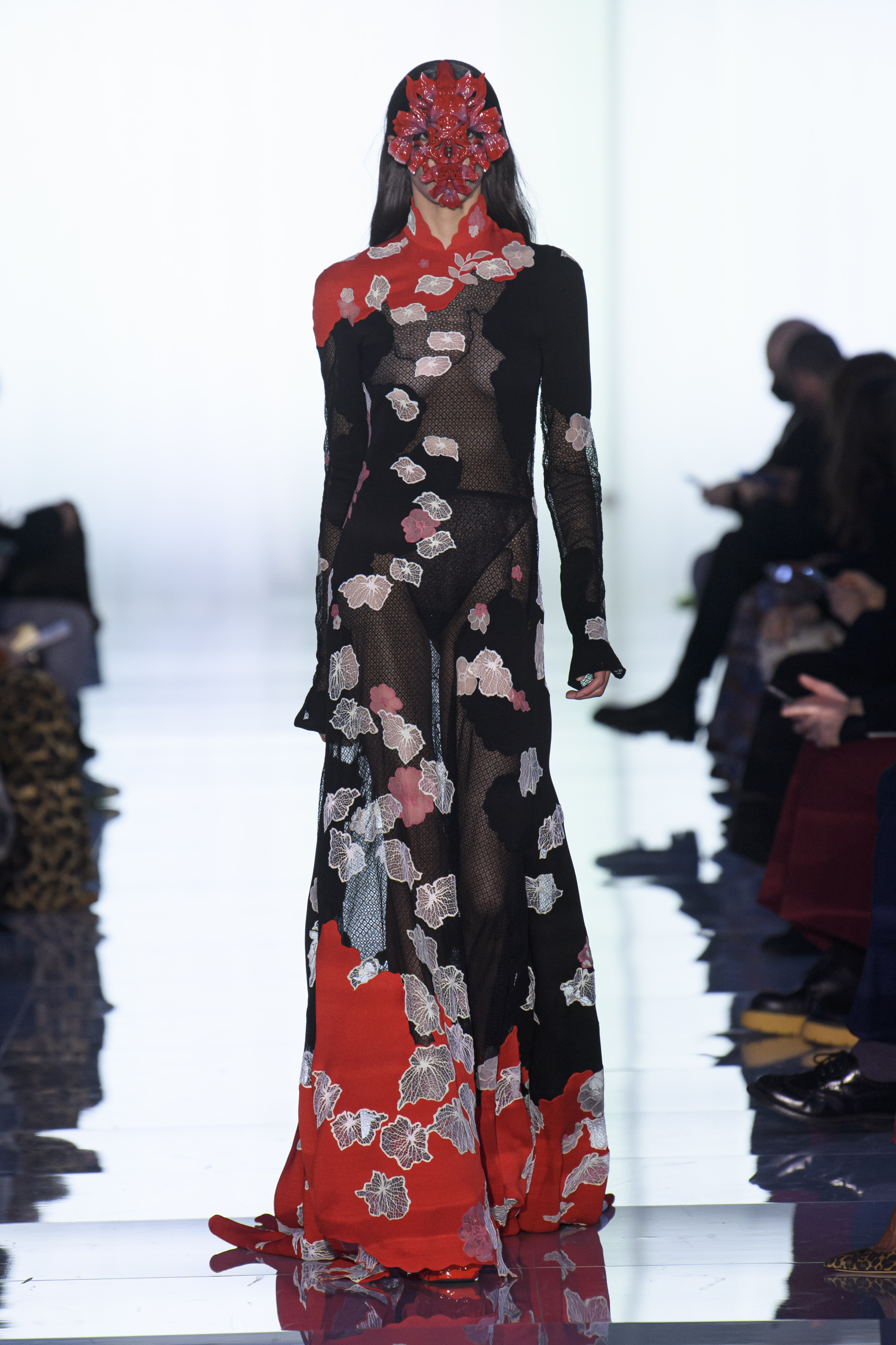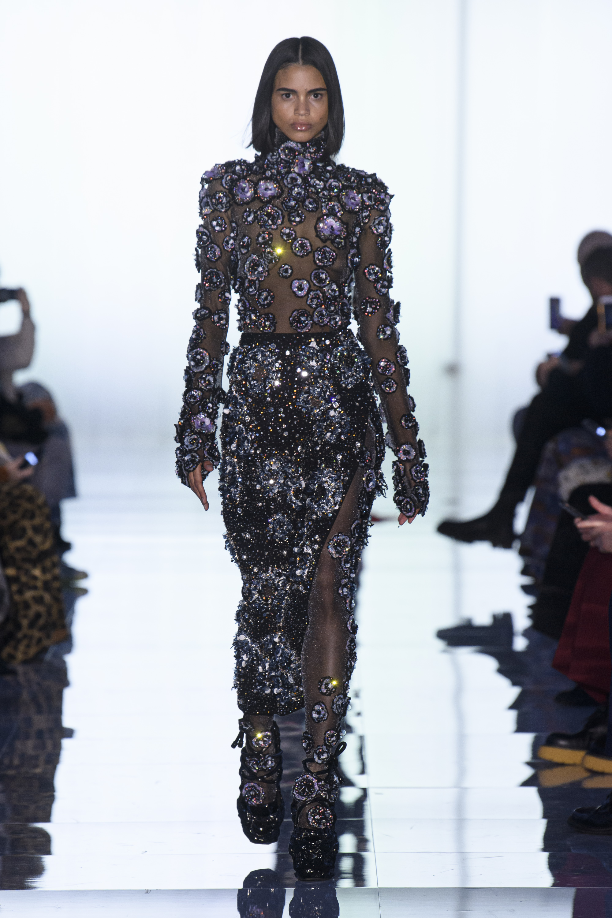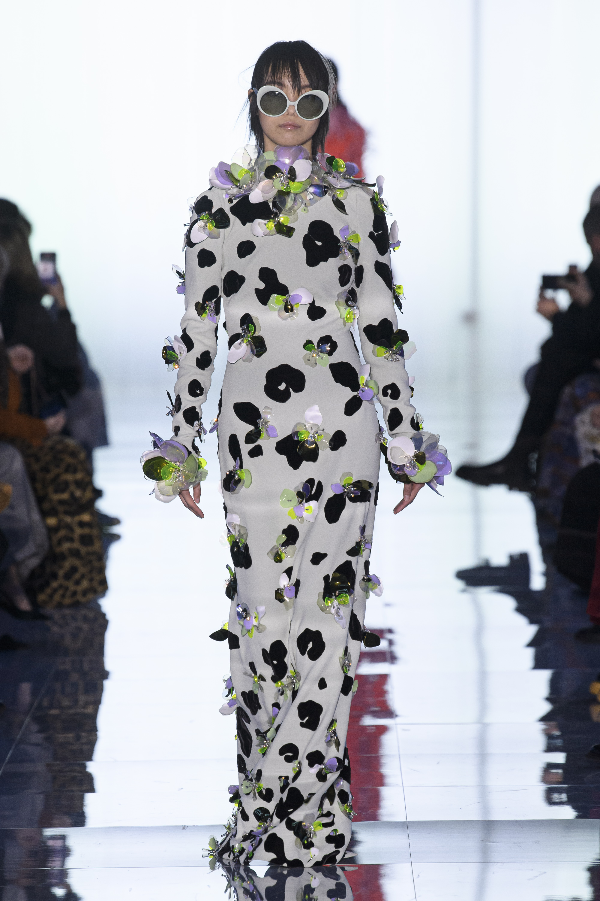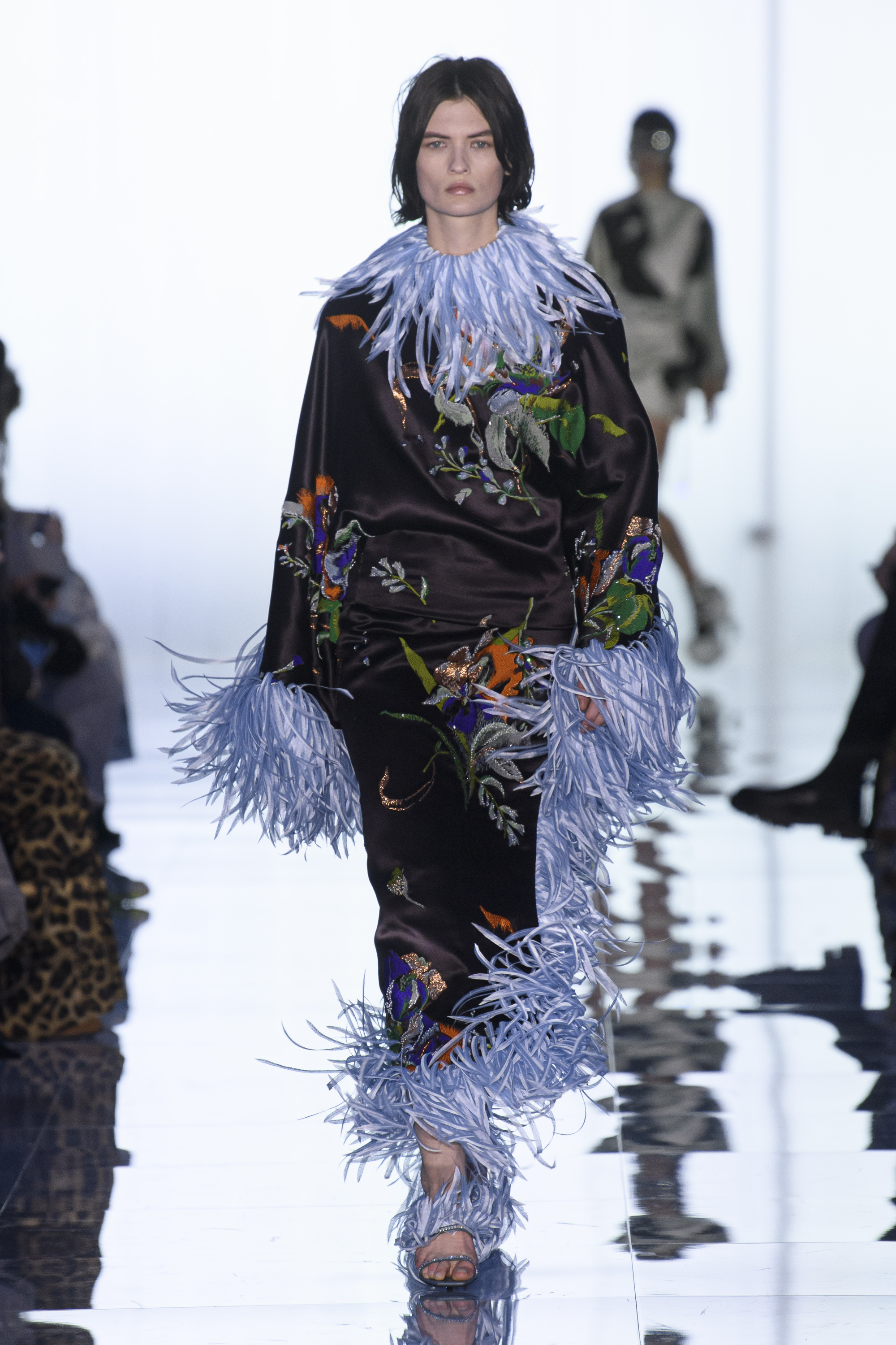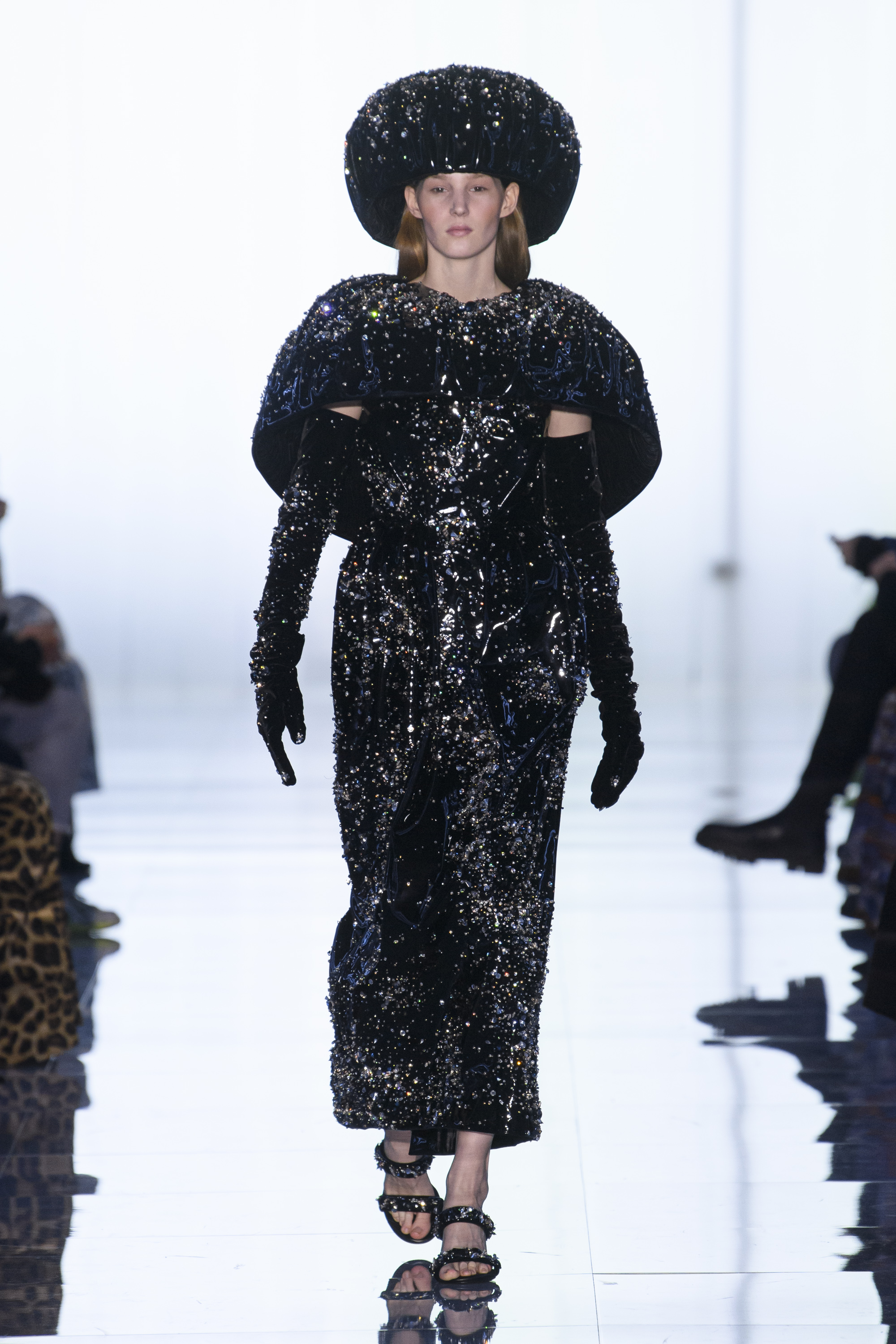 Mutations take place. Pleating grows like mushrooms on the bark of a tree or gigantic leaves. Sleeves get an acrylic shine. Feathers sprout along the edges of voluminous coats and on shoes like antennae. Flowers bloom all over like bacteria. Crystals multiply like dew drops.