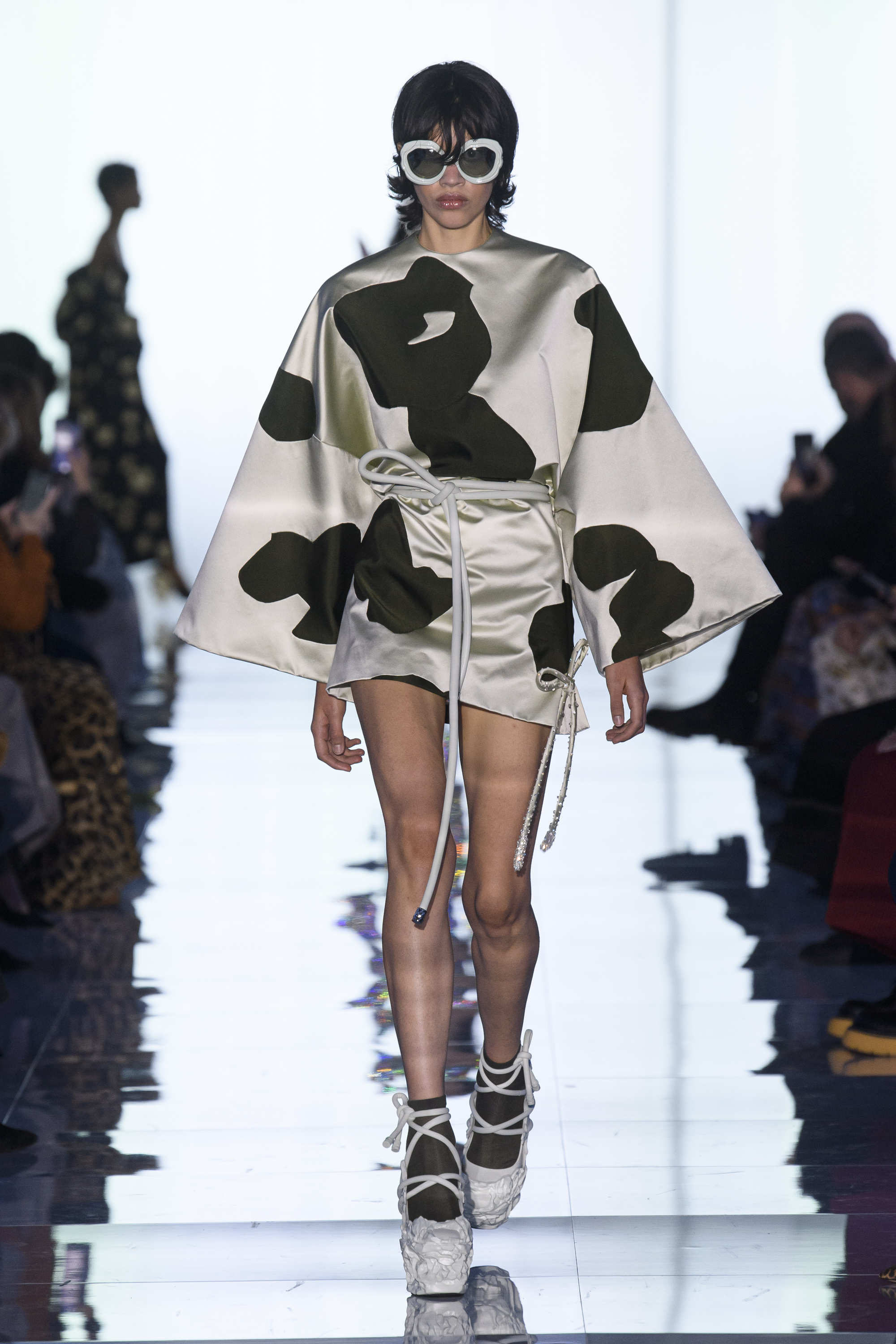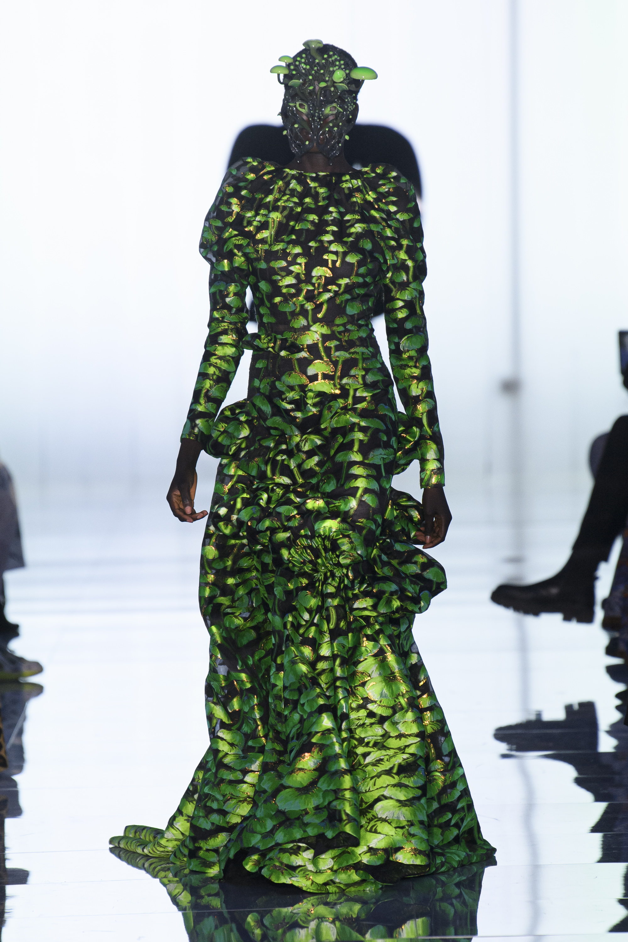 A morphing of realms transpires. The natural and the artificial collide in linings and heels as dense as fungi crowns, delicate embroidery as tufts of mold, glasses as organic shields.