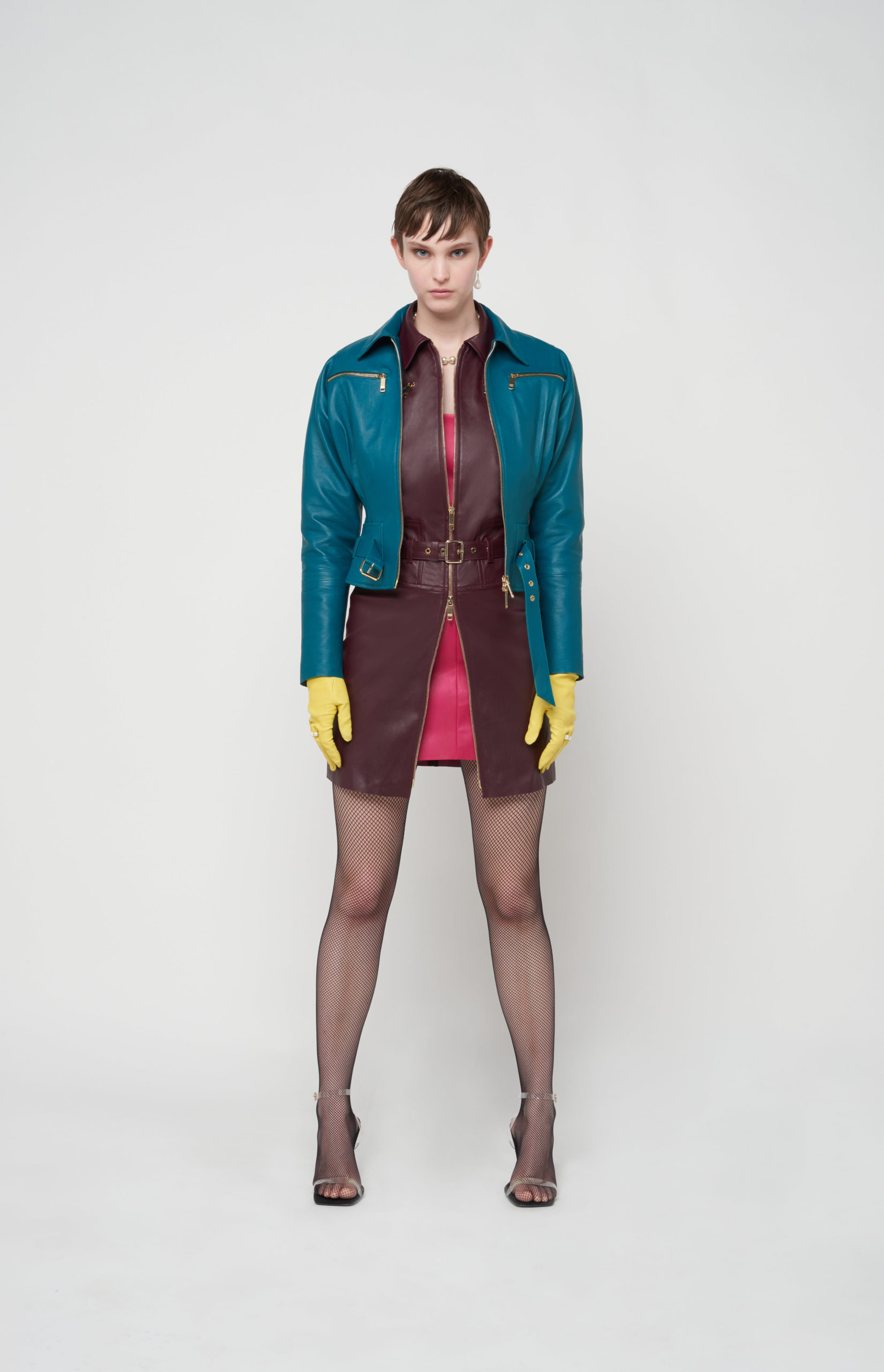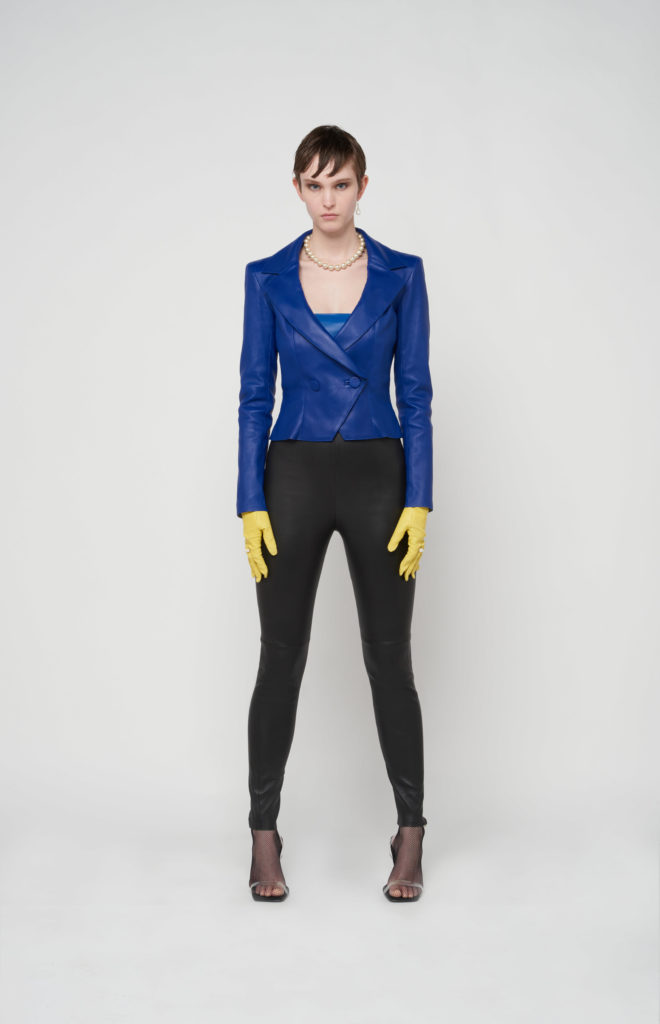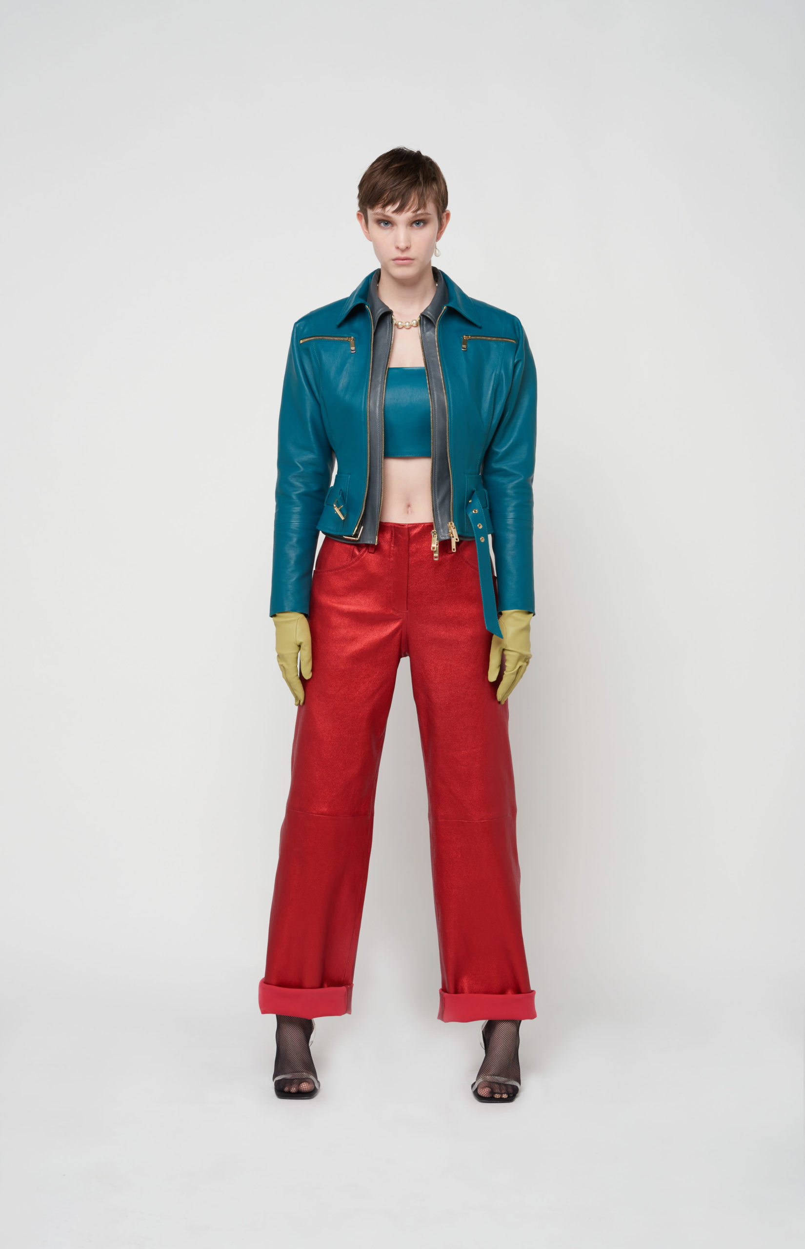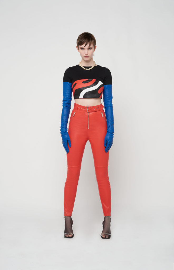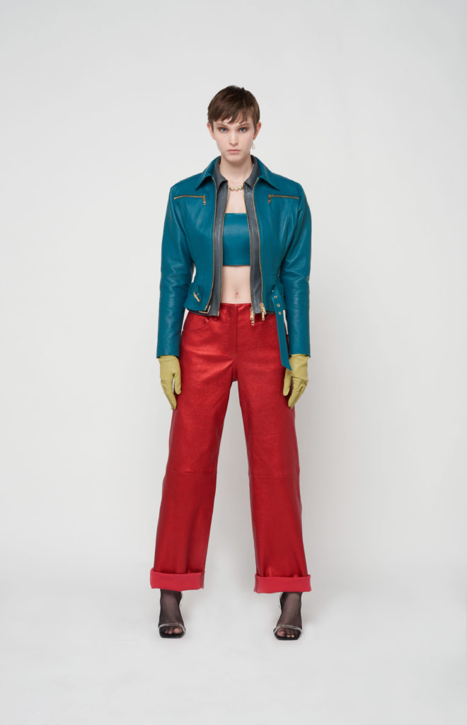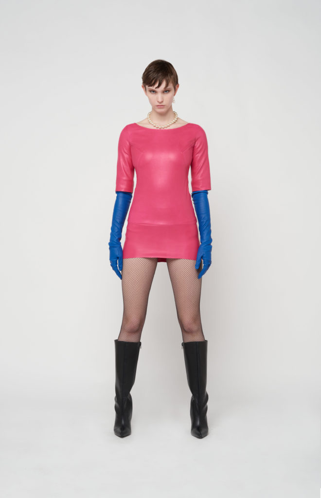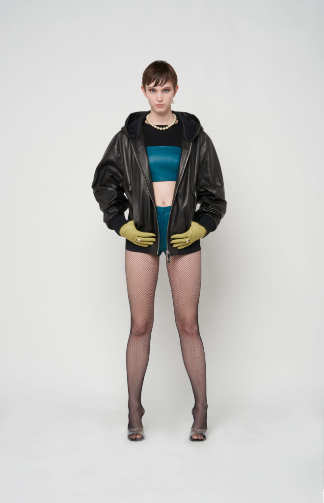 telles des sous-vêtements, bandeaux et micros-shorts en cuir stretch d’une palette de couleurs