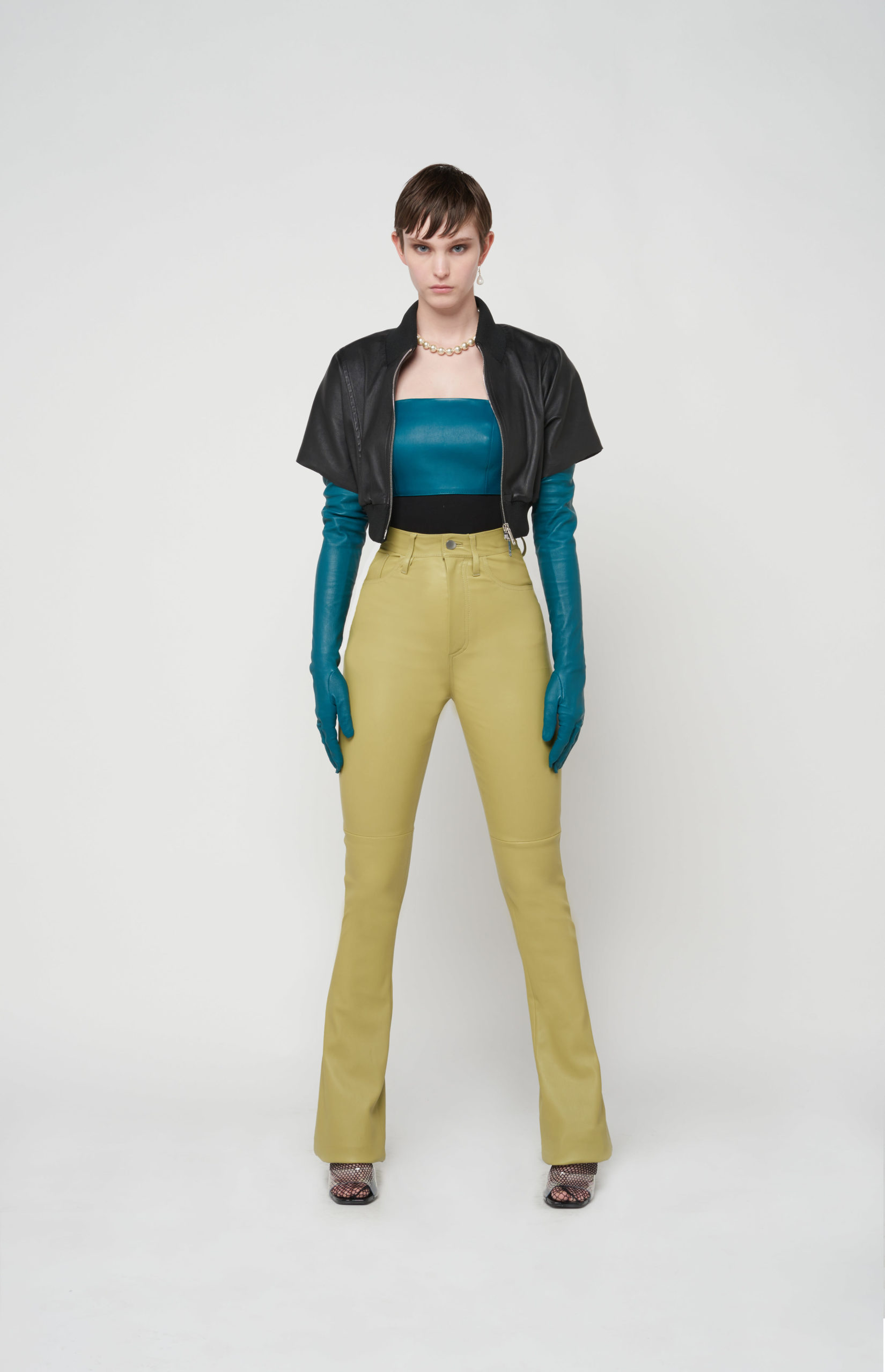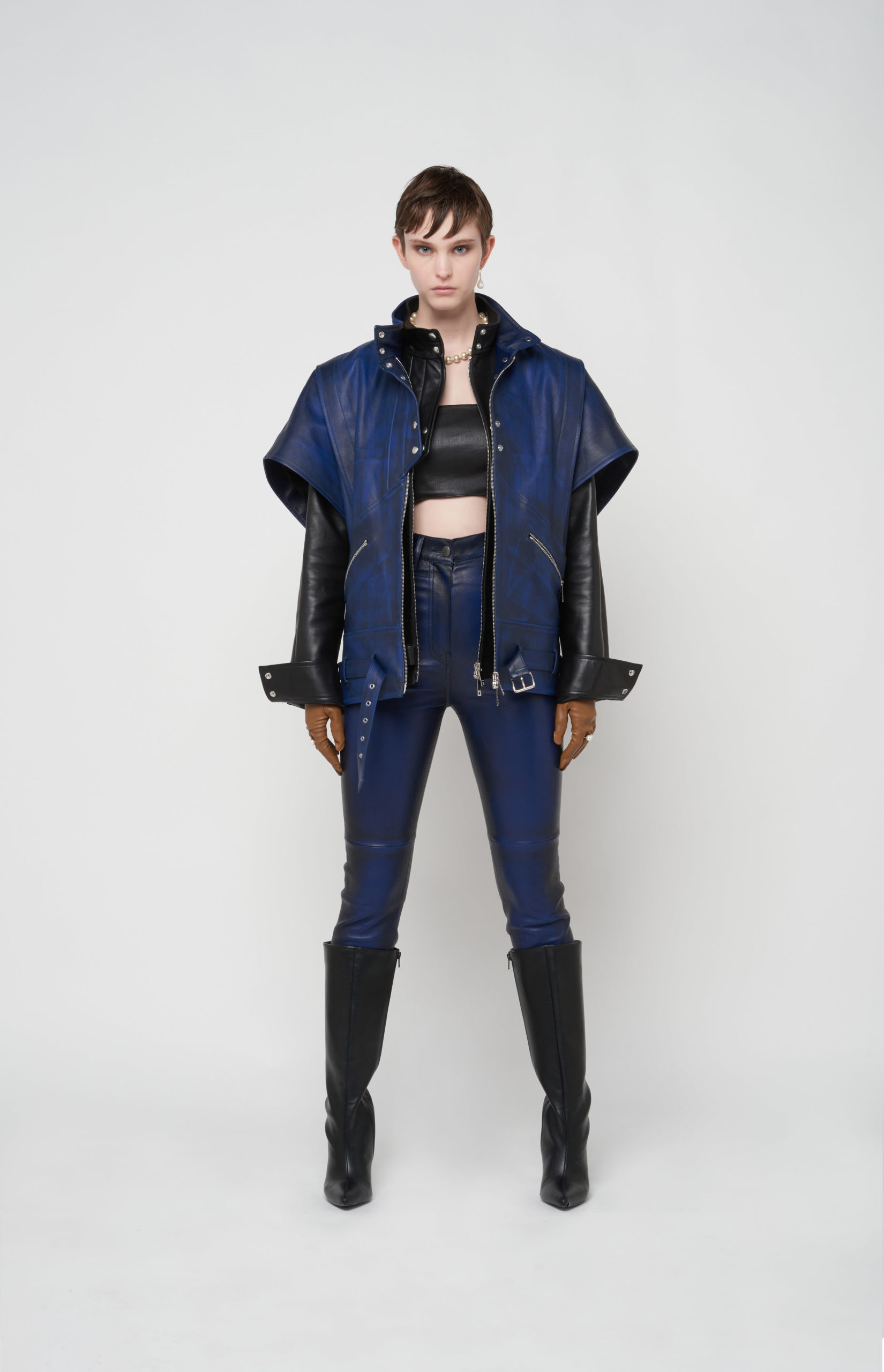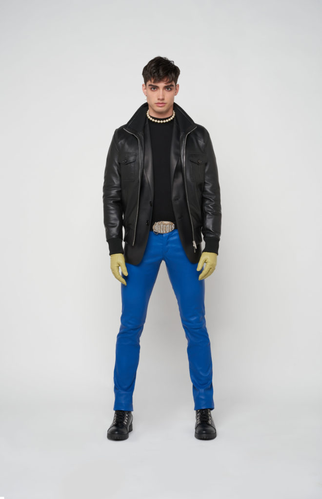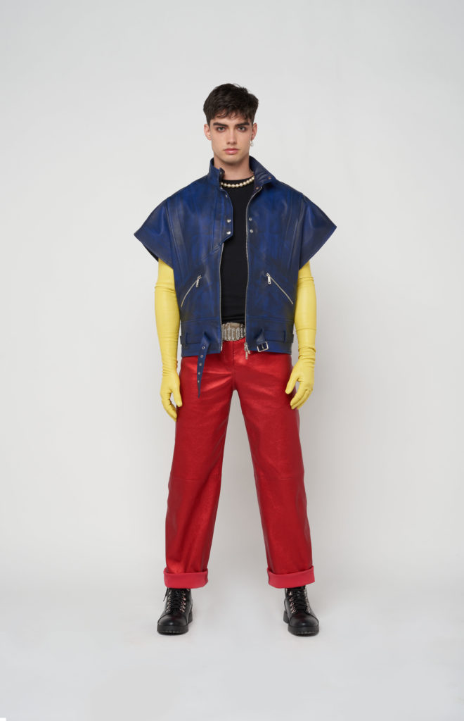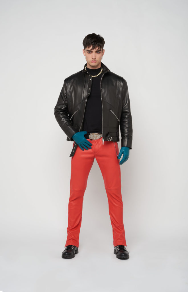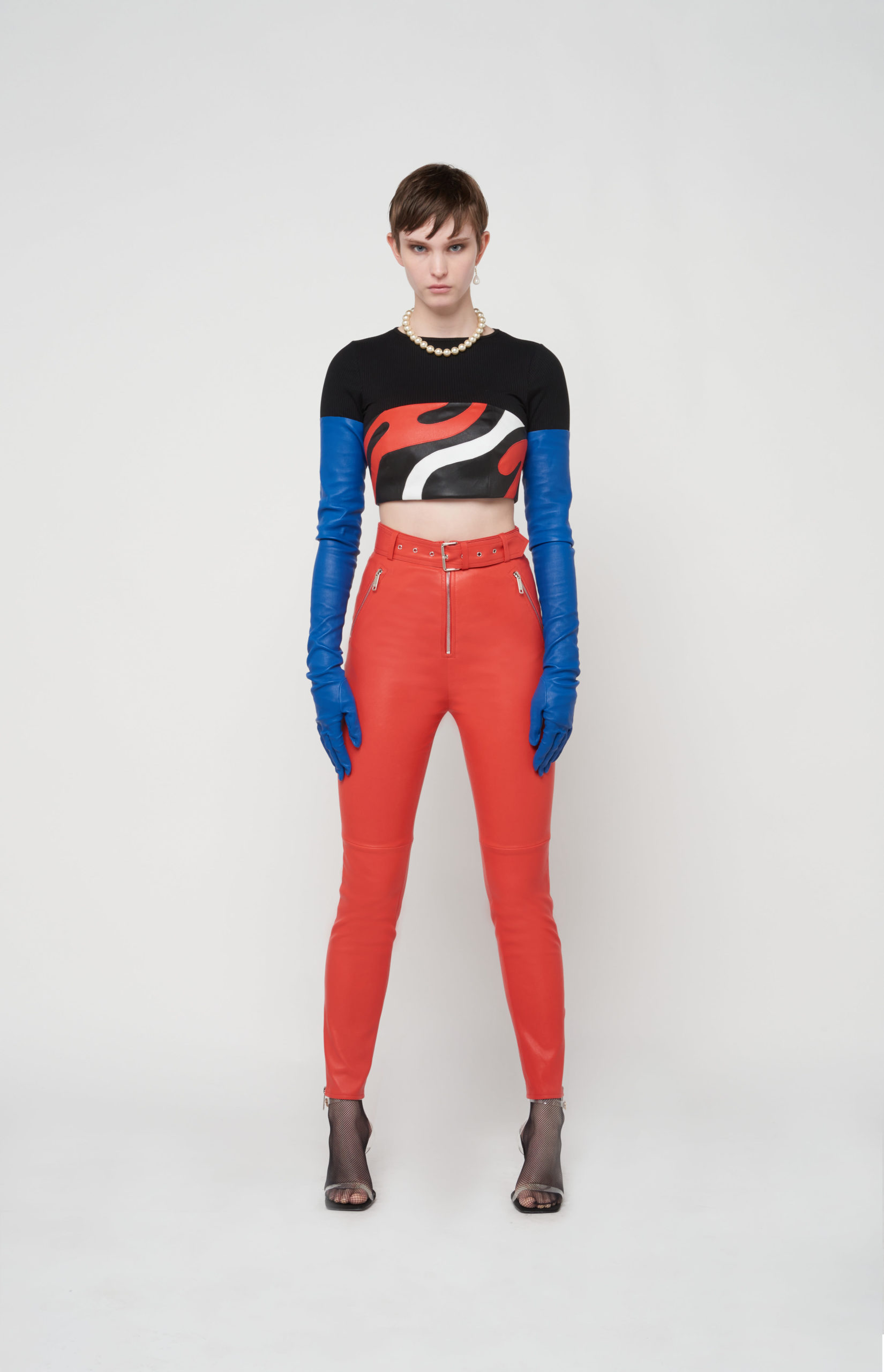 telles des sous-vêtements, bandeaux et micros-shorts en cuir stretch d’une palette de couleurs