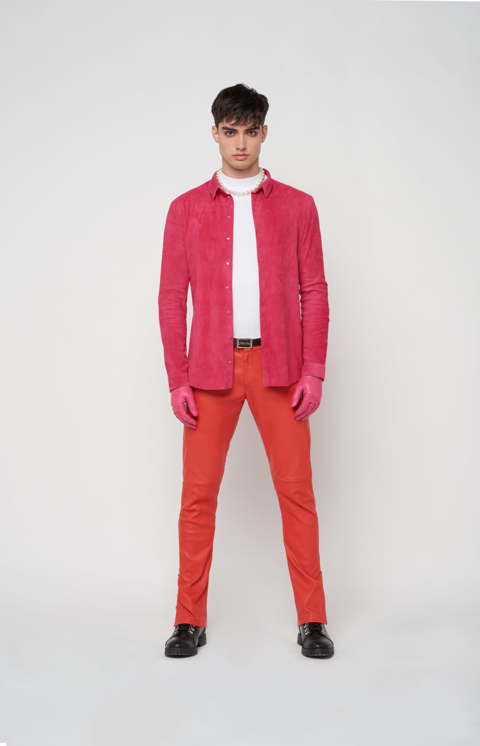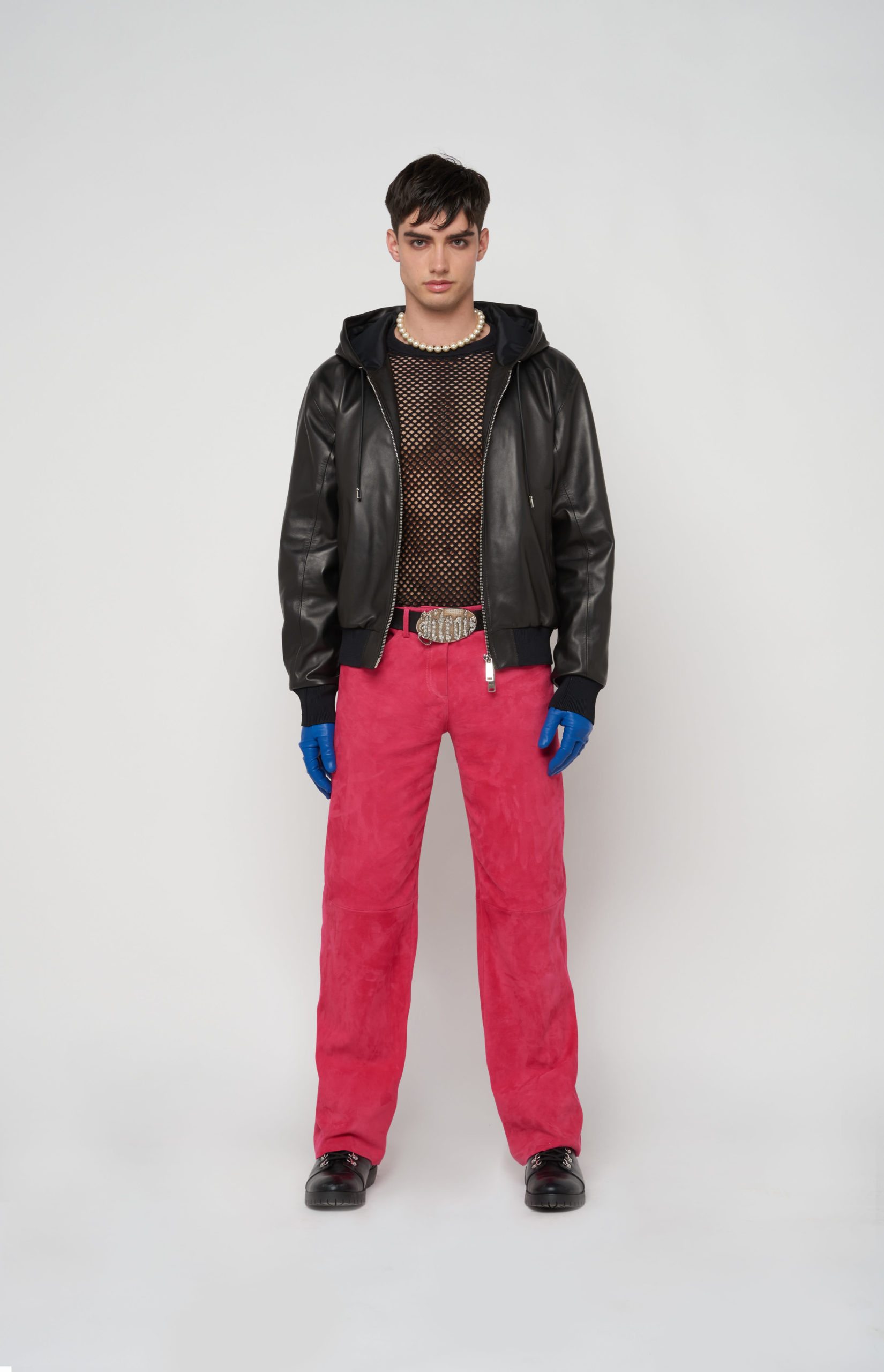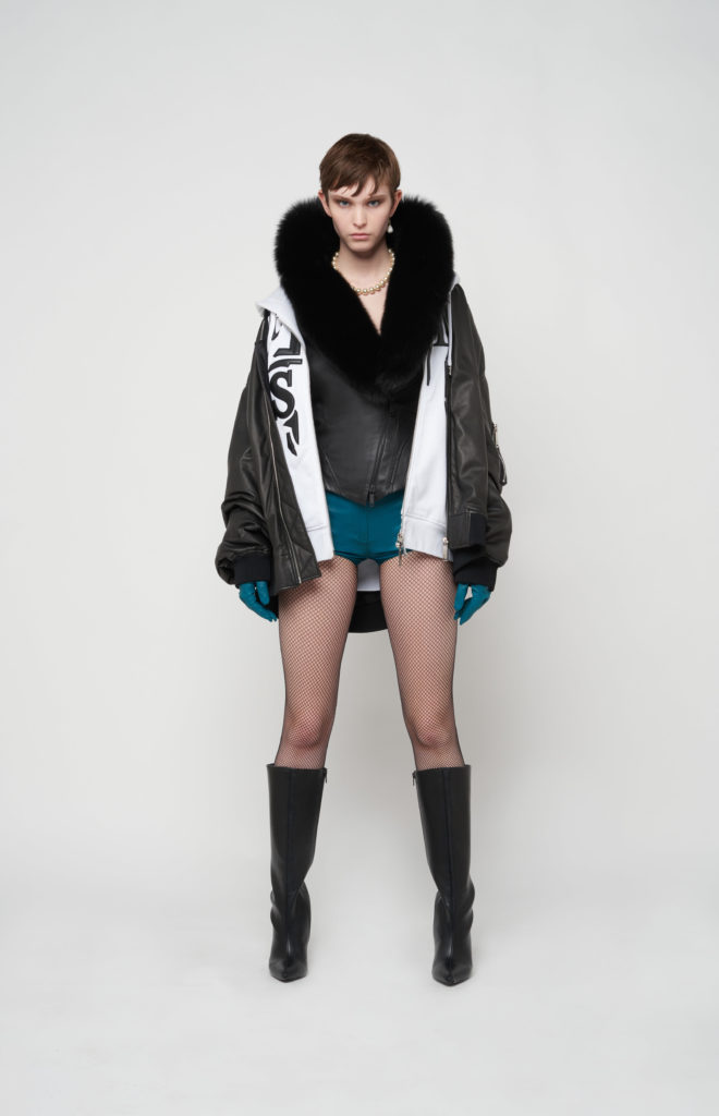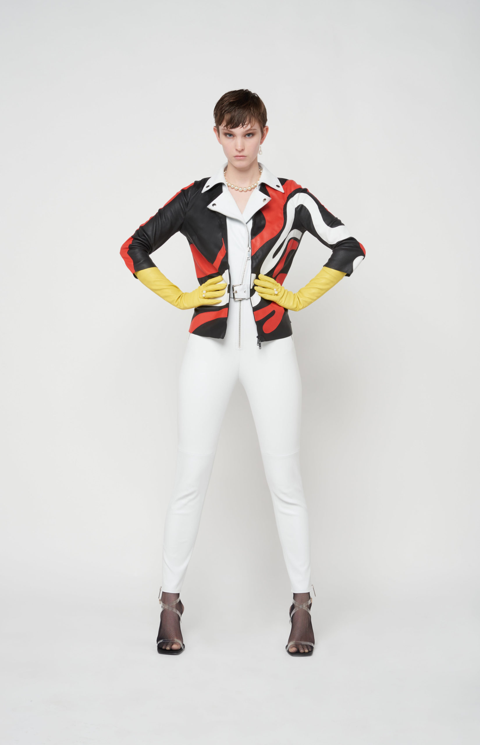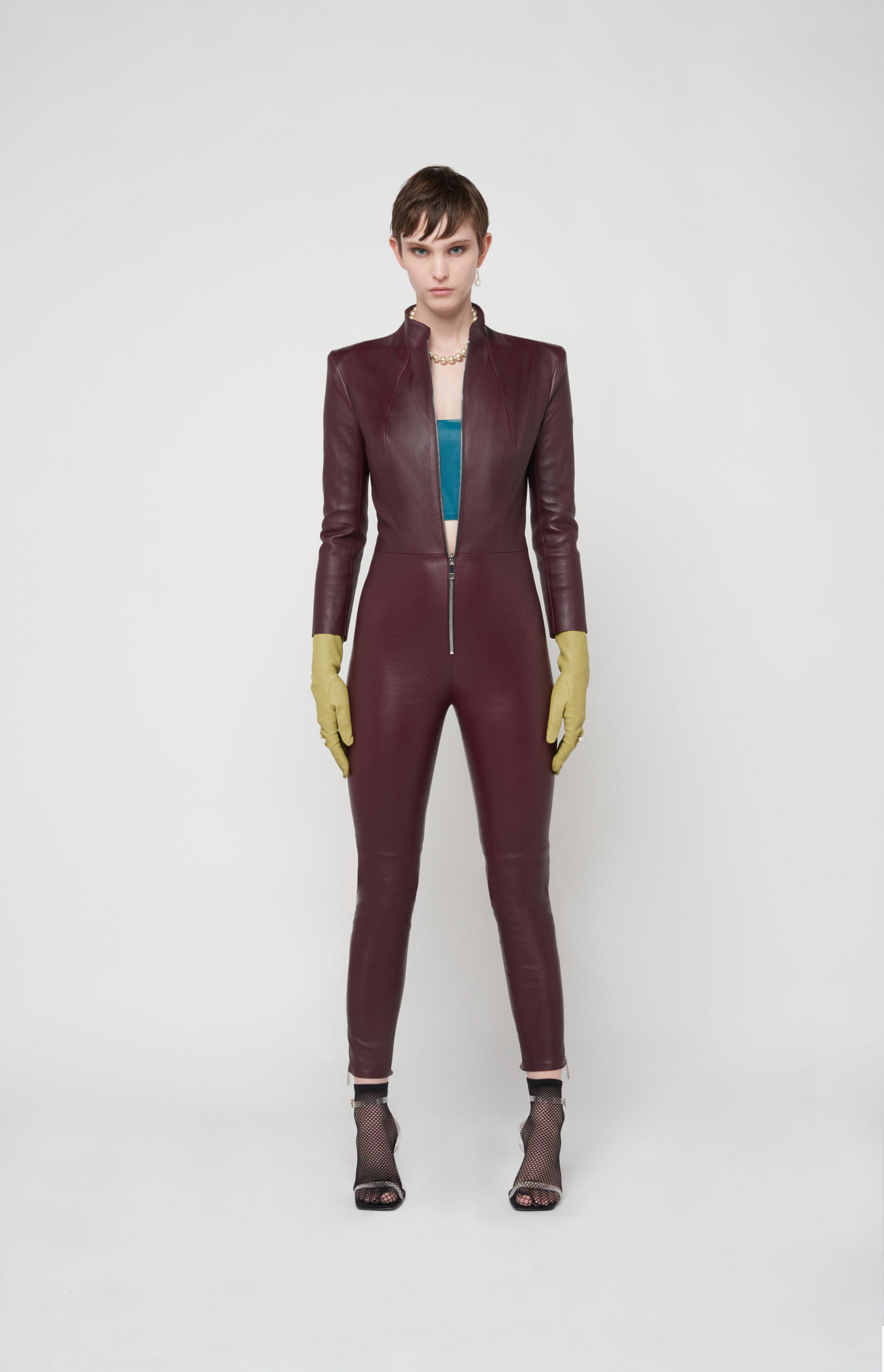 telles des sous-vêtements, bandeaux et micros-shorts en cuir stretch d’une palette de couleurs