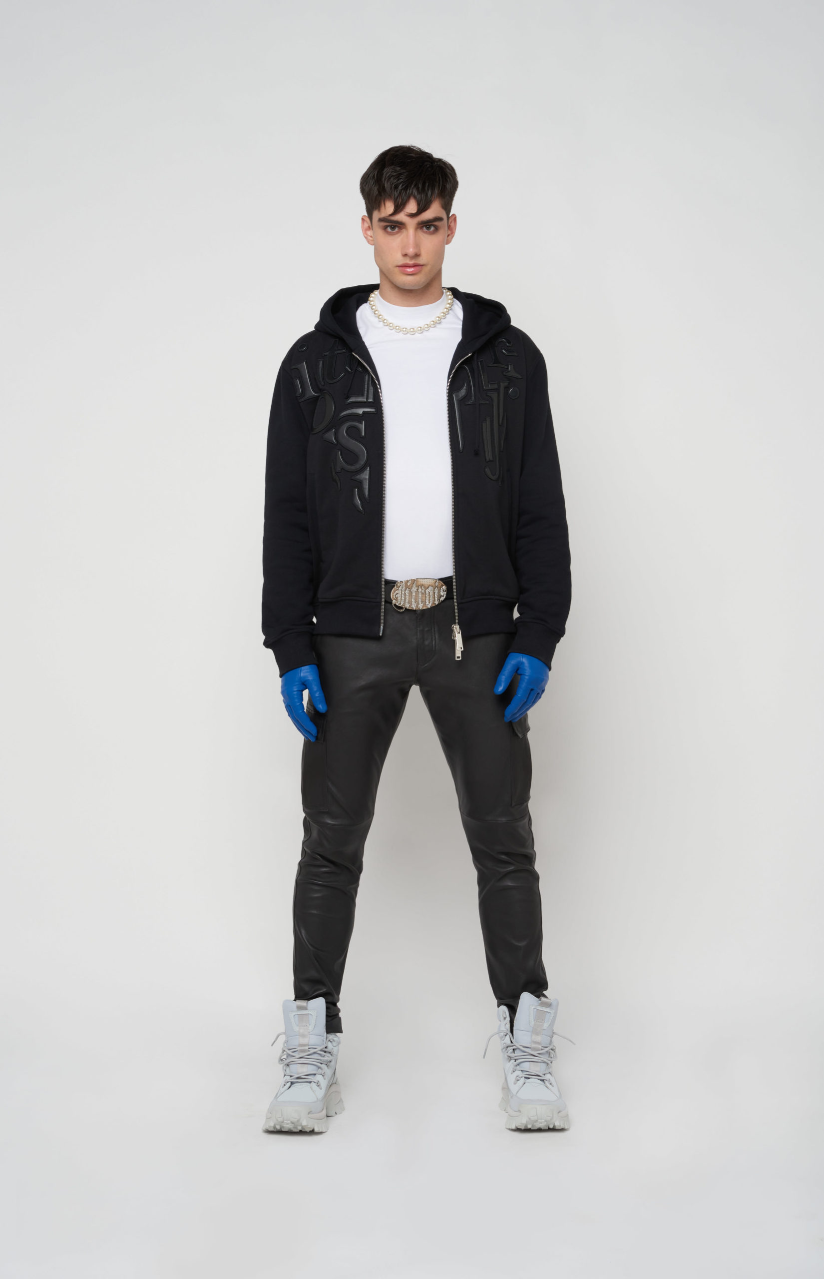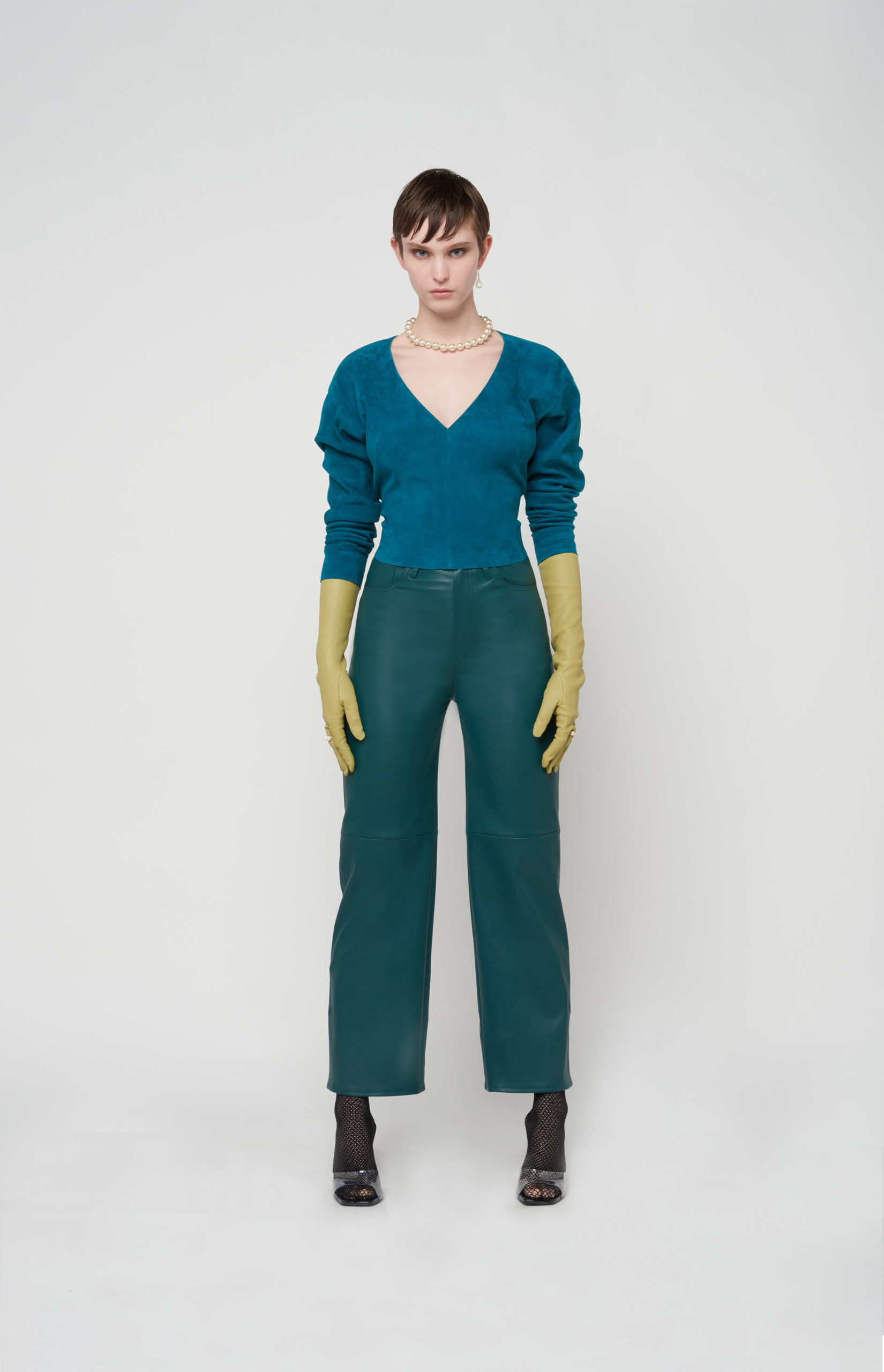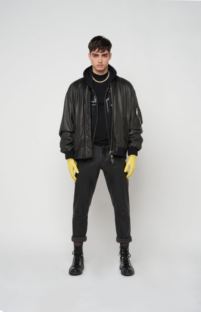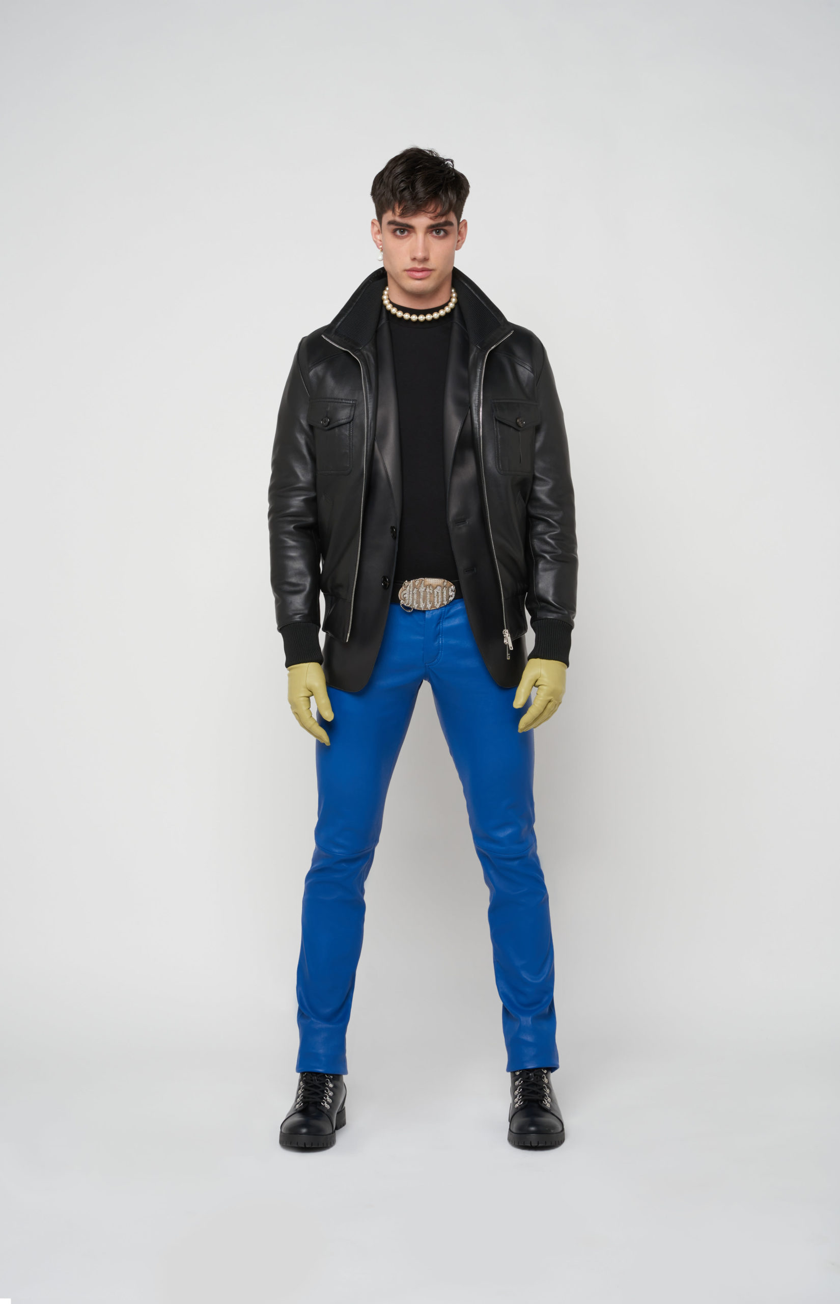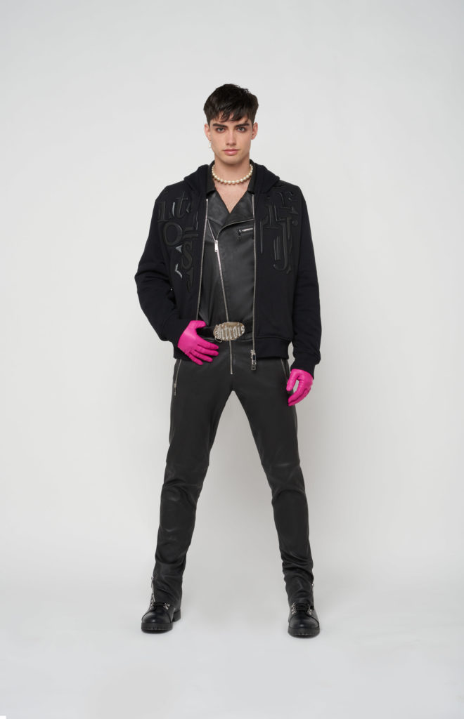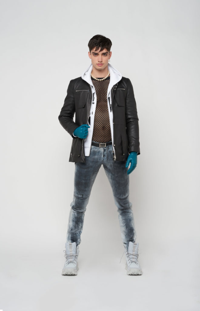 telles des sous-vêtements, bandeaux et micros-shorts en cuir stretch d’une palette de couleurs