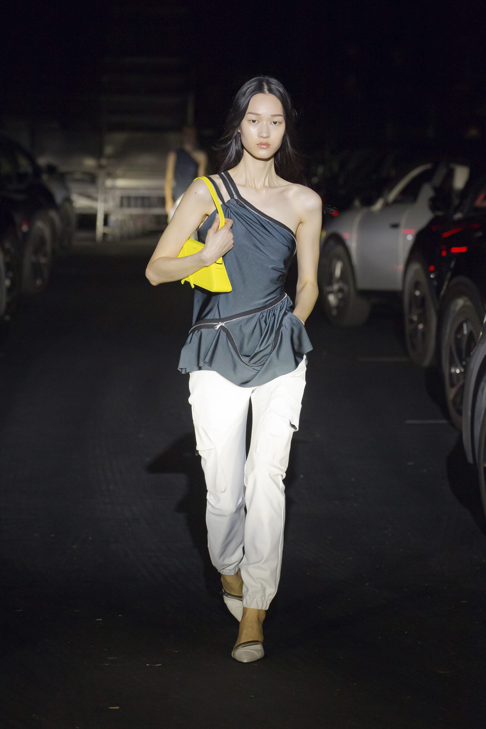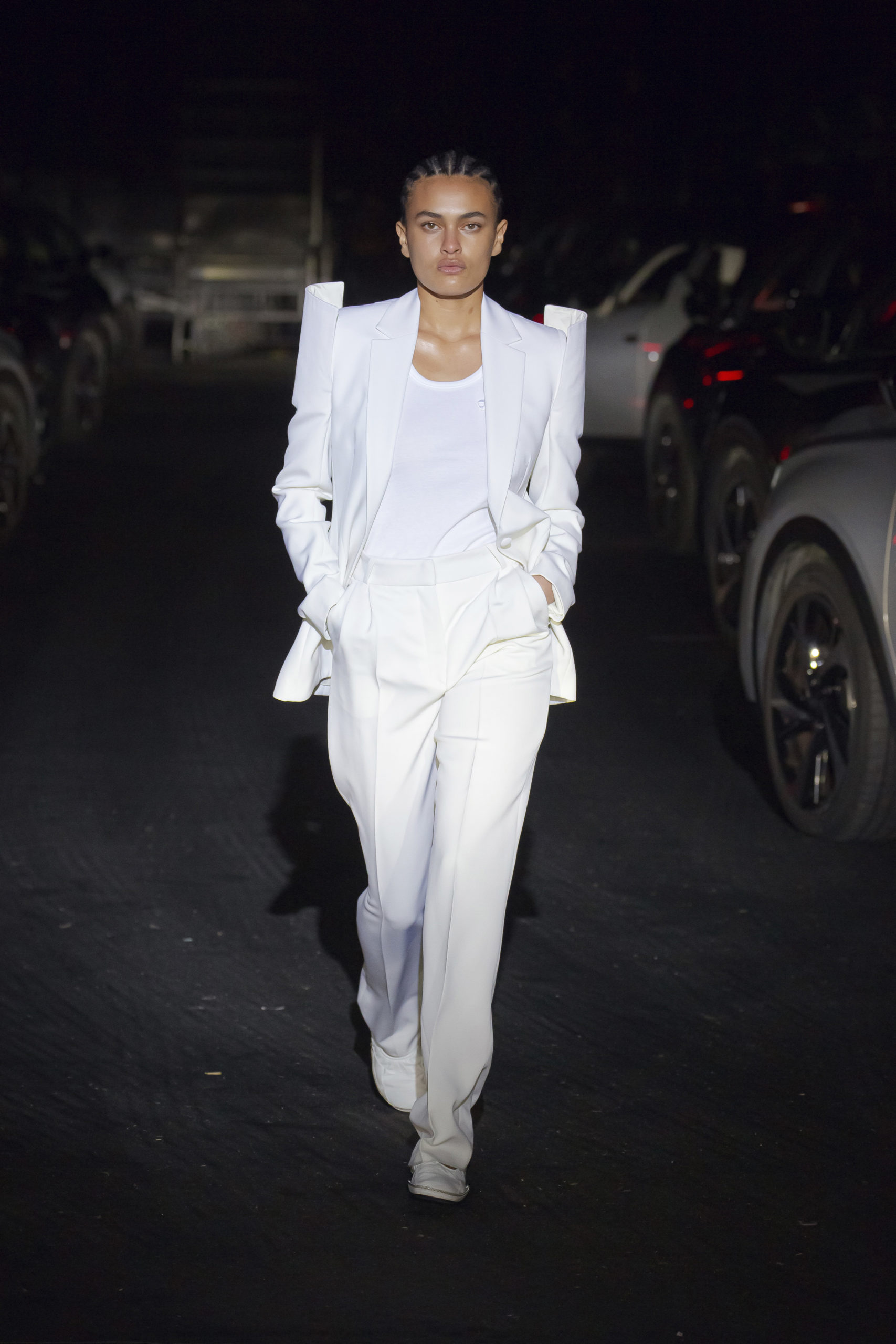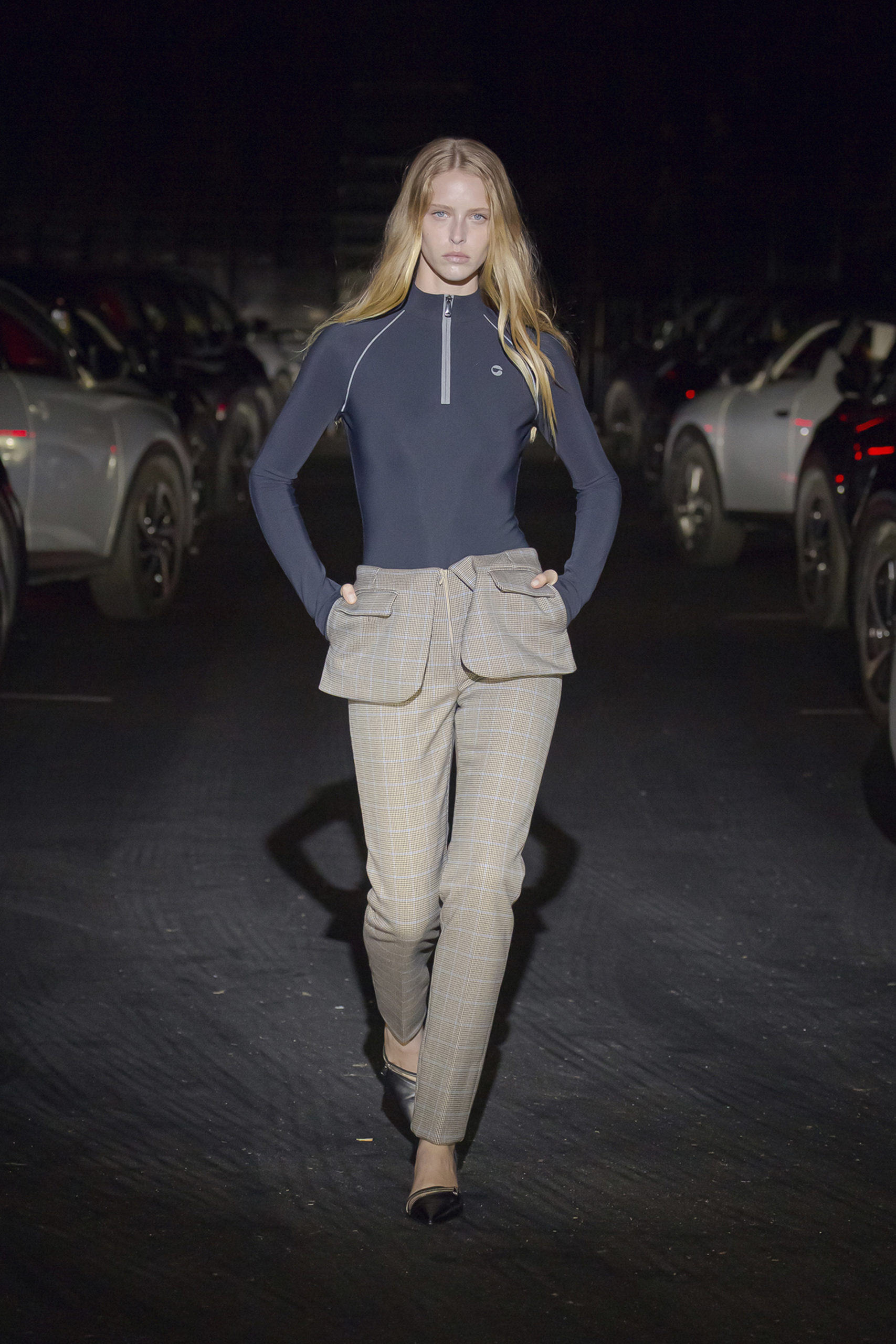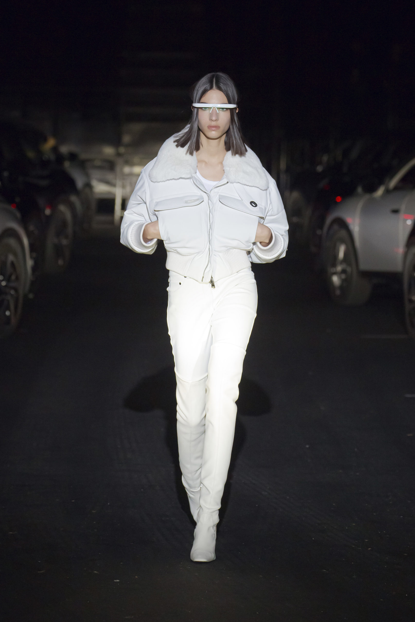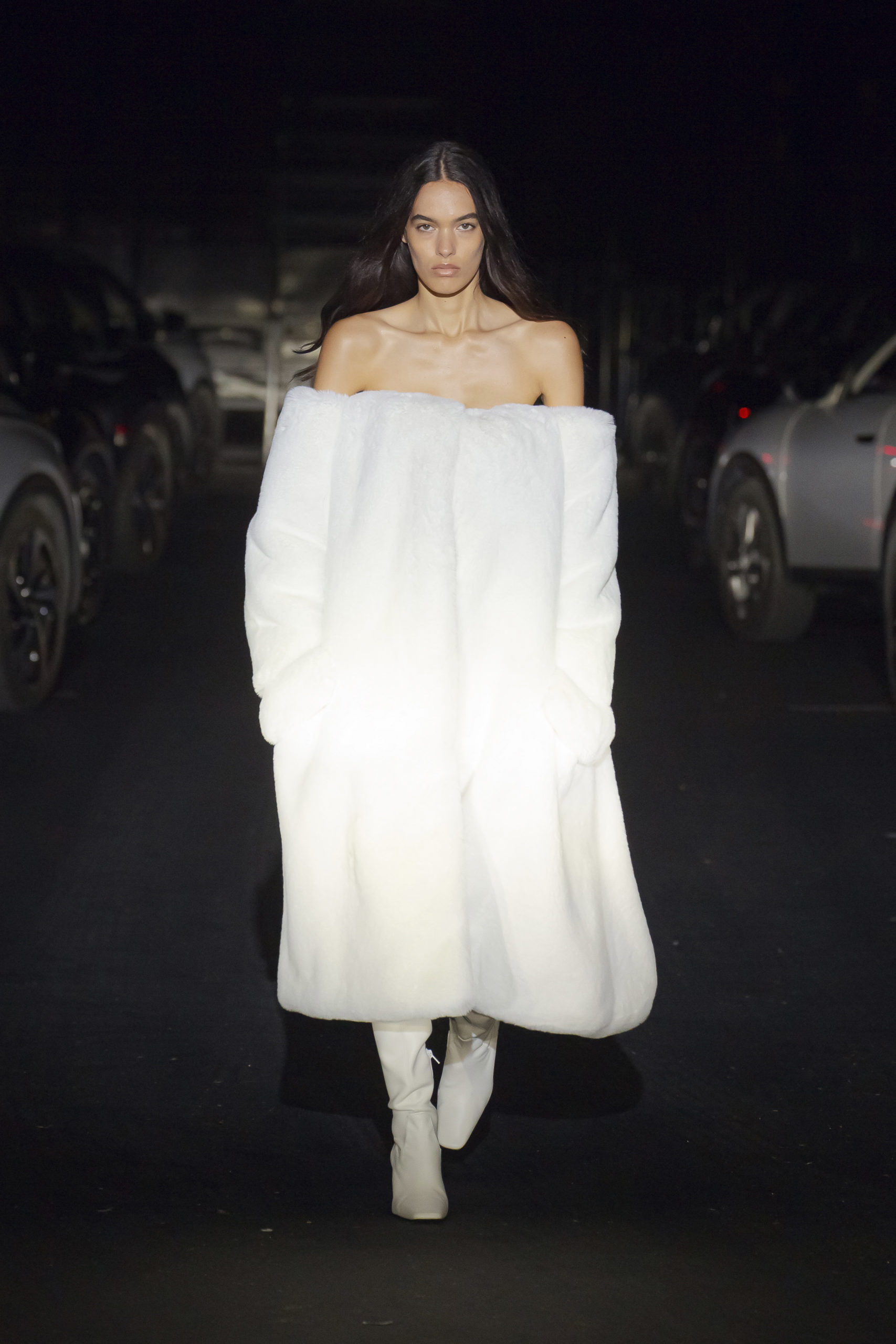 Experience Filming of the catwalk on Thursday 04 March in Paris at 19:30 (UTC+1) 70x participants depart from their homes in 35x electric cars. Each vehicle will navigate the streets of Paris before arriving in the great hall of the Accord Arena in Bercy, the 12th arrondissement of the City of Light. The cars and their passengers will move into the darkness of the empty hall – enough space for over 20,000 in normal times. The choreography takes place after the vehicles have moved in to formation, becoming an integral part of the catwalk. The car radios turn on and announce the start of filming. Each individual set of headlights will light up as the first model passes by, allowing participants to view the collection through their car window.