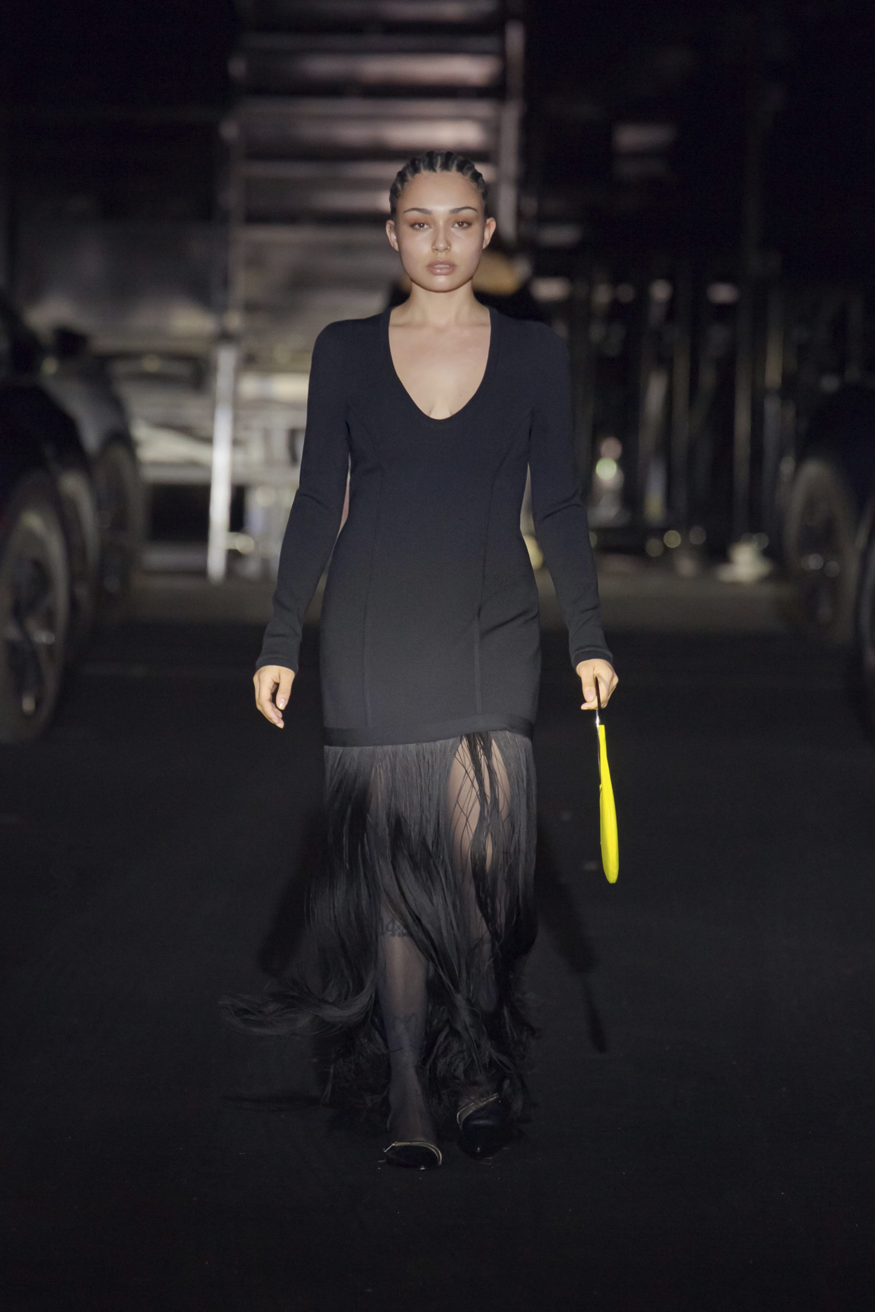 The Winter 21 collection is an exploration into the complexity and the mystery of nighttime as we know it: sometimes pitch-black, sometimes dotted with stars, sometimes illuminated by the moon. The night-time of celebration, of seduction and of plunging into the unknown is opposed to the nighttime of sleep, of resting our bodies and allowing dreams to take over our mind and our soul. Frank and dynamic cuts on classic silhouettes let us glimpse the skin lying beneath. The shoulders are raised, the arms are slender – ready to enter in to the darkness. Sensuality arises from a play on zipped drapintg. Second skin mesh opposes the moving fringes. Bags in the shape of a padlock suggest something locked away in darkness. Maximalised forms lead us towards calmness, reconciliation and time for ourselves. Softness protects the body and light becomes therapy. This night will be an experience.