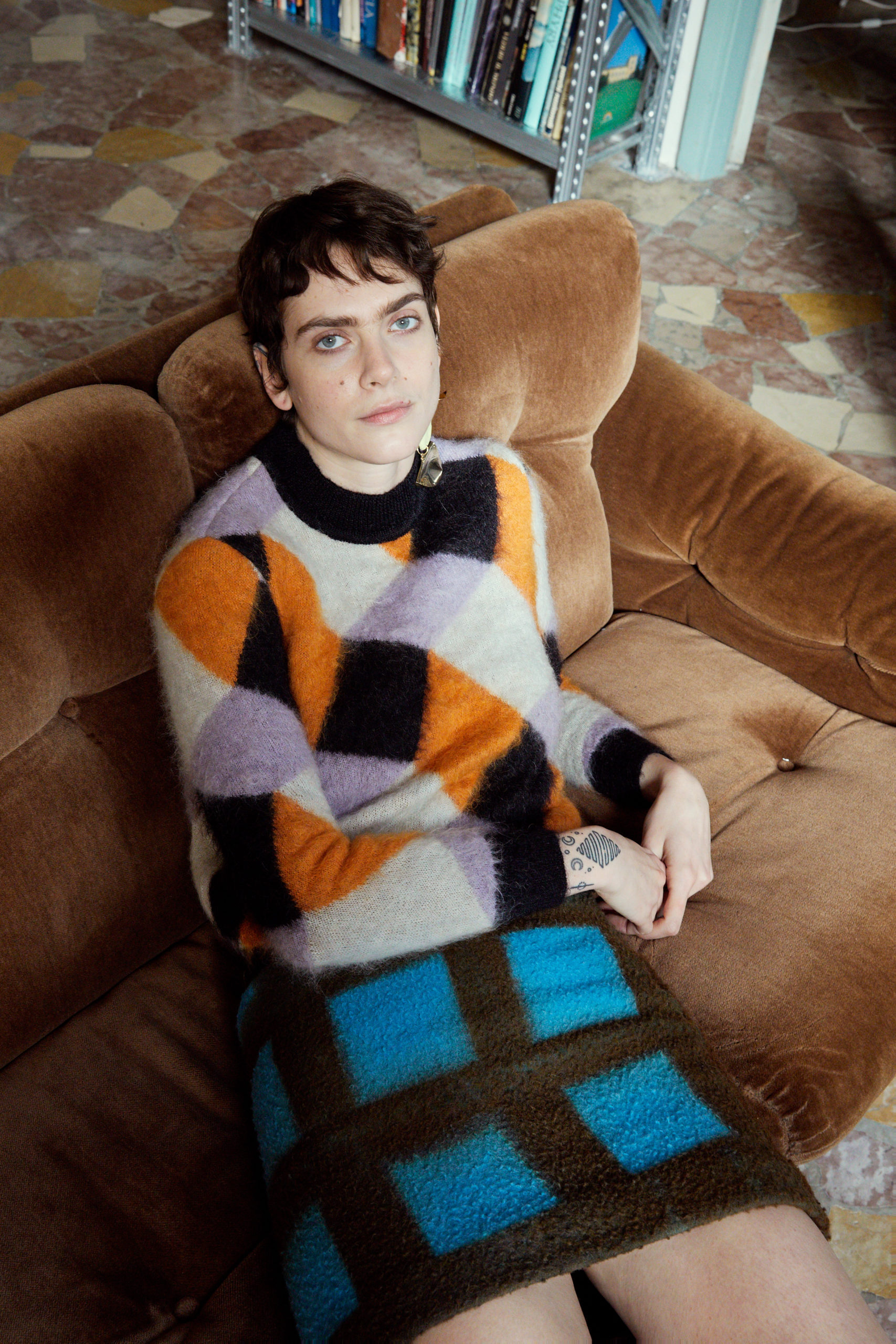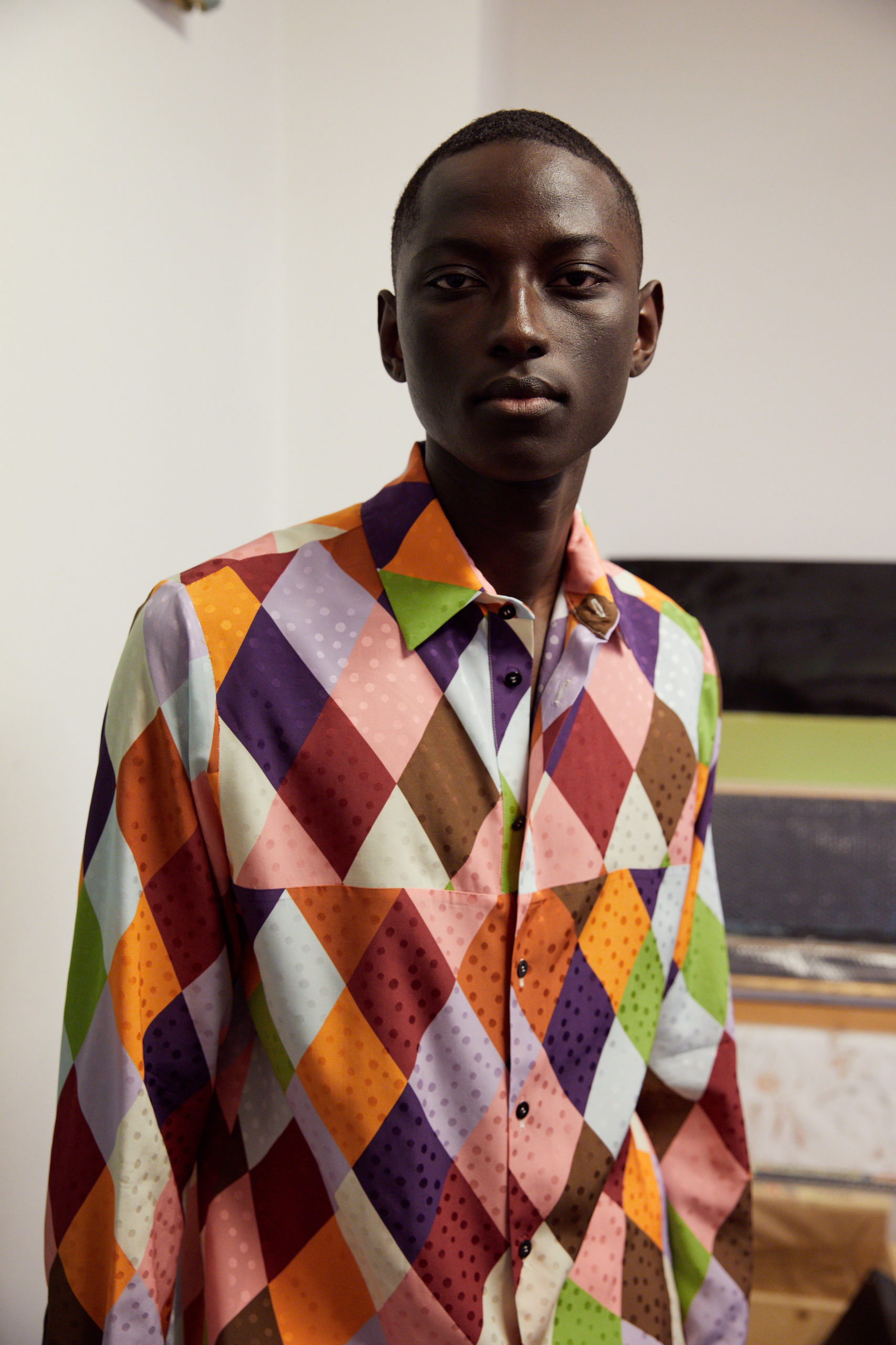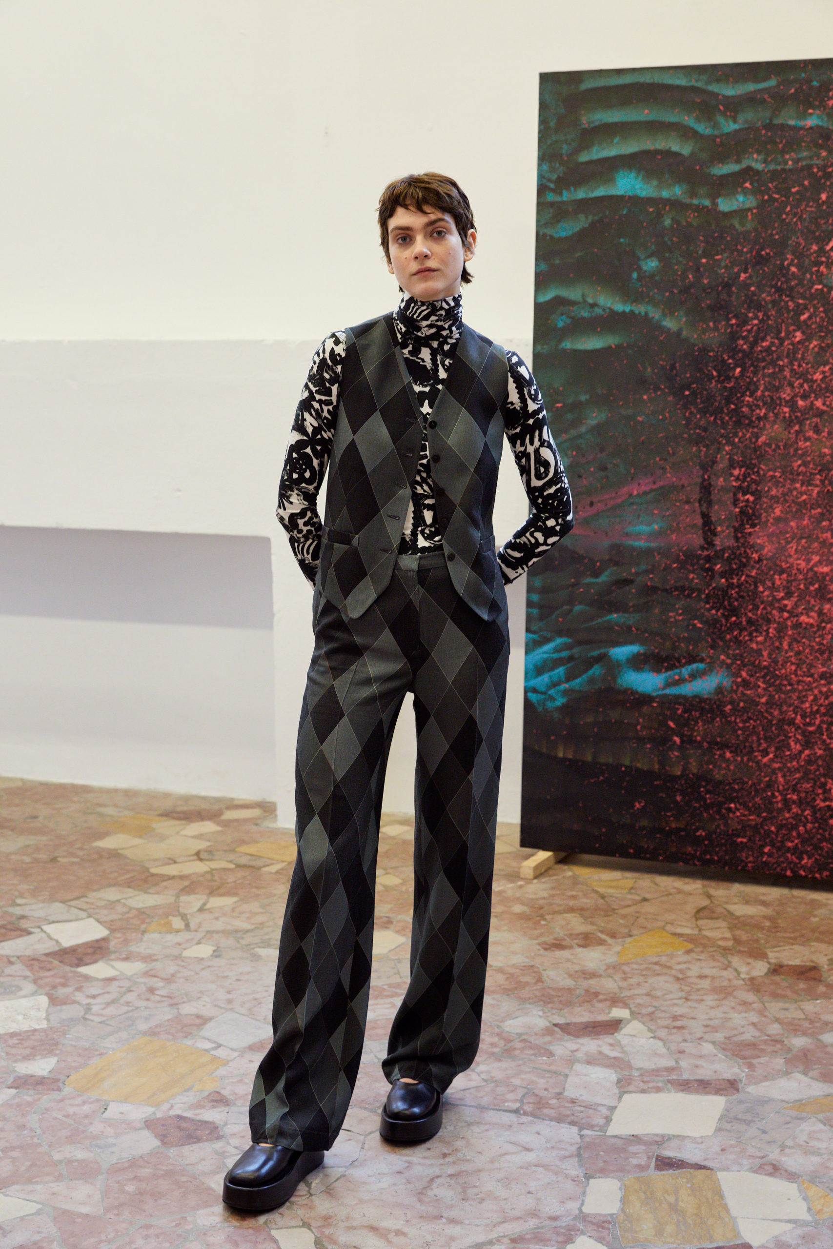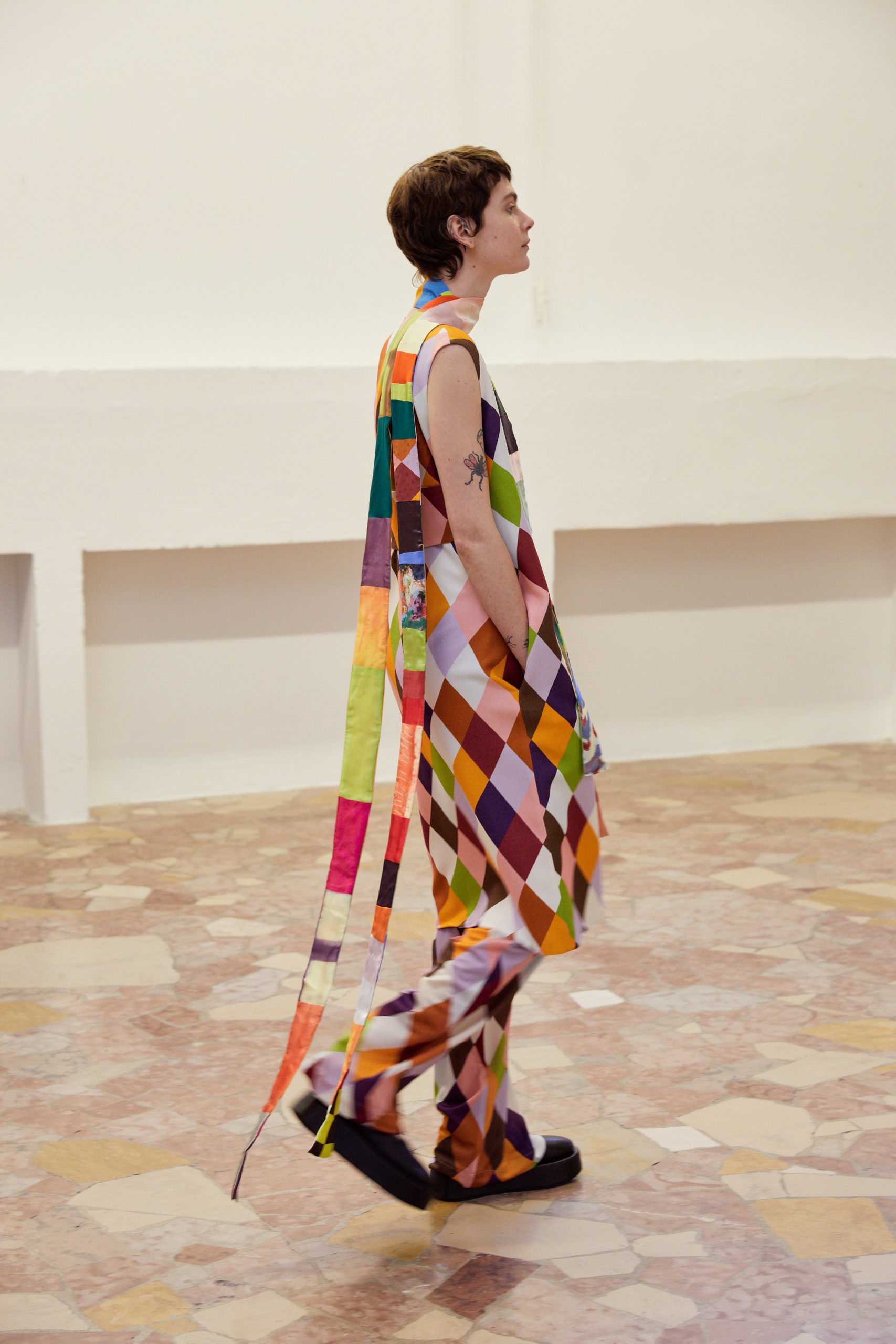 « Since I believe that now it is even more important then ever to only do very personal work and turn ideas into reality that you really care about, I also wanted to focus with this collection on British artist Joe Tilson – I’ve been a fan the second I discovered his work in a book as a student in the library at Saint Martins: the graphic patterns, his colorful pop-art fantasy with the references to ancient cultures and all the different materials he has been using – and on top his deep connection with Italy – made perfect sense to have as another starting point for Fall 21« , explains Arthur Arbesser.