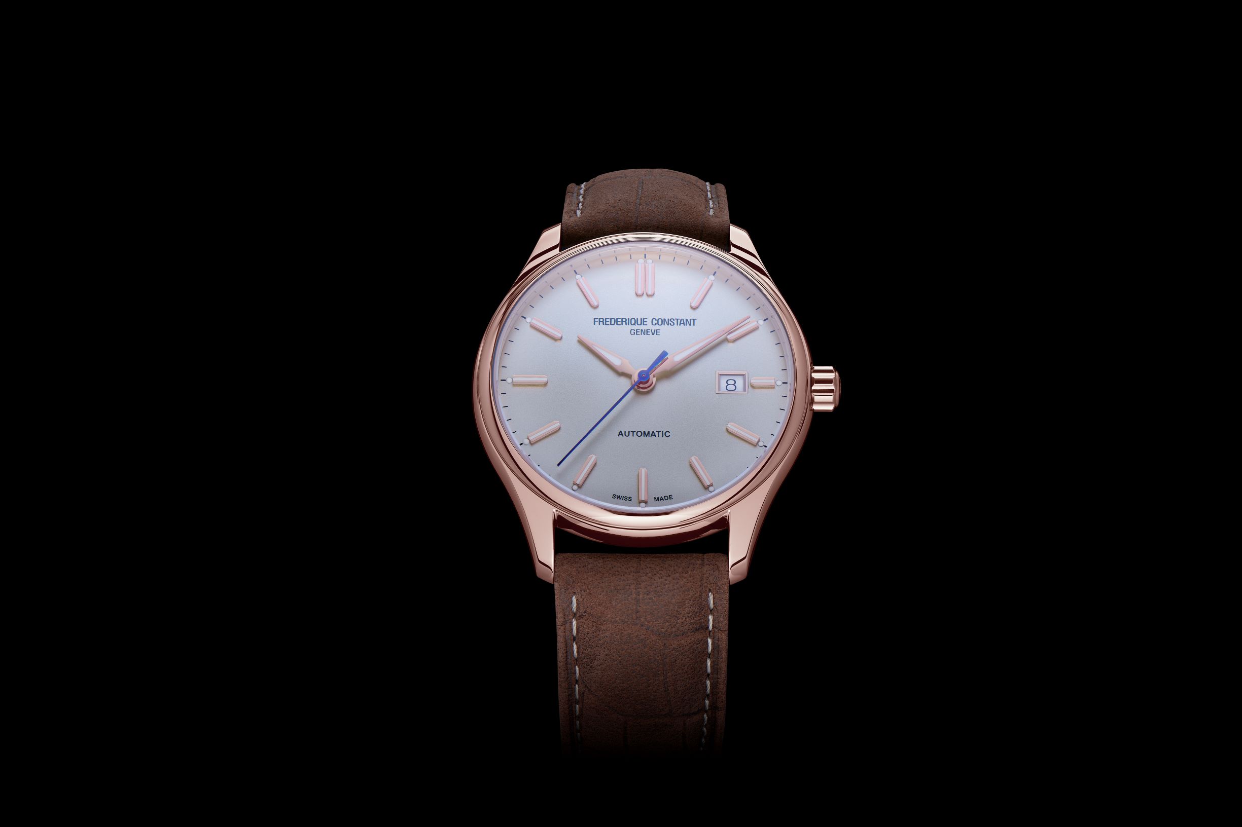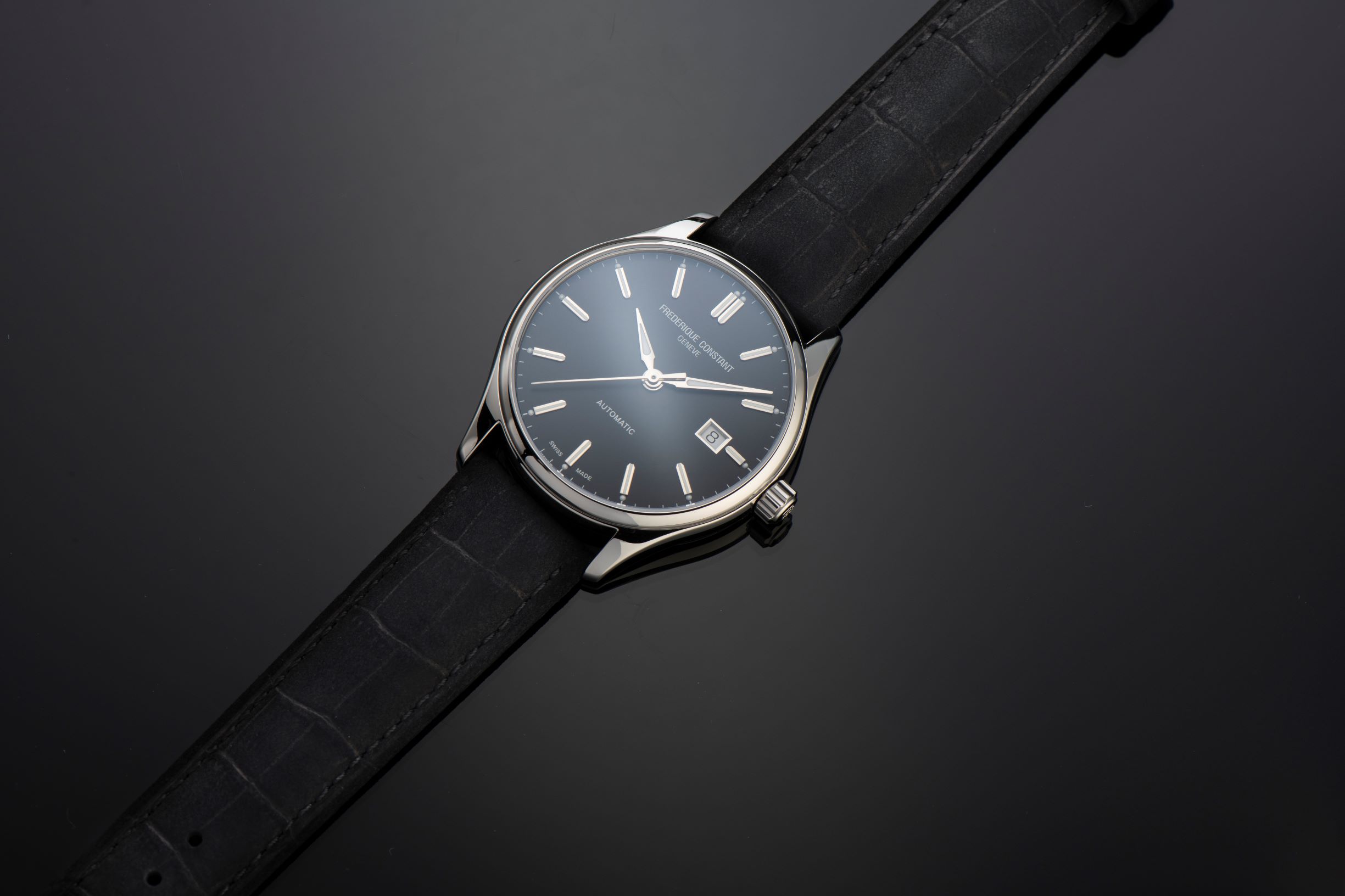 Définitivement acquis comme l’un des matériaux phare de l’horlogerie, l’acier habille quatre des boîtiers de 40 mm de diamètre, le cinquième étant en plaqué or rose avec aiguilles en acier bleui. Chaque variation est animée du calibre automatique FC-303, offrant 38 heures de réserve de marche, portée sur un bracelet cuir avec finition nubuck en brun, noir ou bleu. Une exception ! Le modèle « full acier » paré d’un cadran bleu et habillé d’un bracelet en acier.