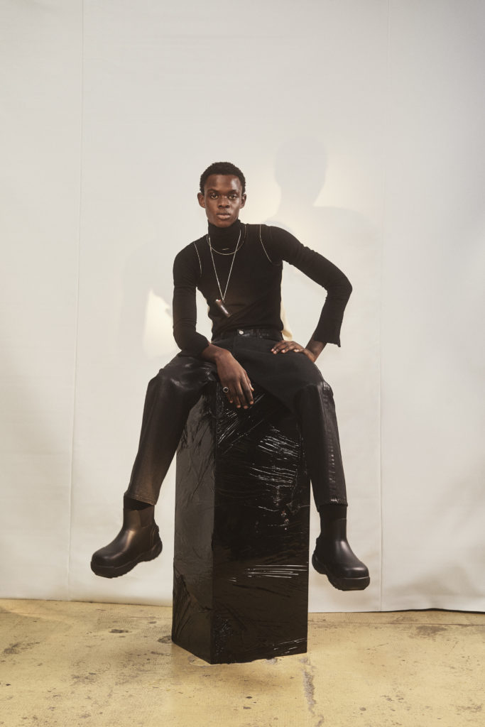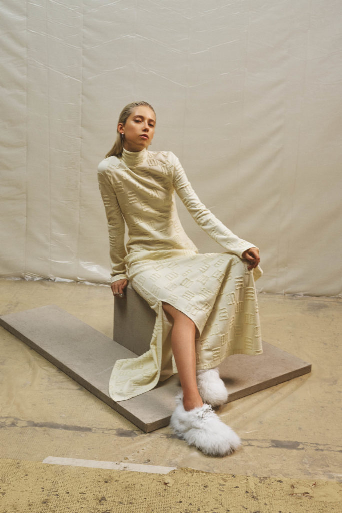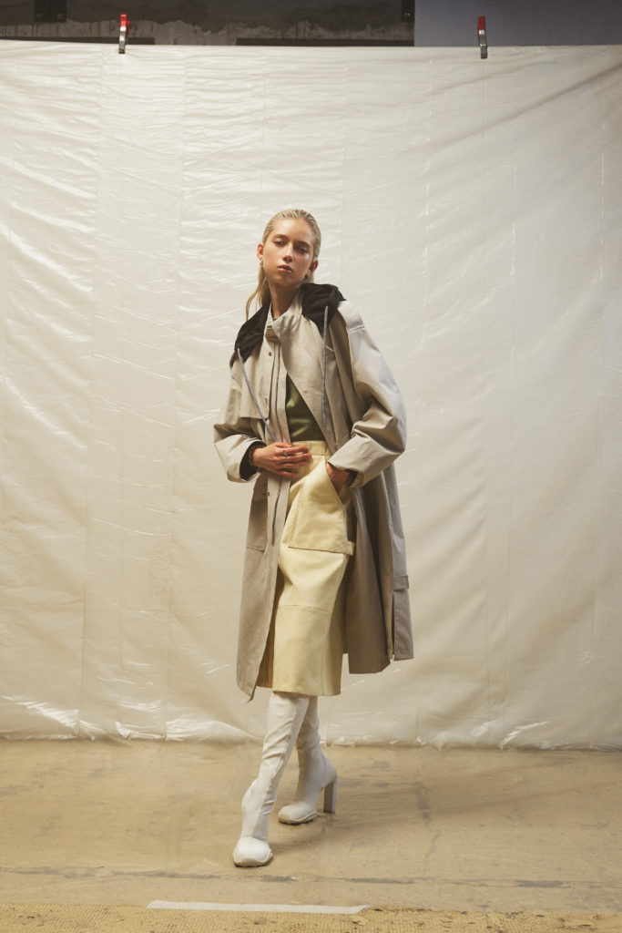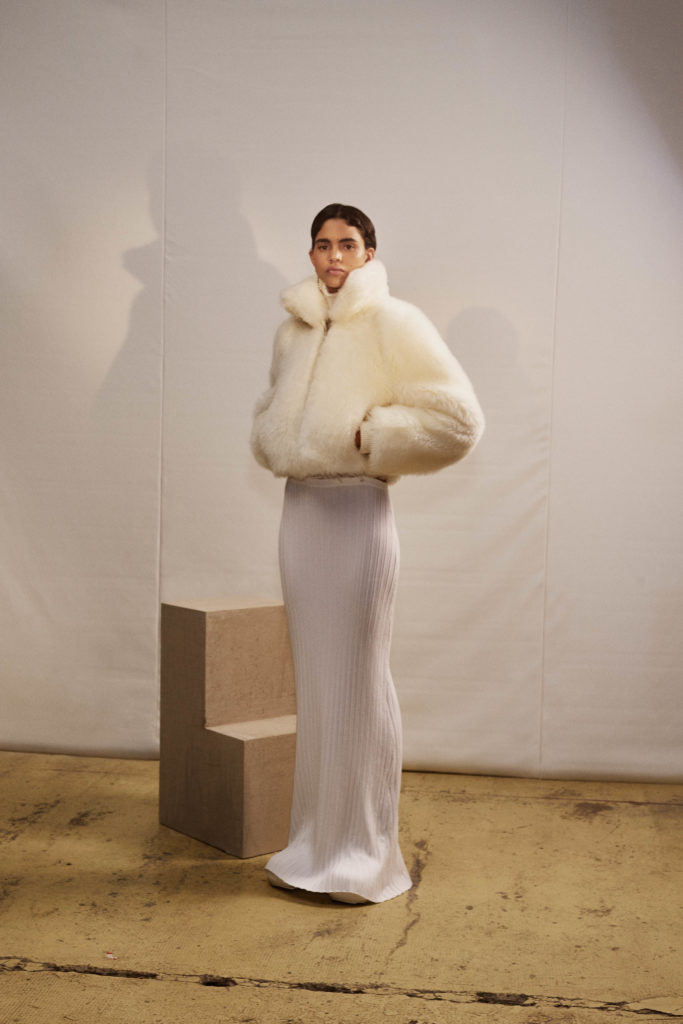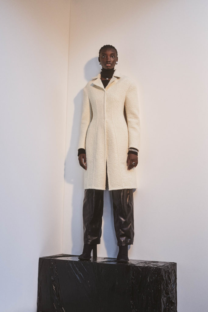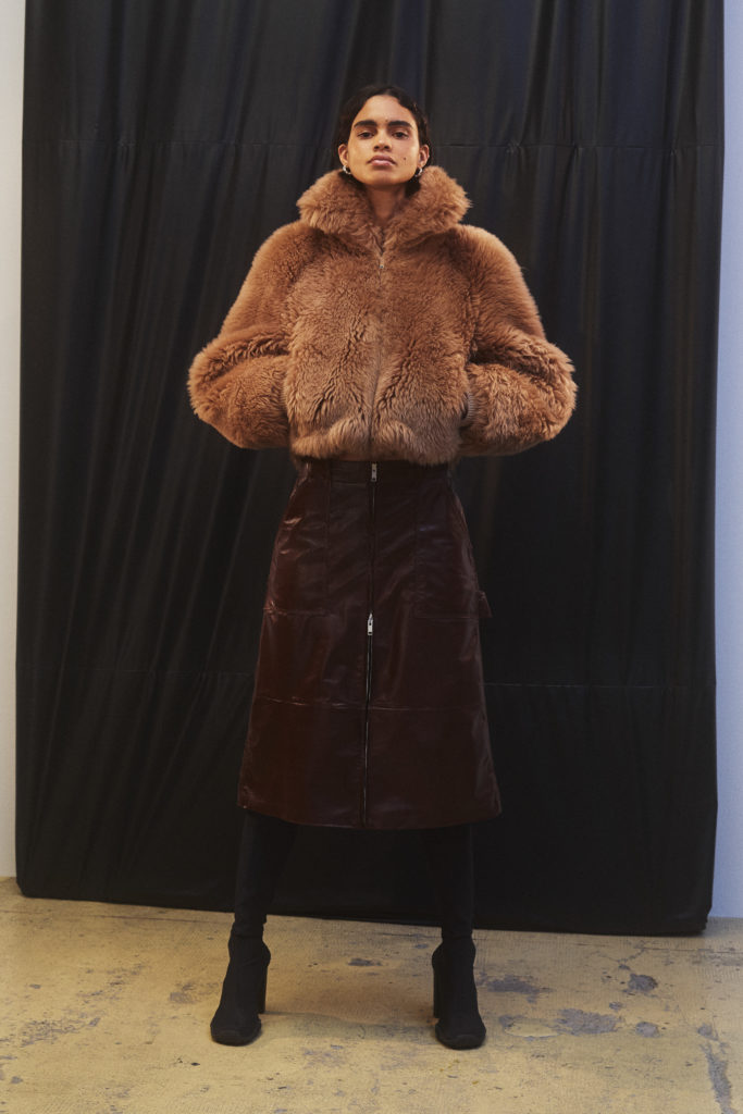 an elegant nostalgic silhouette. Paired with bulbous boots or squared off heels, the effect is modern, giving an elongated proportion. The mix of fabrics speaks of unexpected comfort — cream chunky knits worn with leather, ribbed jersey with shearling, chain link straps on a simple black dress. There’s a relaxed feel to the materials used throughout, from washed soft cottons to Japanese denim , supple leather and even down to the rubber coating on coats.