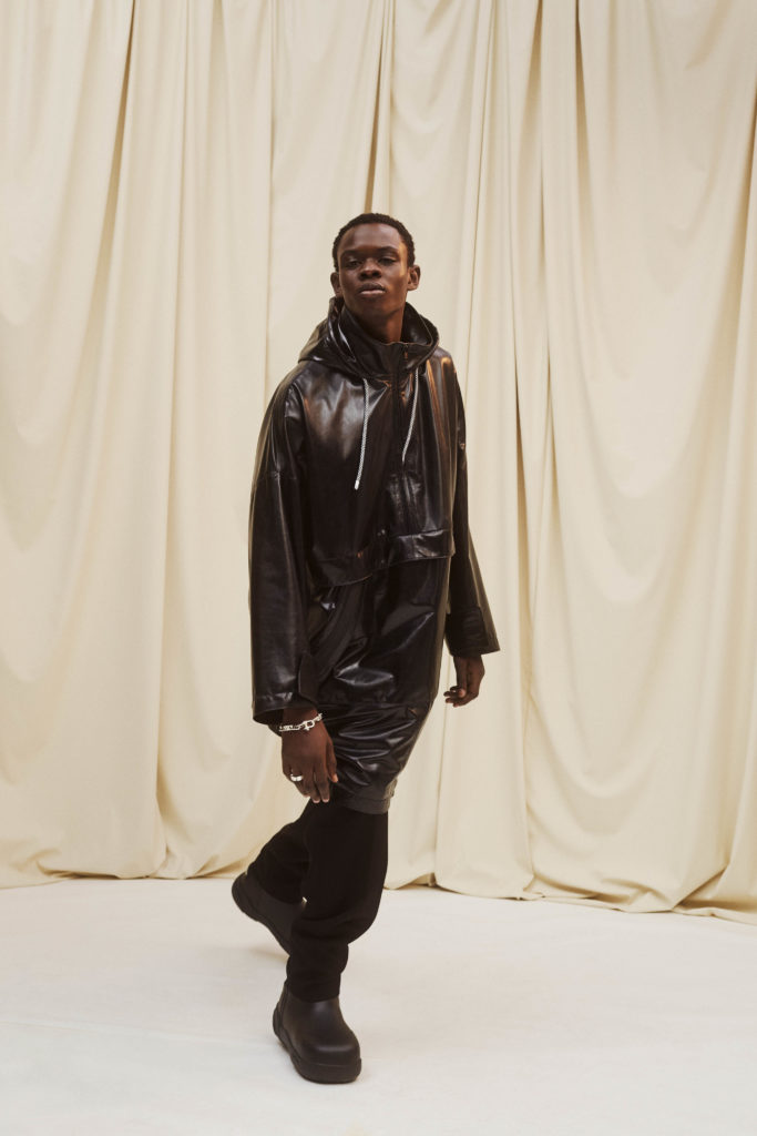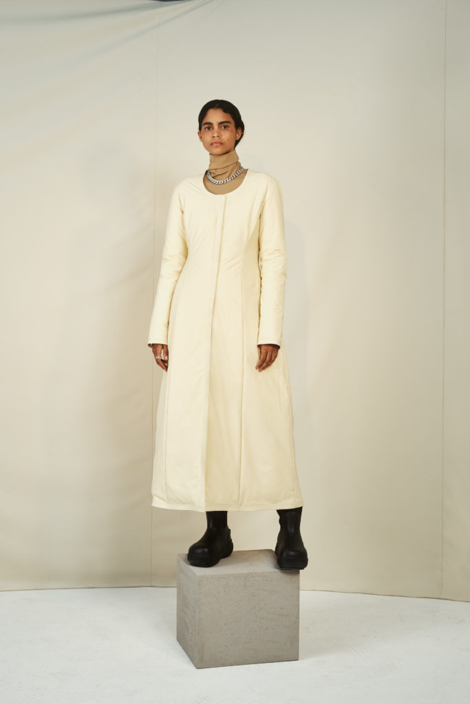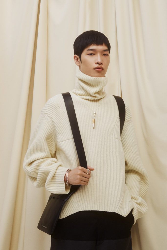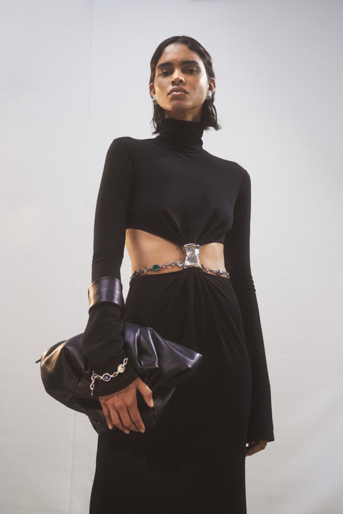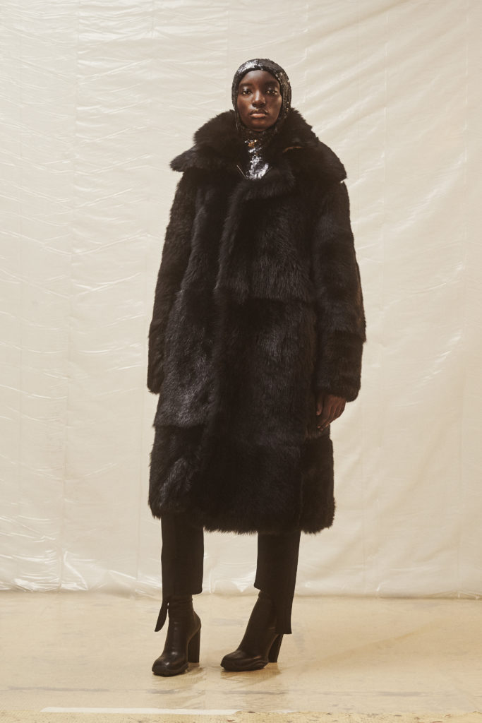 warmth meet the experimental proportions. It’s not all practicality, however, as bursts of sequins and colour enliven the collection, as YOON asks why a sparkling dress can’t be comfortable without compromising style. Throughout, the jewellery that AMBUSH built its name on adds points of interest, whether thick chain link or statement earrings.