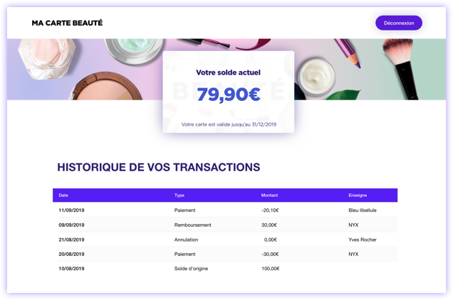 Créditez la carte du montant de votre choix (entre 10 et 150 €) – La carte est envoyée par courrier – Ma carte beauté est valable 1 an après la date d’activation – Ma carte beauté est flexible : Son montant est fractionnable sur plusieurs achats, vous pouvez également ajouter un paiement complémentaire à votre carte en boutique.
