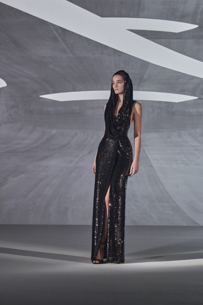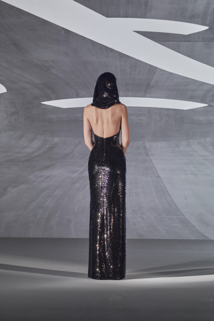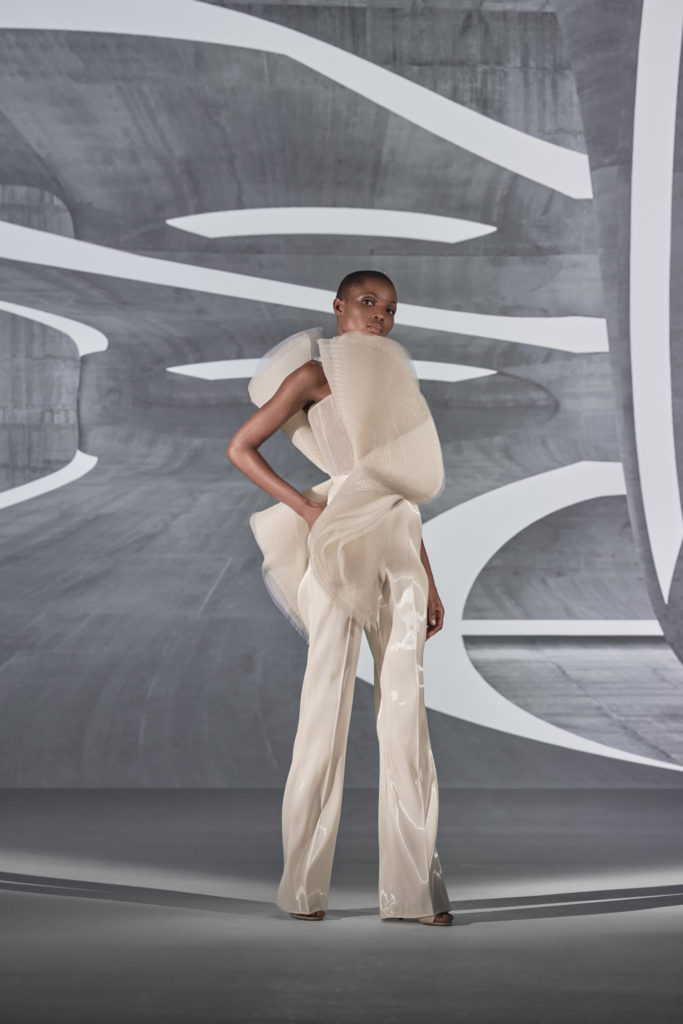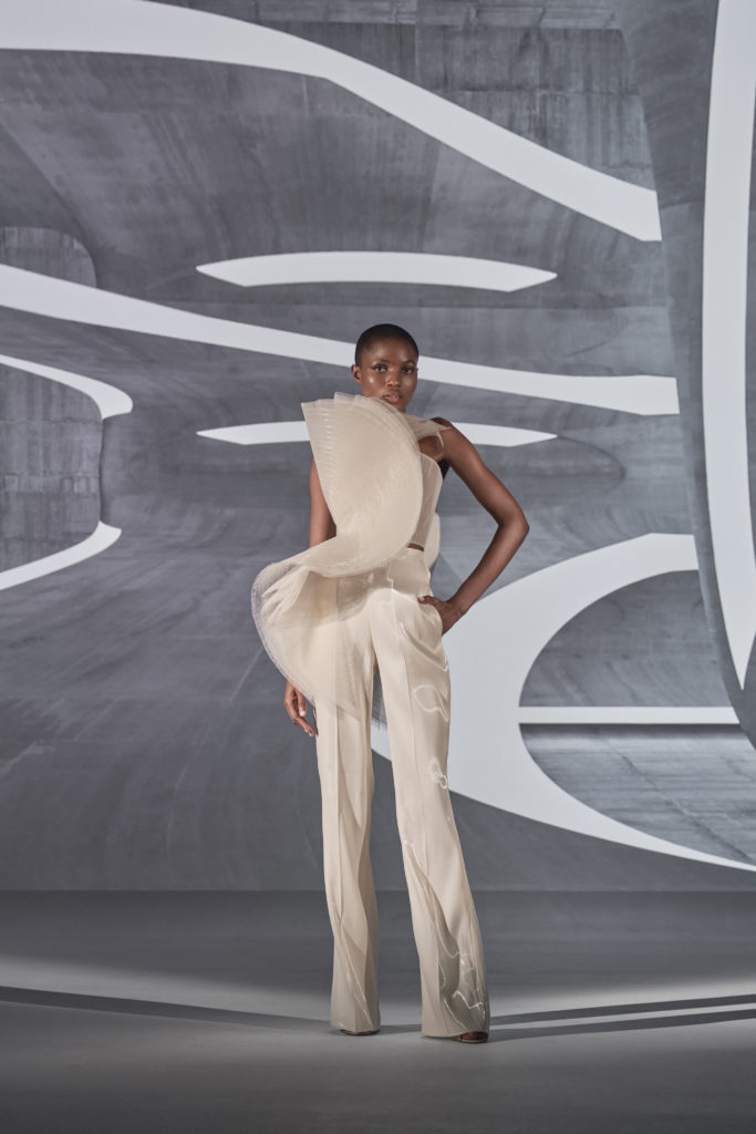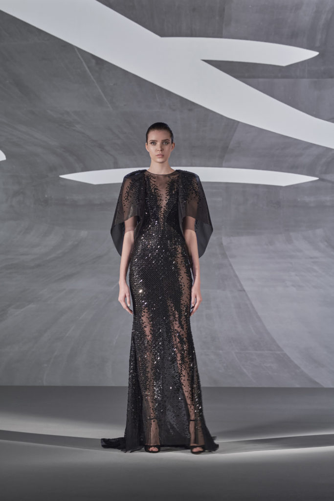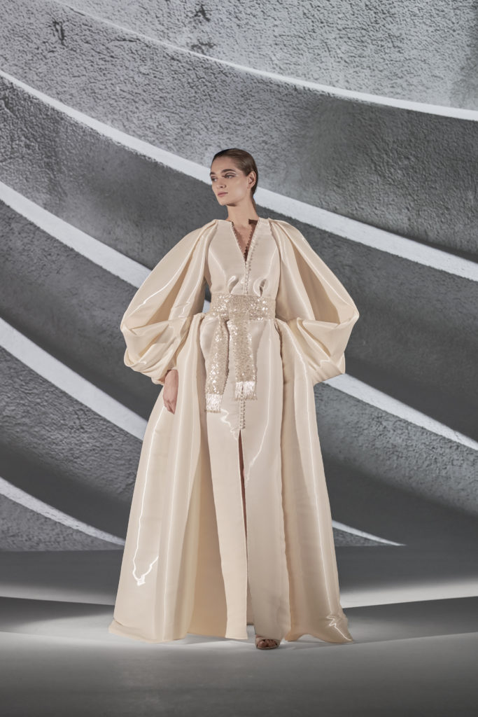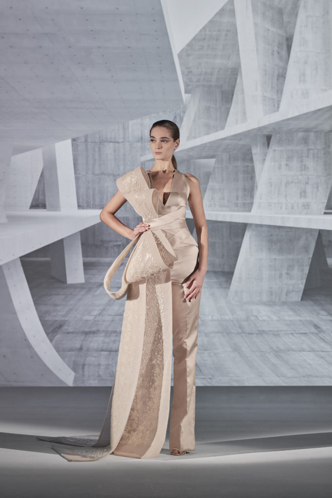 Evoquant une ambiance magique de nostalgie, Rami Al Ali imagine une collection qui parle de son héritage syrien. Pour sa collection de couture printemps/été 2021, Al Ali réfléchit à l’ambiance magique d’une soirée à Damas. Dix-huit looks au total, tous magnifiquement alliés pour illustrer sa vision de la saison. « Je ne sais pas si c’est un fantasme orchestré par mon imagination ou l’écho d’un vieux souvenir d’enfance, mais cela me revient toujours aussi fort, aussi réel, aussi vif et très nostalgique ». Rami Al Ali raconte. « Une soirée à Damas, pour moi, c’est une brise fraîche qui flotte avec un doux arôme de jasmin. Des murmures apaisants derrière les moucharabiehs en bois de rose, mêlés au gargouillement de la fontaine de la cour et aux ombres créées par la pleine lune, comme un sanctuaire serein – profondément inspirant et si paisible ». La collection propose une palette raffinée de tons chauds de beige, de champagne et de tons poudrés entremêlés de noirs lunaires. Rami Al Ali manipule avec tact les silhouettes en projetant habilement des ombres sur le corps à travers de solides tissus opaques – coupés pour mettre en valeur les lignes architecturales. Des paillettes scintillantes, des perles de cristal et des tissus de satin liquide donnent vie à la collection, reflétant la lumière à chaque mouvement. La collection présente de volumineuses robes de cérémonie, d’élégantes robes longues et des jumpsuits surprenants, travaillés couture. D’autres pièces jouent sur des formes architecturales exagérées, comme des volants, des capuches et des nœuds abstraits. Les tissus classiques de la haute couture, comme le satin et la soie, ont été soigneusement sélectionnés tandis que les volumes et les dimensions extravagantes restent toujours caractéristiques des récentes collections de Rami Al Ali.