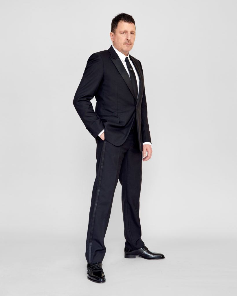 Atticus Ross wore a Dior men’s collection black wool shawl collar tuxedo, a classic white cotton shirt, a black silk tie and a black patentleather derbies.