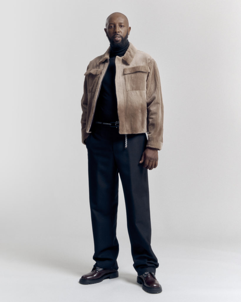 Ladj Ly wore a Dior Pre-Fall 21 men’s collection beige milk fur blouson, black wool oversize pants, a black wool turtleneck, a blue cord belt and burgundy leather Explorer boots.
