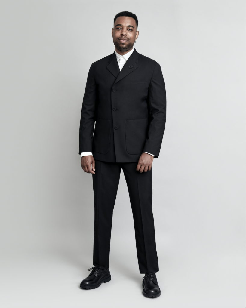 Remi Weekes wore a Dior men’s collection black wool modern tailoring notch lapel suit, a classic white cotton shirt and black leather derbies with Dior oblique detail.