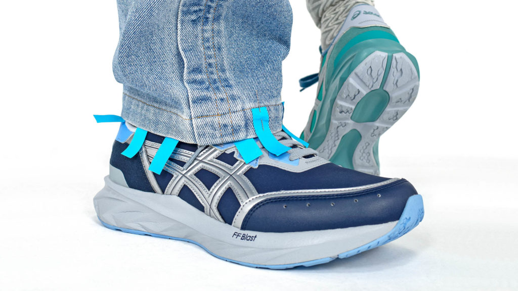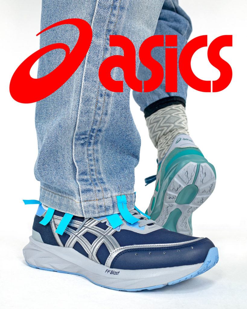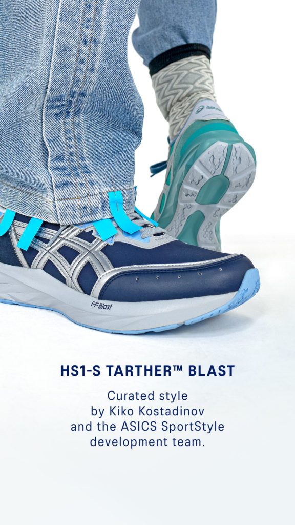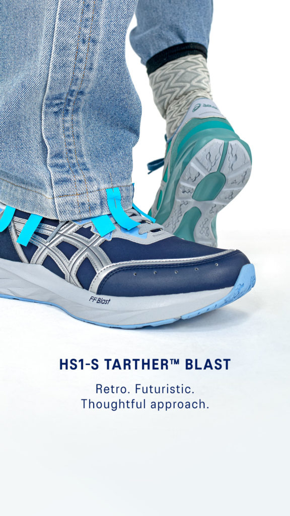 De part sa conception sur mesure, la HS1-S TARTHER BLAST présente une silhouette hybride à mi chemin entre inspirations historiques des catalogues ASICS « running » et esthétique novatrice.