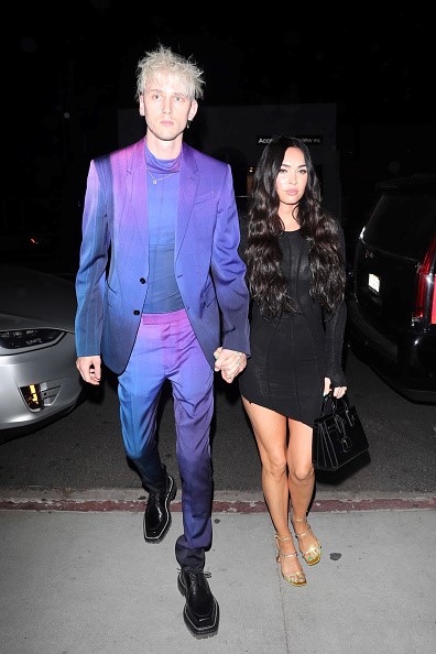 Machine Gun Kelly wears exclusive Lev Khesin printed wool two-button suit and printed cotton jersey turtle neck from Berluti Winter 21 collection and black calf leather Ultima shoes.