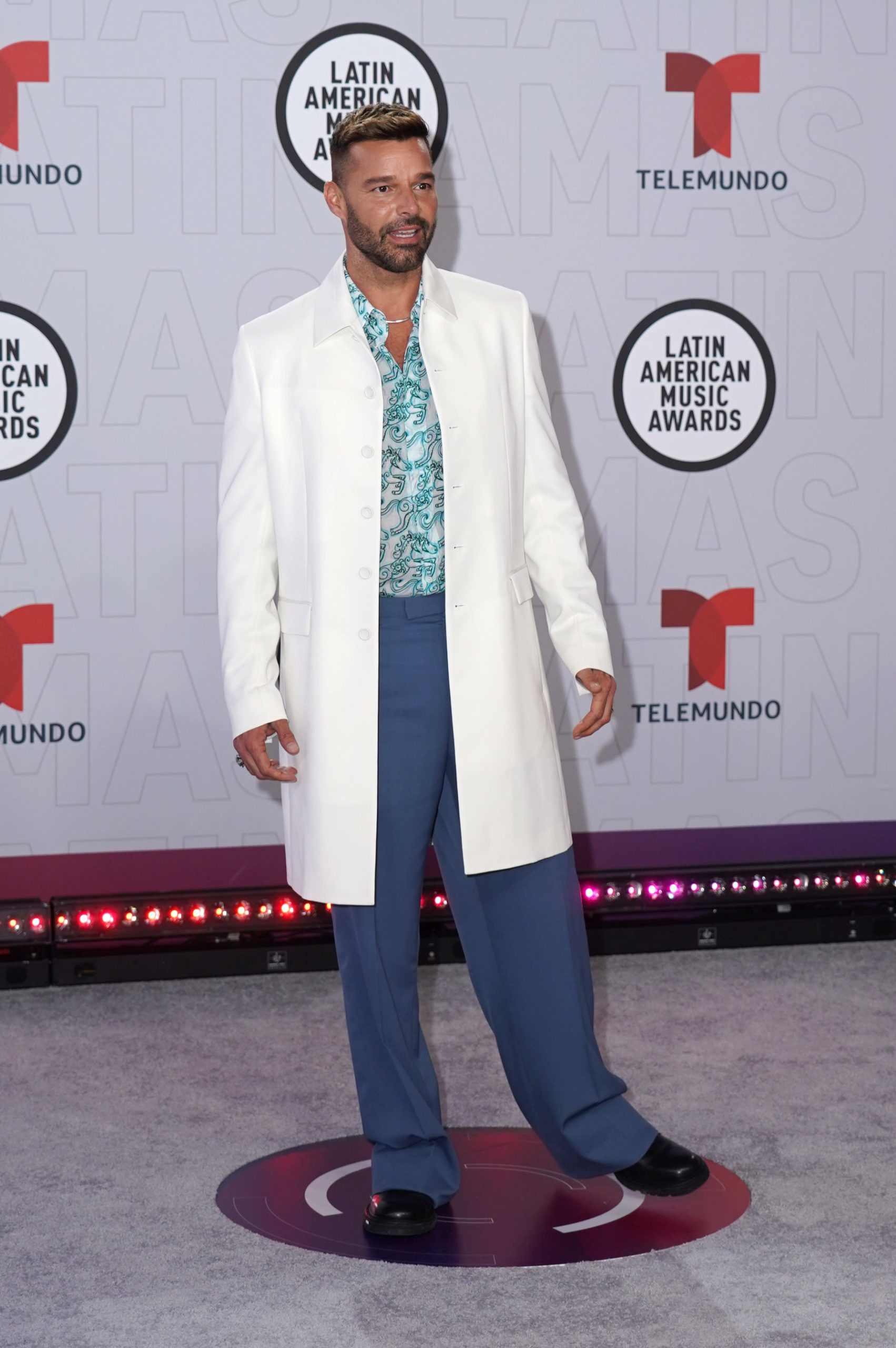 Ricky Martin wore a Dior Pre-Fall 21 men’s collection white wool coat, multi-color Dior and Kenny Scharf print silk shirt, blue wool pants, a Dior and Kenny Scharf earring and Dior Explorer boots.