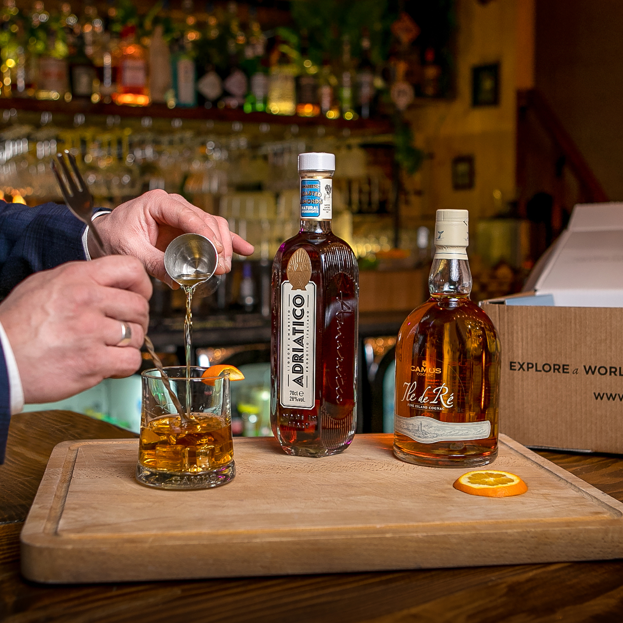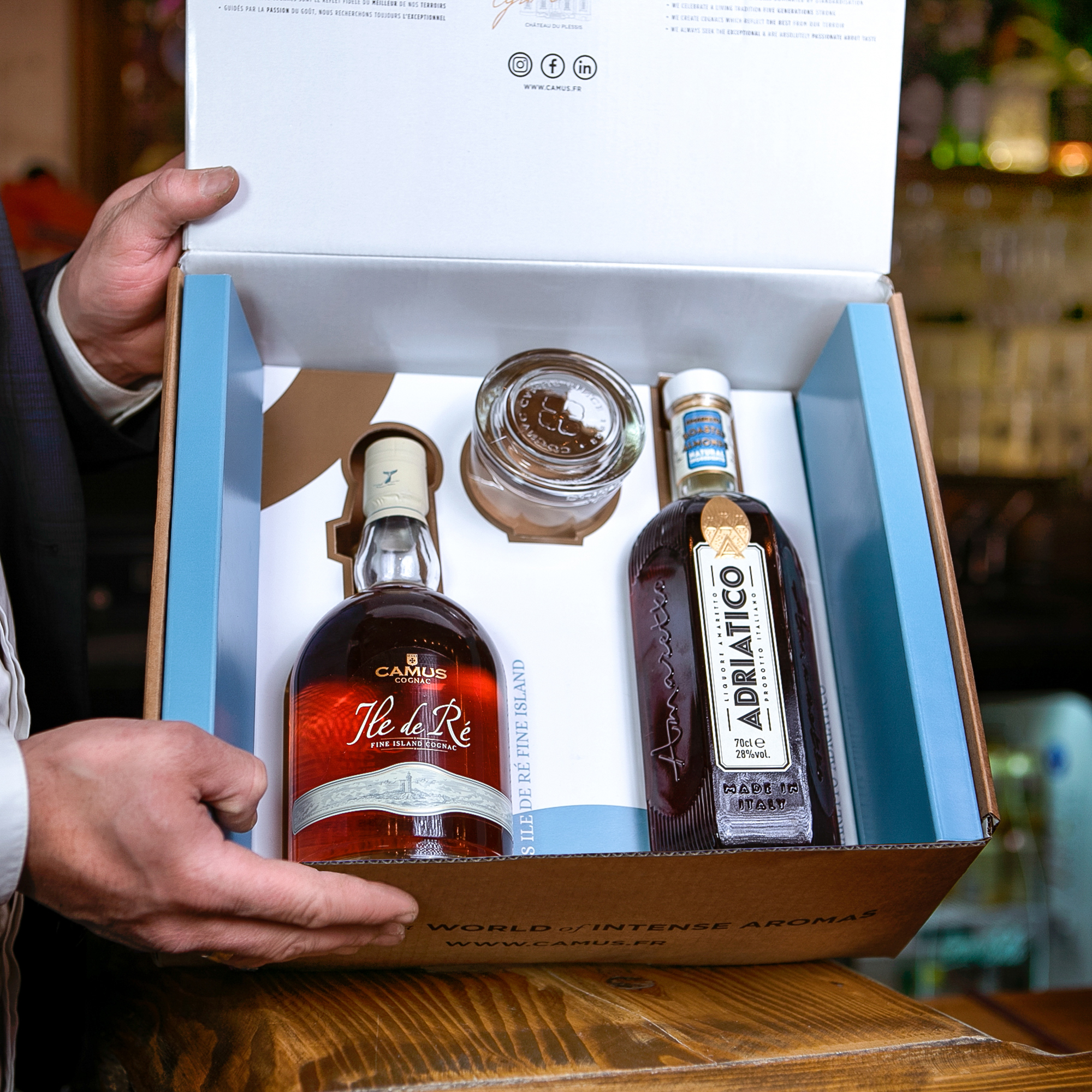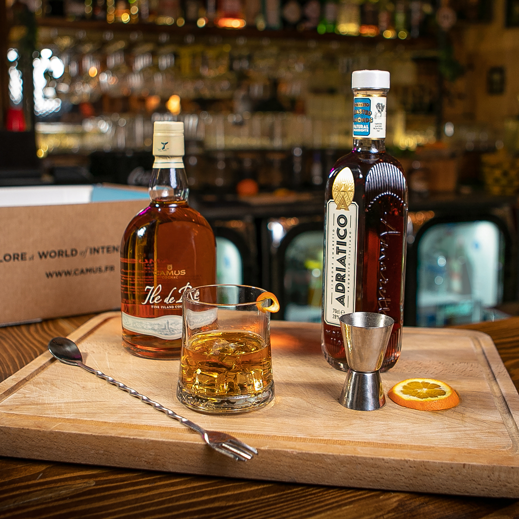Ainsi, tous les éléments indispensables à la réalisation de ce cocktail sont à portée de main : une bouteille de Cognac CAMUS Île de Ré Fine Island, une bouteille d’Amaretto Adriatico, un verre tumbler et une cuillère à cocktail. Il ne manquera plus que quelques glaçons à ajouter !