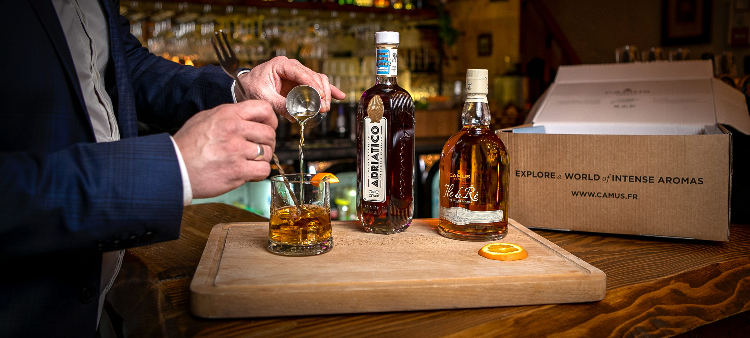 1. Versez 5cl de Cognac CAMUS Île de Ré Fine Island et 5cl d’Amaretto ADRIATICO dans le verre.