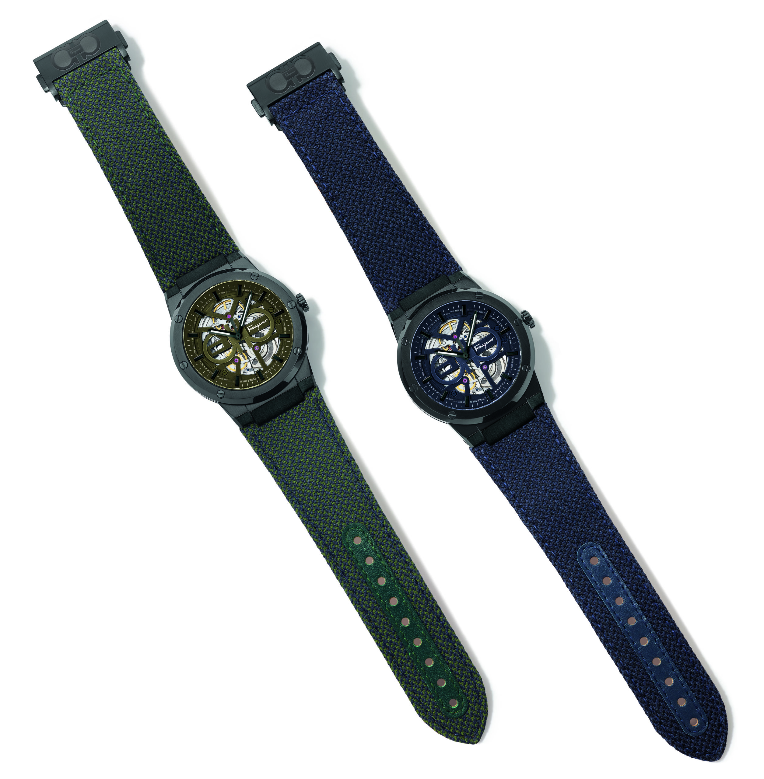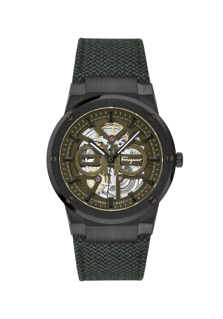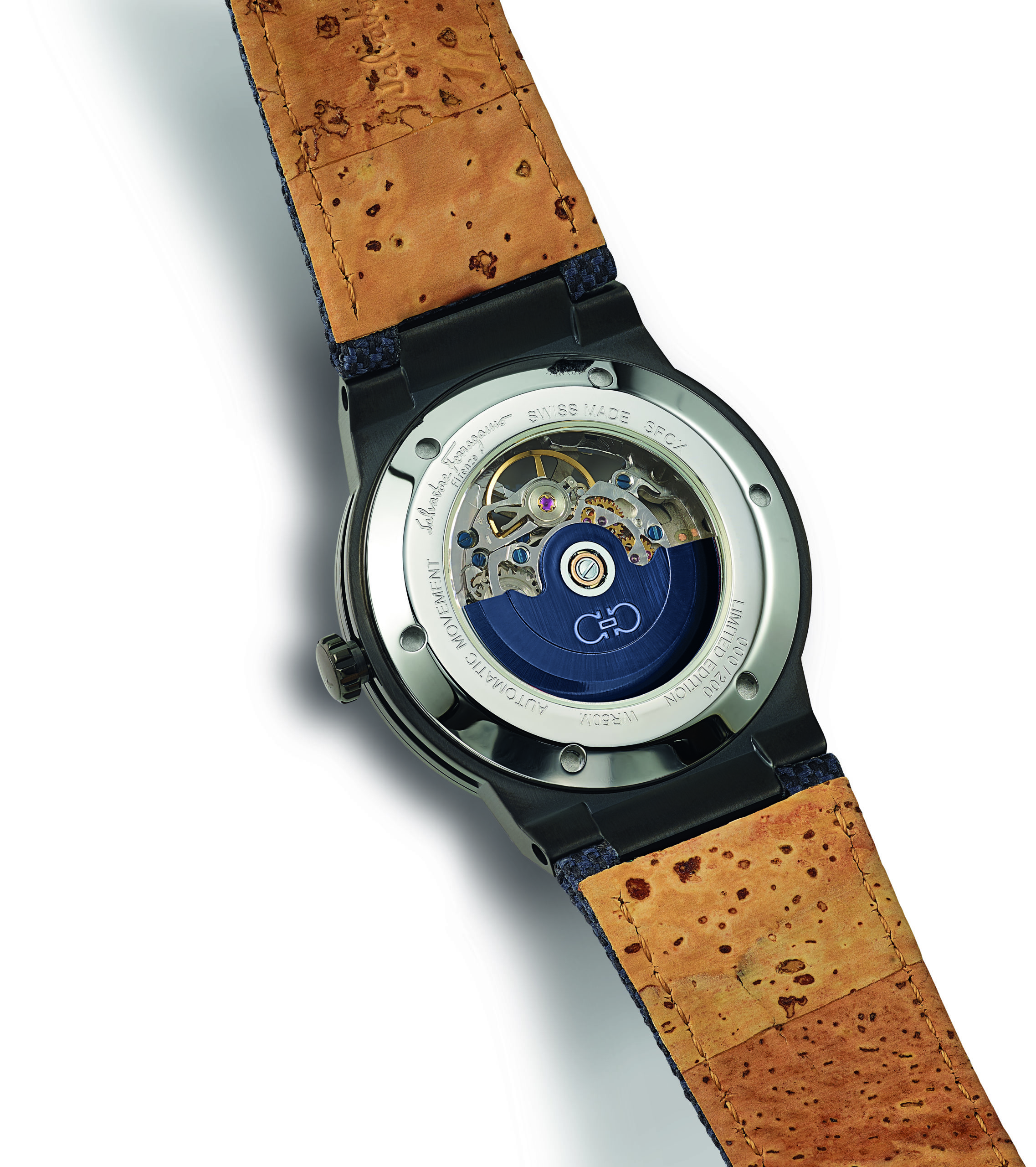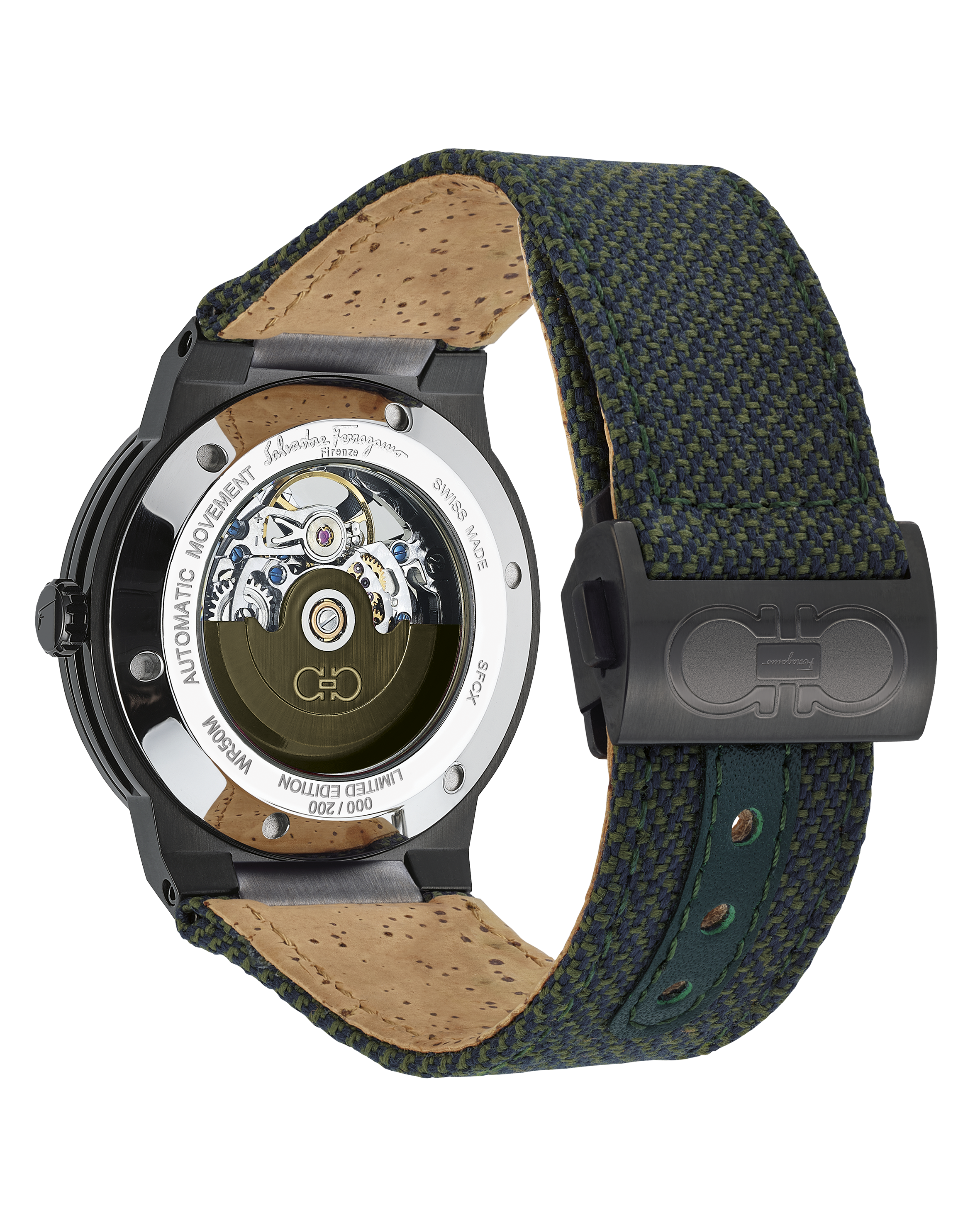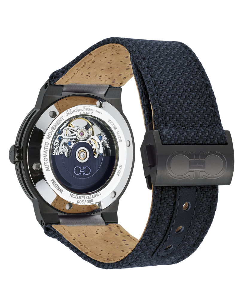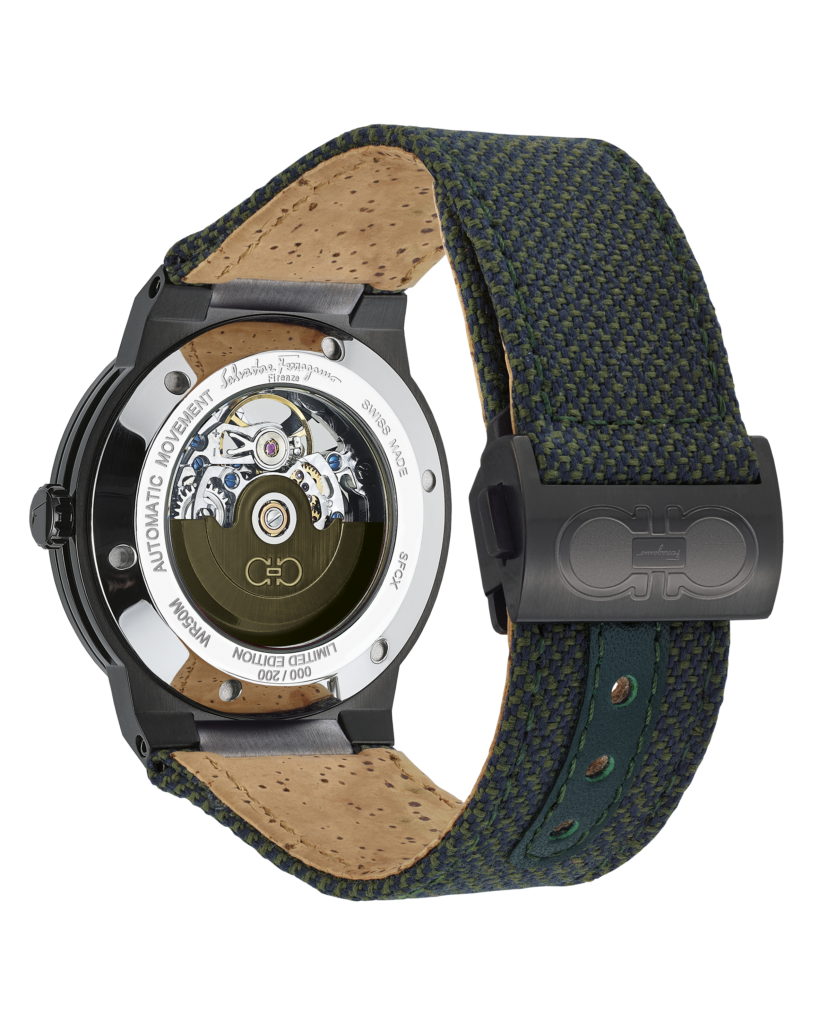 La montre F-80 Skeleton Sustainable est une réédition exclusive et durable de l’un des modèles le plus réussis de la Maison. Disponible en verte et bleue, chacune réalisée en série limitée de 200 exemplaires, son bracelet est composé d’une fine couche de liège certifié FSC et d’un tissu en fibre de PET recyclé post-consommation.