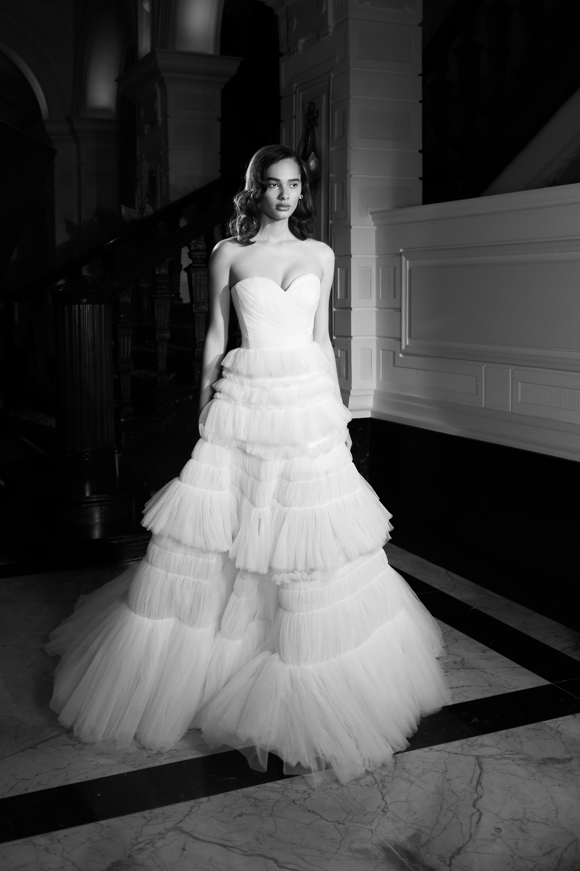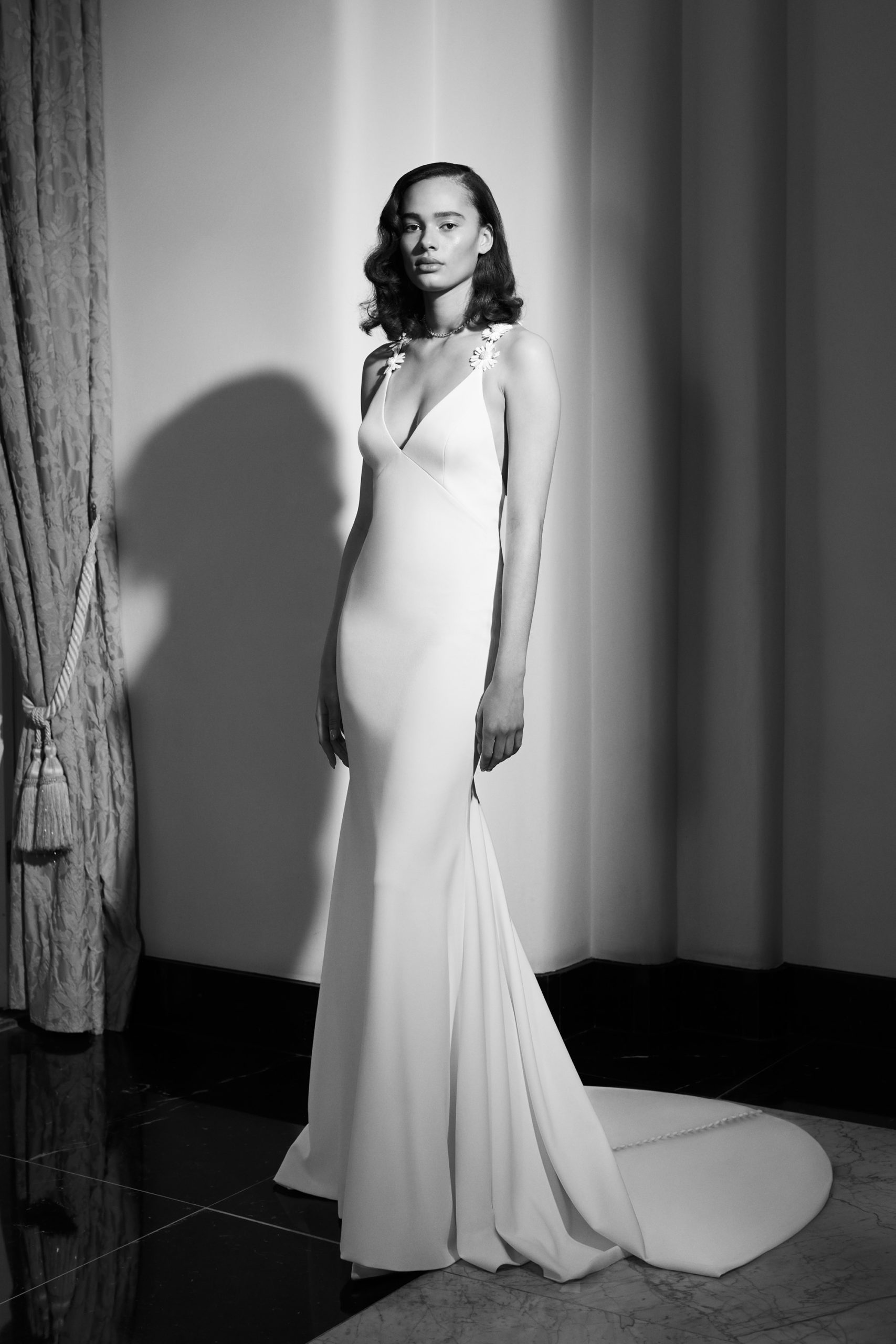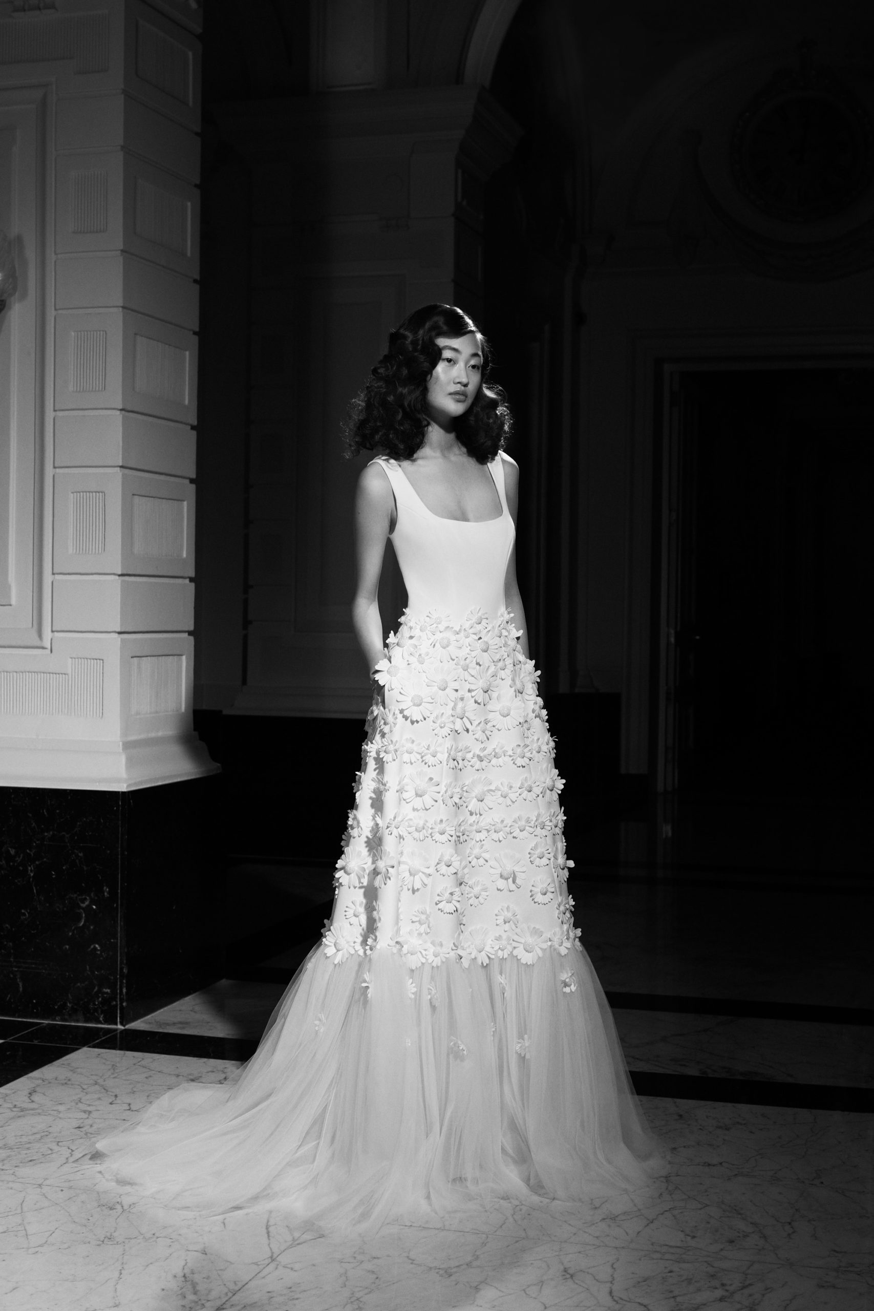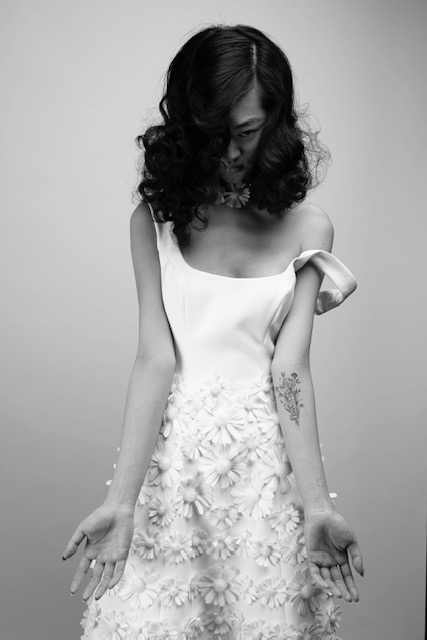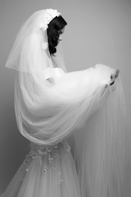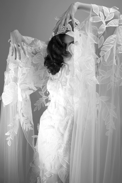 For Mariage Spring/Summer 2022, iconic Viktor&Rolf couture elements such as elaborate signature bows, tiered volants and a cascade of sheer organza and tulle ruffles are reimagined. This season’s offering also consists of a sophisticated range of mermaid gowns with plunging necklines, alluring low-cut back interests, graceful lace flower artworks, delicate fabric covered buttons and 60s daisy embellishments with clear crystal embroidered centers. A selection of garments is crafted out of crepe and mikado with a slight stretch which allows the dress to perfectly mold to the wearer’s body.