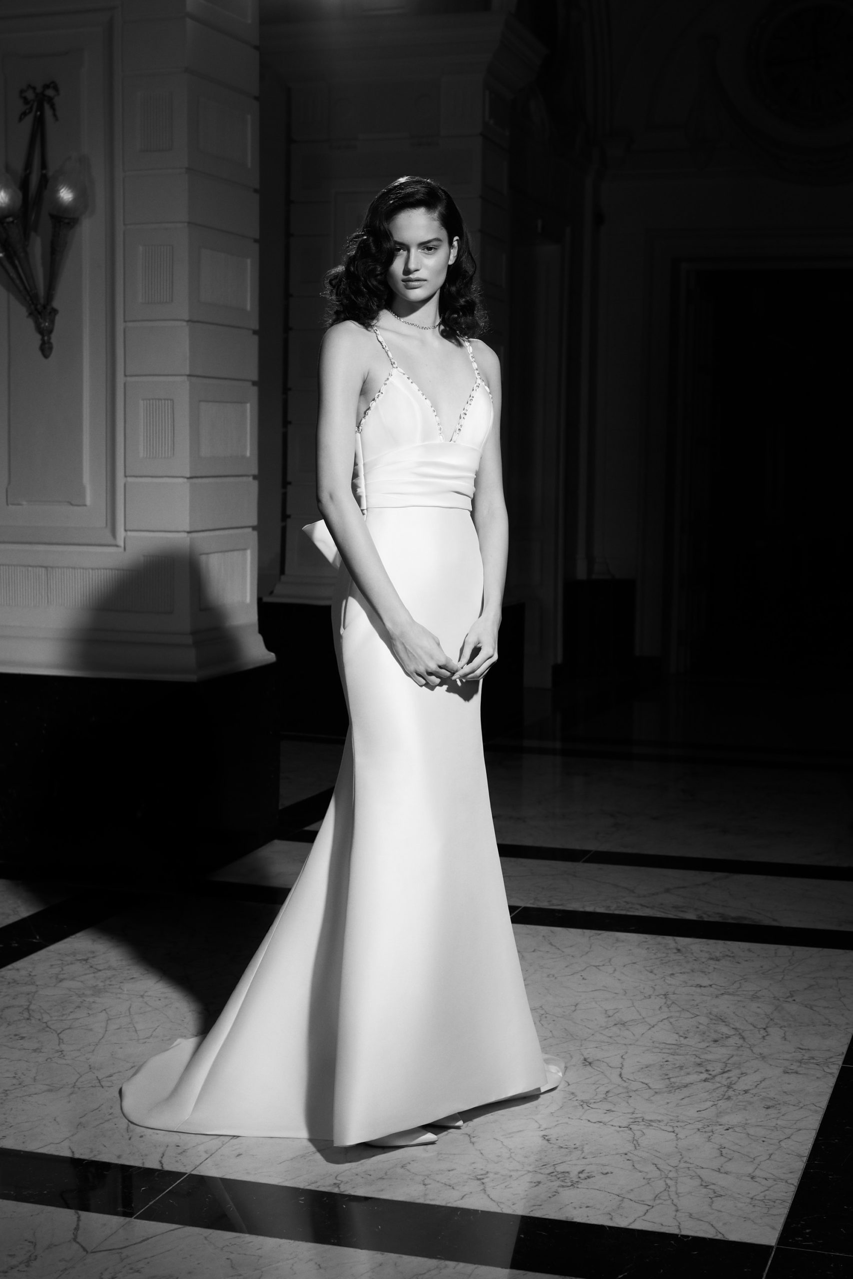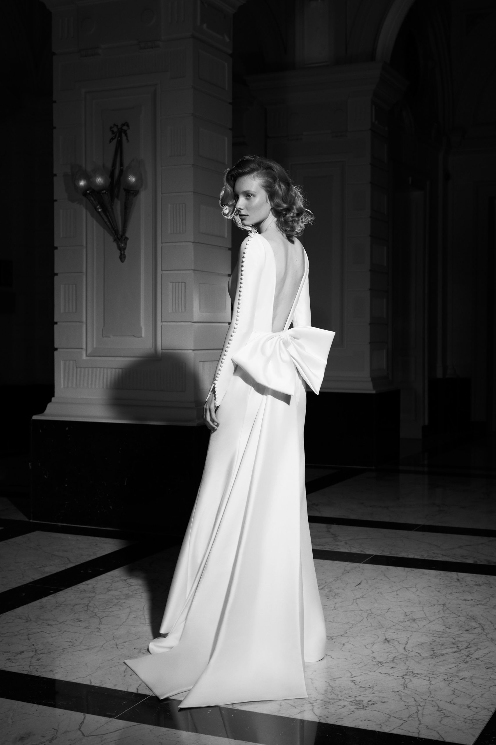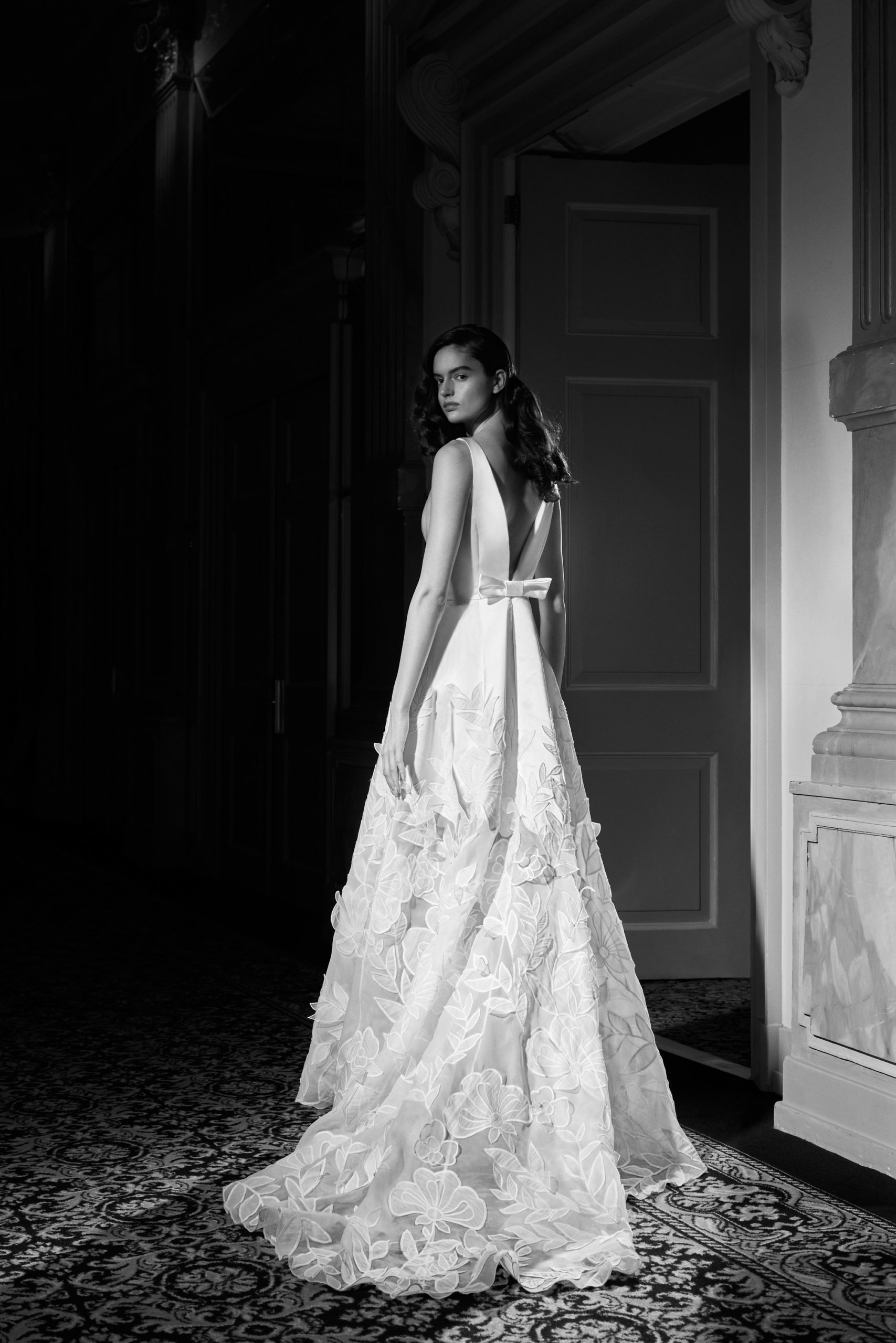 For Mariage Spring/Summer 2022, iconic Viktor&Rolf couture elements such as elaborate signature bows, tiered volants and a cascade of sheer organza and tulle ruffles are reimagined. This season’s offering also consists of a sophisticated range of mermaid gowns with plunging necklines, alluring low-cut back interests, graceful lace flower artworks, delicate fabric covered buttons and 60s daisy embellishments with clear crystal embroidered centers. A selection of garments is crafted out of crepe and mikado with a slight stretch which allows the dress to perfectly mold to the wearer’s body.