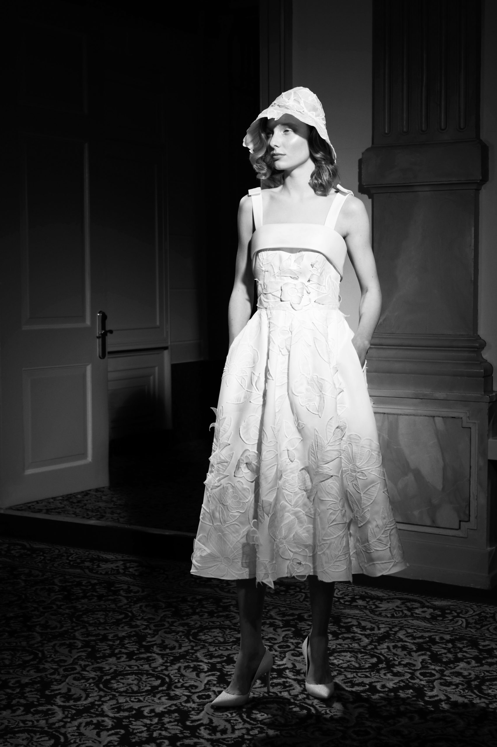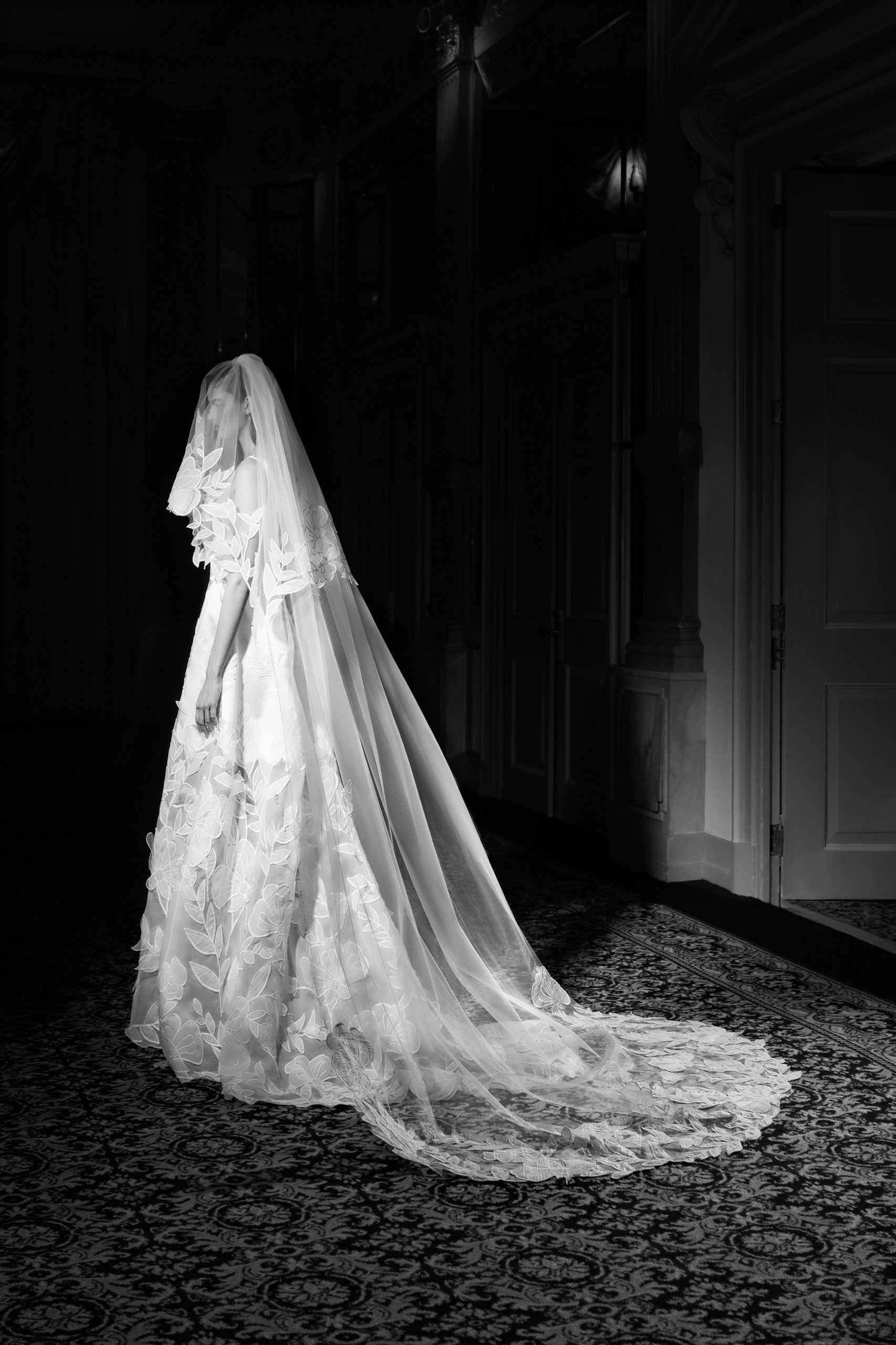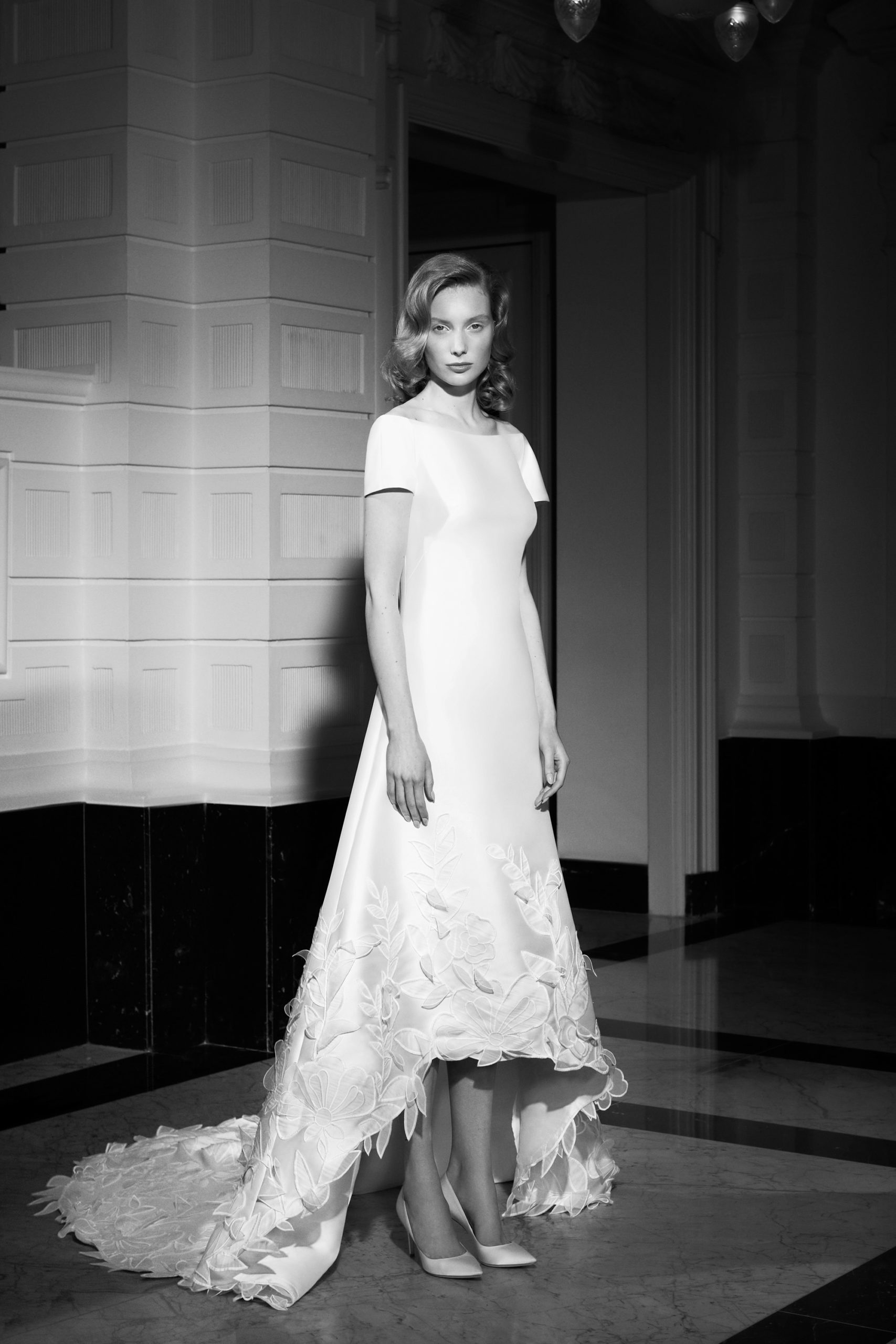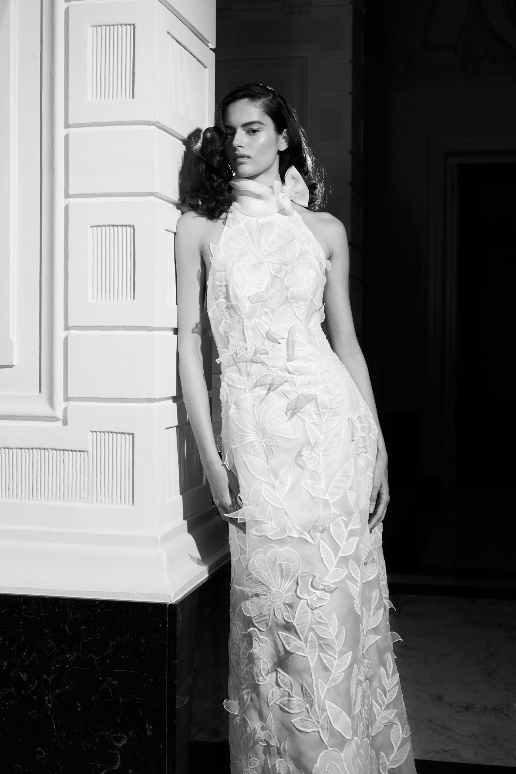 For Mariage Spring/Summer 2022, iconic Viktor&Rolf couture elements such as elaborate signature bows, tiered volants and a cascade of sheer organza and tulle ruffles are reimagined. This season’s offering also consists of a sophisticated range of mermaid gowns with plunging necklines, alluring low-cut back interests, graceful lace flower artworks, delicate fabric covered buttons and 60s daisy embellishments with clear crystal embroidered centers. A selection of garments is crafted out of crepe and mikado with a slight stretch which allows the dress to perfectly mold to the wearer’s body.