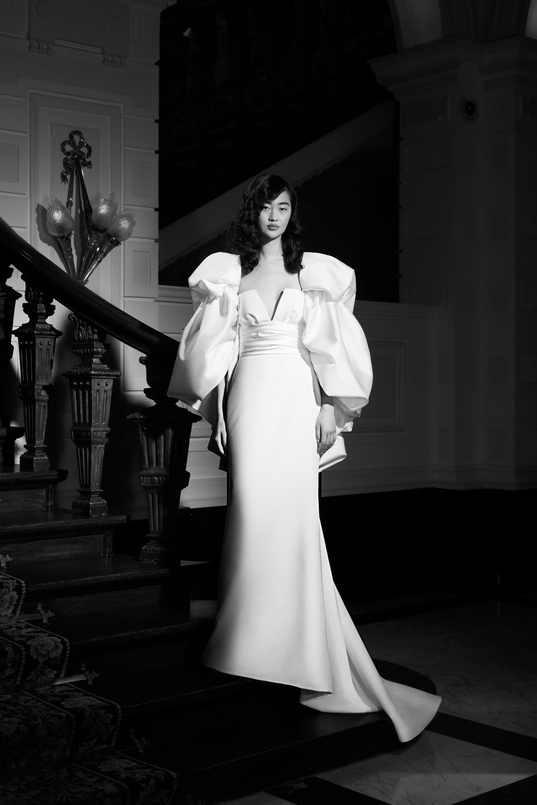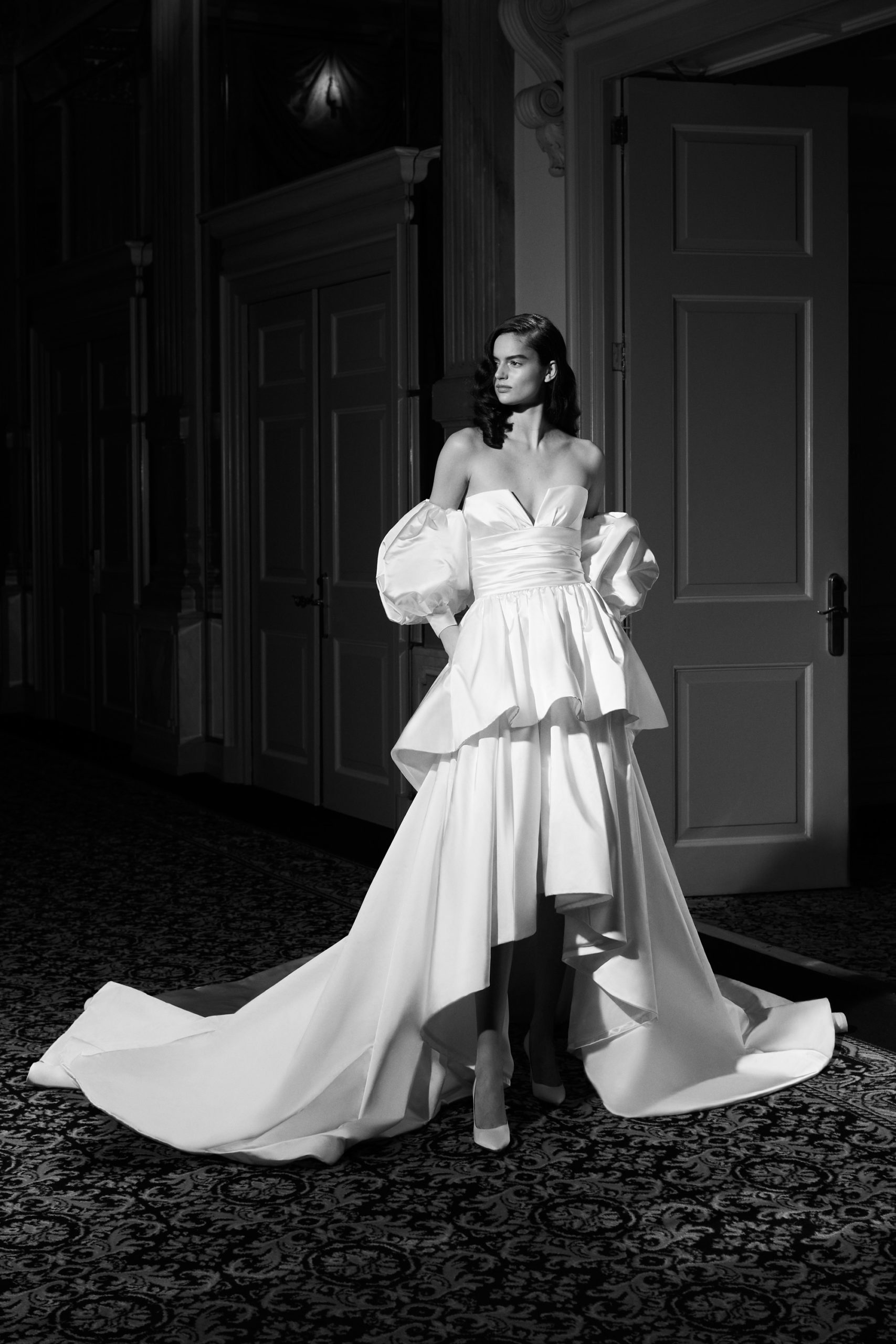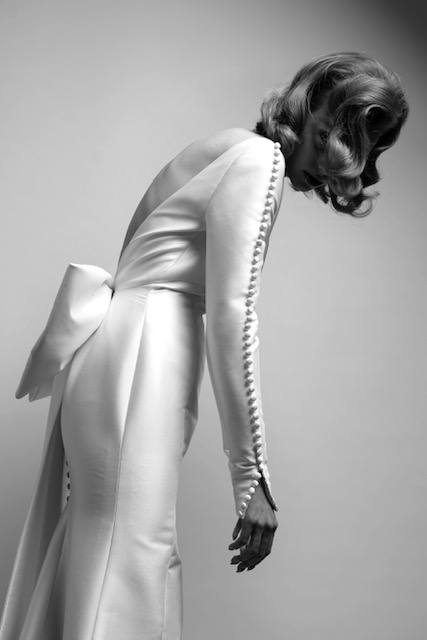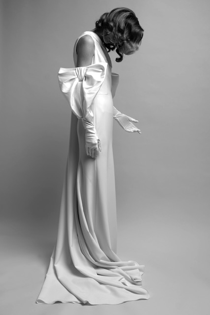 This season’s standout, the ‘Duchesse Drama’: Striking high-low gown crafted out of eco-friendly satin duchesse, featuring a flattering strapless neckline with v-slit. The enlarged detachable puffed sleeves and wide draped waistband transforms into a generous signature bow at the back, accentuating the extravagance of the gown. Tiered volants make up the high-low skirt that gives way to a dramatic train.