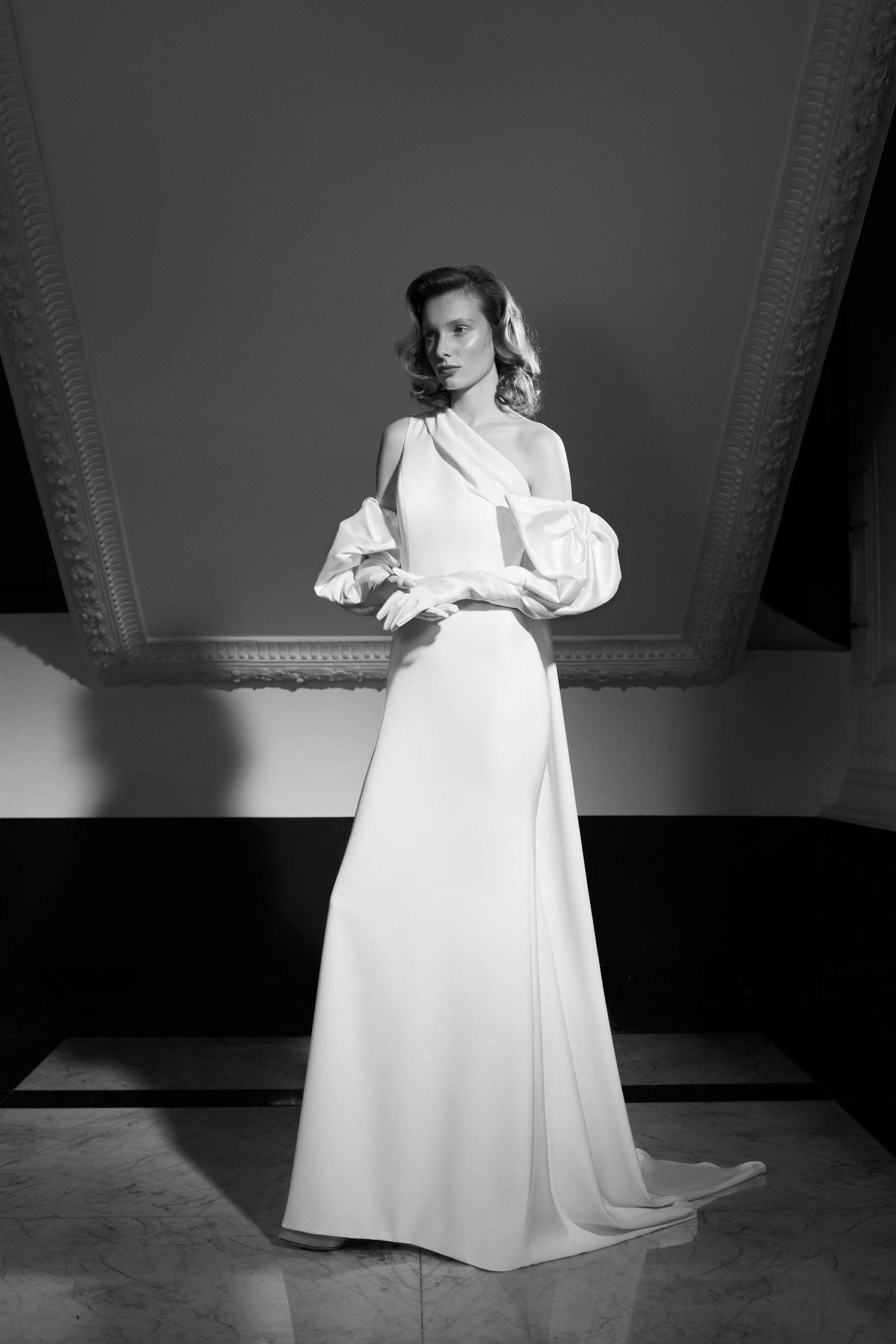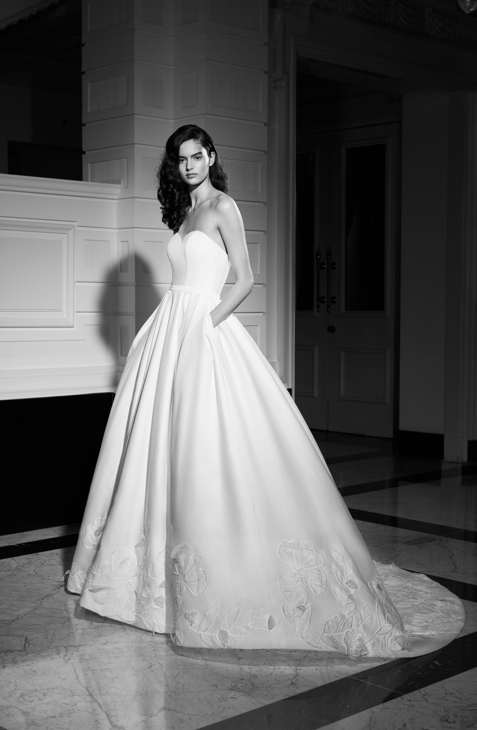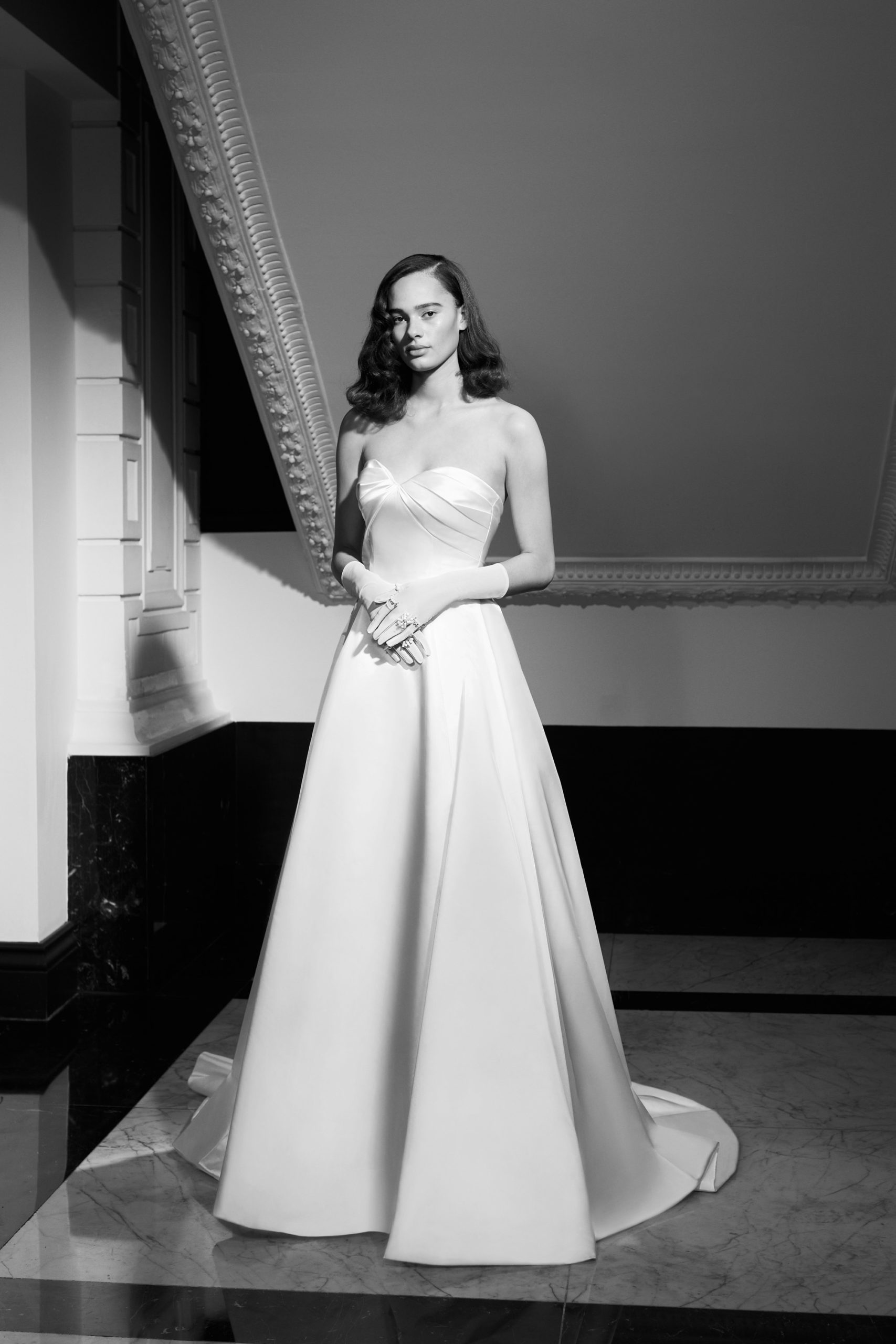This season’s standout, the ‘Duchesse Drama’: Striking high-low gown crafted out of eco-friendly satin duchesse, featuring a flattering strapless neckline with v-slit. The enlarged detachable puffed sleeves and wide draped waistband transforms into a generous signature bow at the back, accentuating the extravagance of the gown. Tiered volants make up the high-low skirt that gives way to a dramatic train.