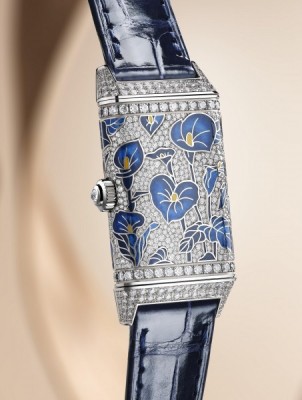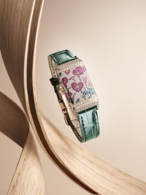 Deux modèles entièrement pavés de diamants sont également rehaussés d’arums : de l’arum violet (sur le boîtier en or rose), symbole de charme et de passion, et de l’arum bleu (sur le boîtier en or gris), symbole de grâce et de raffinement. Sur ces deux montres, les fleurs et les feuilles sont émaillées, et tout le fond est incrusté de diamants en serti neige, une technique pointue qui demande environ une heure pour sertir cinq à six pierres. Au total, le temps de sertissage de ces deux pièces s’élève à 95 heures. Les boîtiers sont parfaitement recouverts du motif floral : du fond à la lunette, sans oublier les courbes et les angles qui supposent une réelle difficulté pour les artisans.