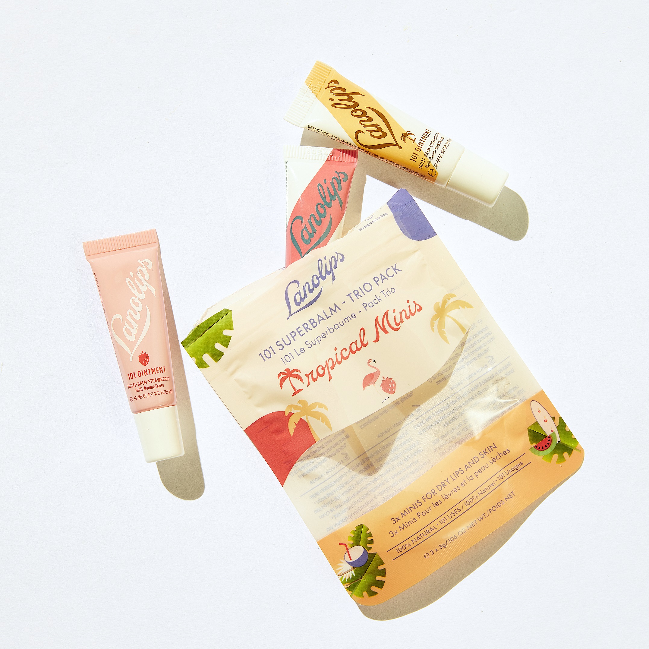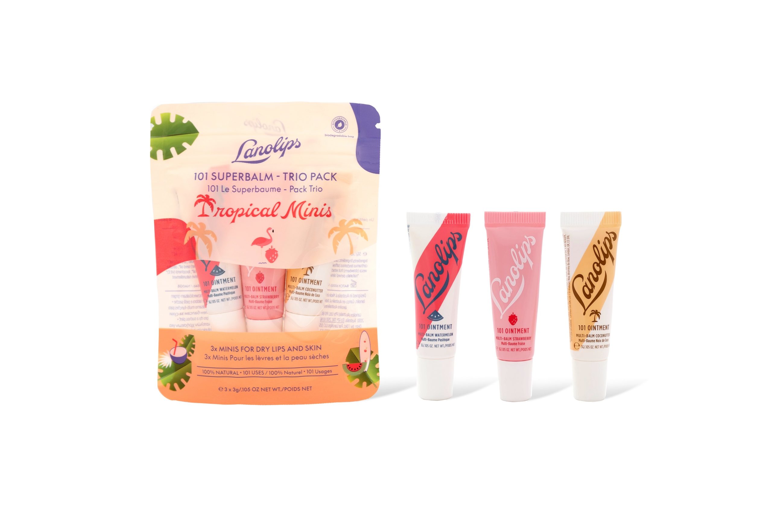 Comme chaque été, LANO propose un pack trio contenant 3 baumes multi-usages 101 en format mini. Cette année, c’est le thème Tropical qui est de mise avec les parfums Pastèque 🍉 (le tout nouveau !), Coco 🥥 et Fraise 🍓 (moins tropique effectivement mais qui sent bon l’été !).