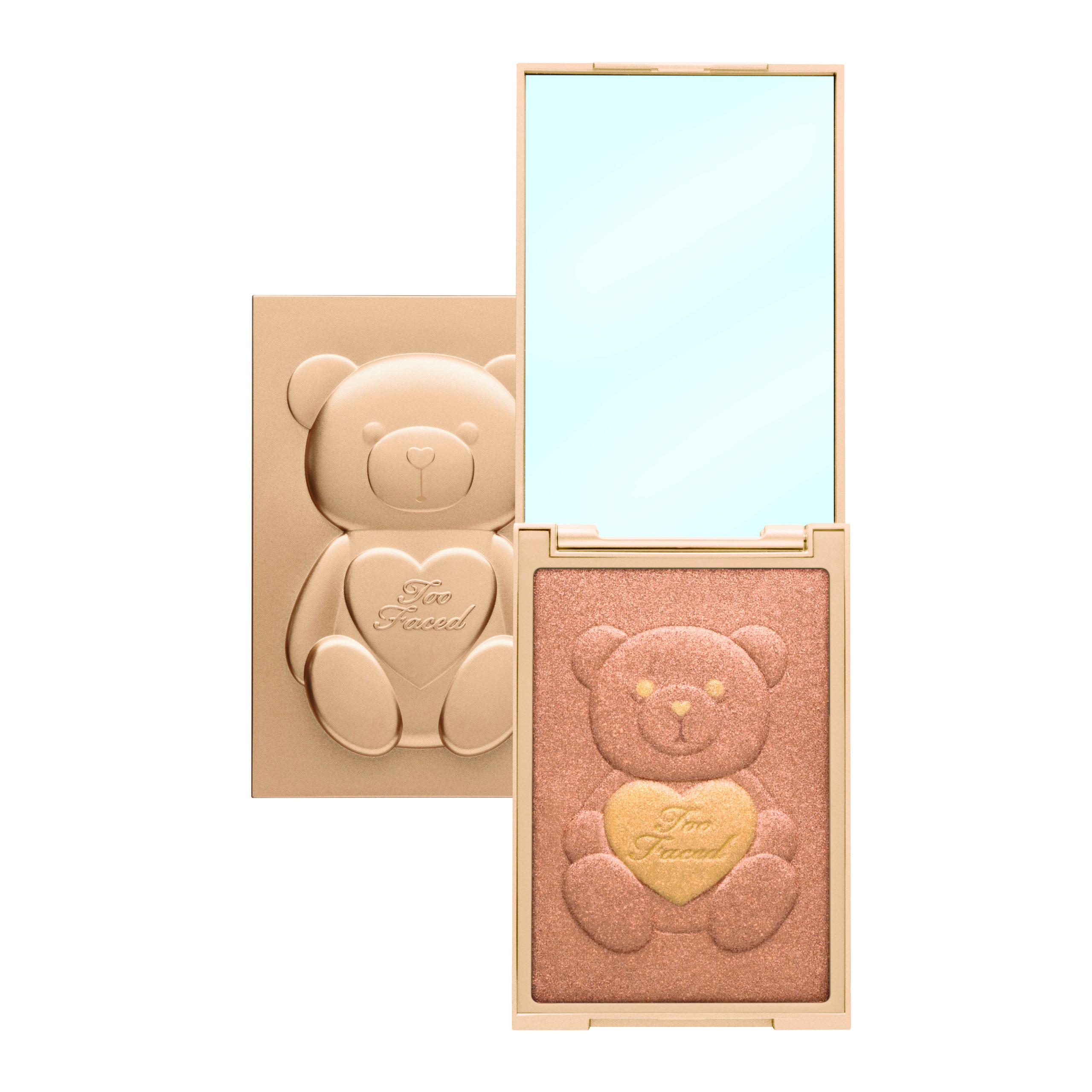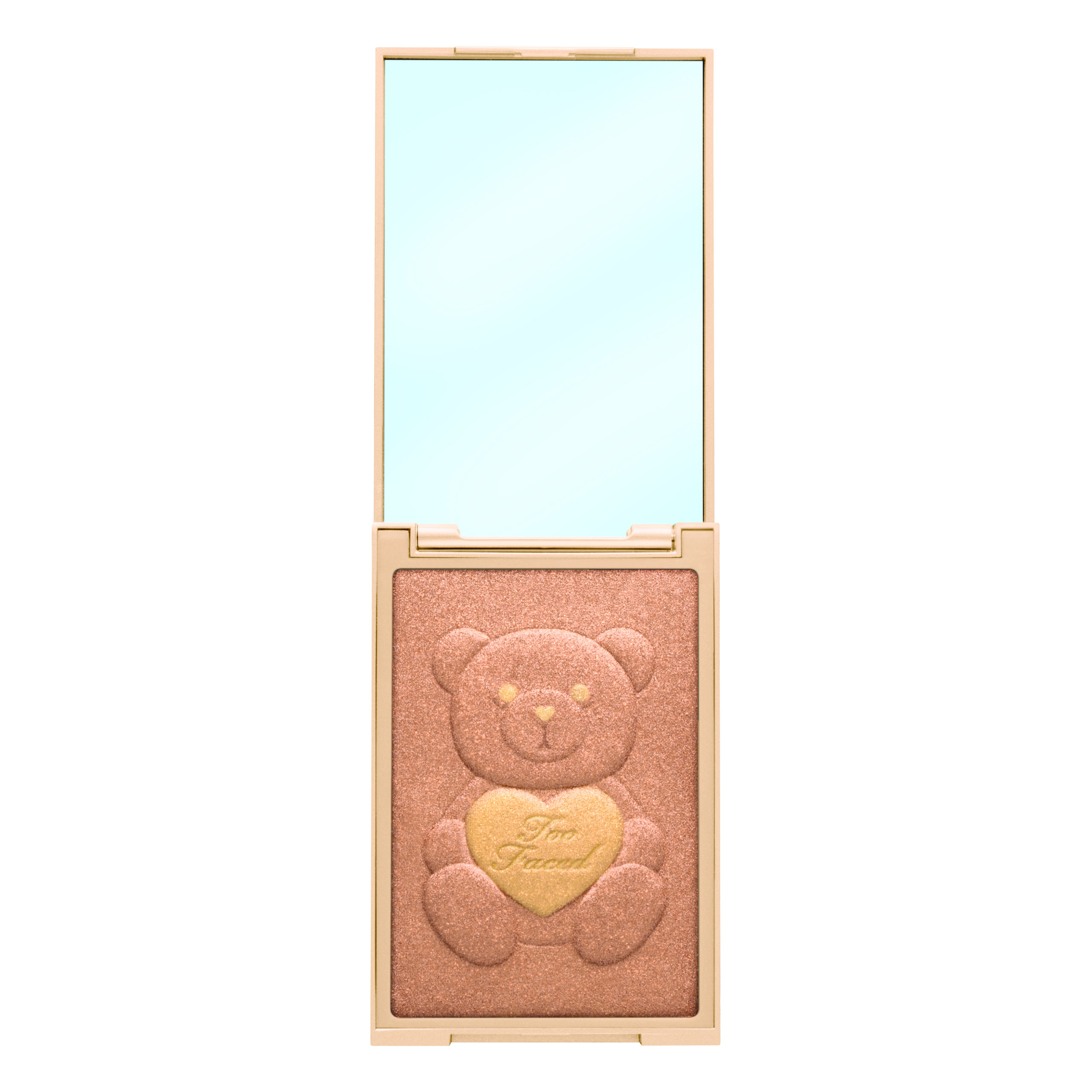 Boîtier rectangulaire champagne nacré avec fermoir avec miroir inclus. Un adorable petit ourson en relief est incrusté sur le couvercle, on le retrouve aussi à l’intérieur sur la poudre.