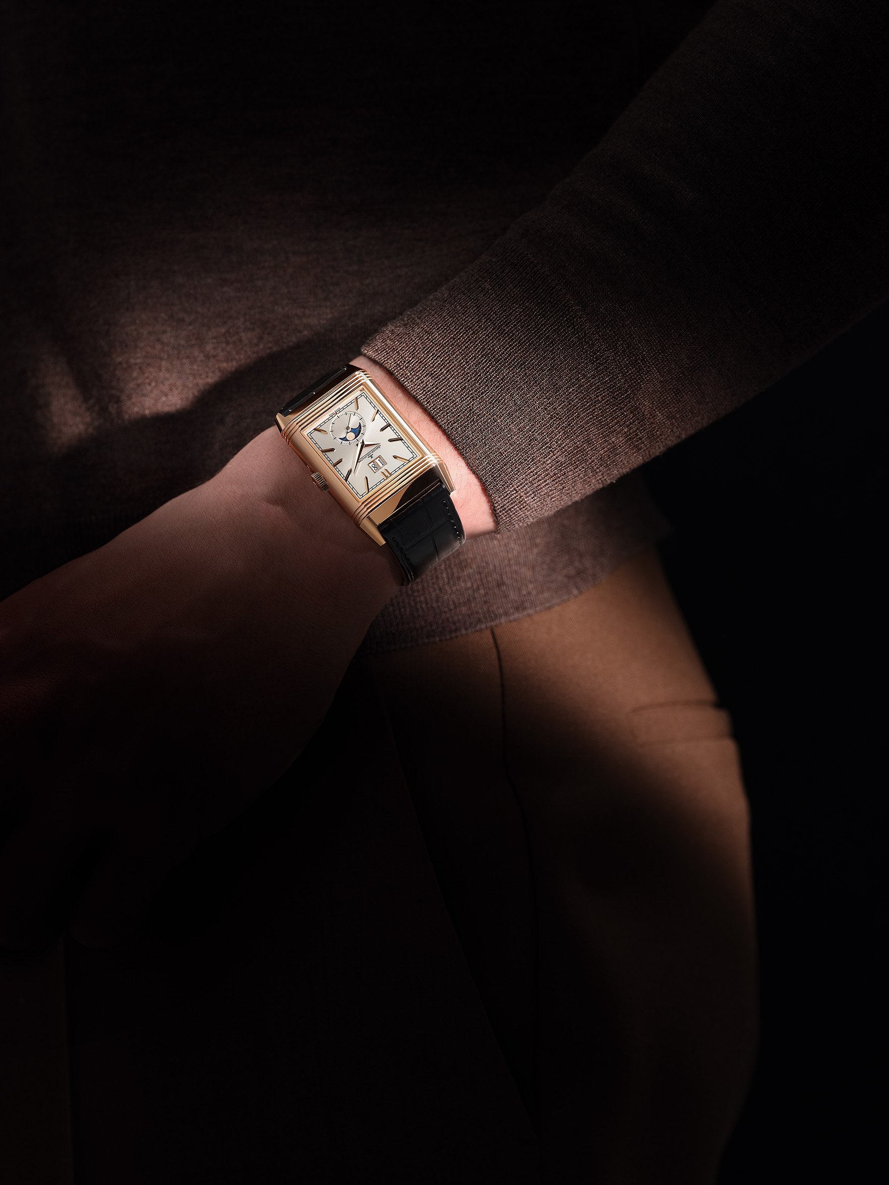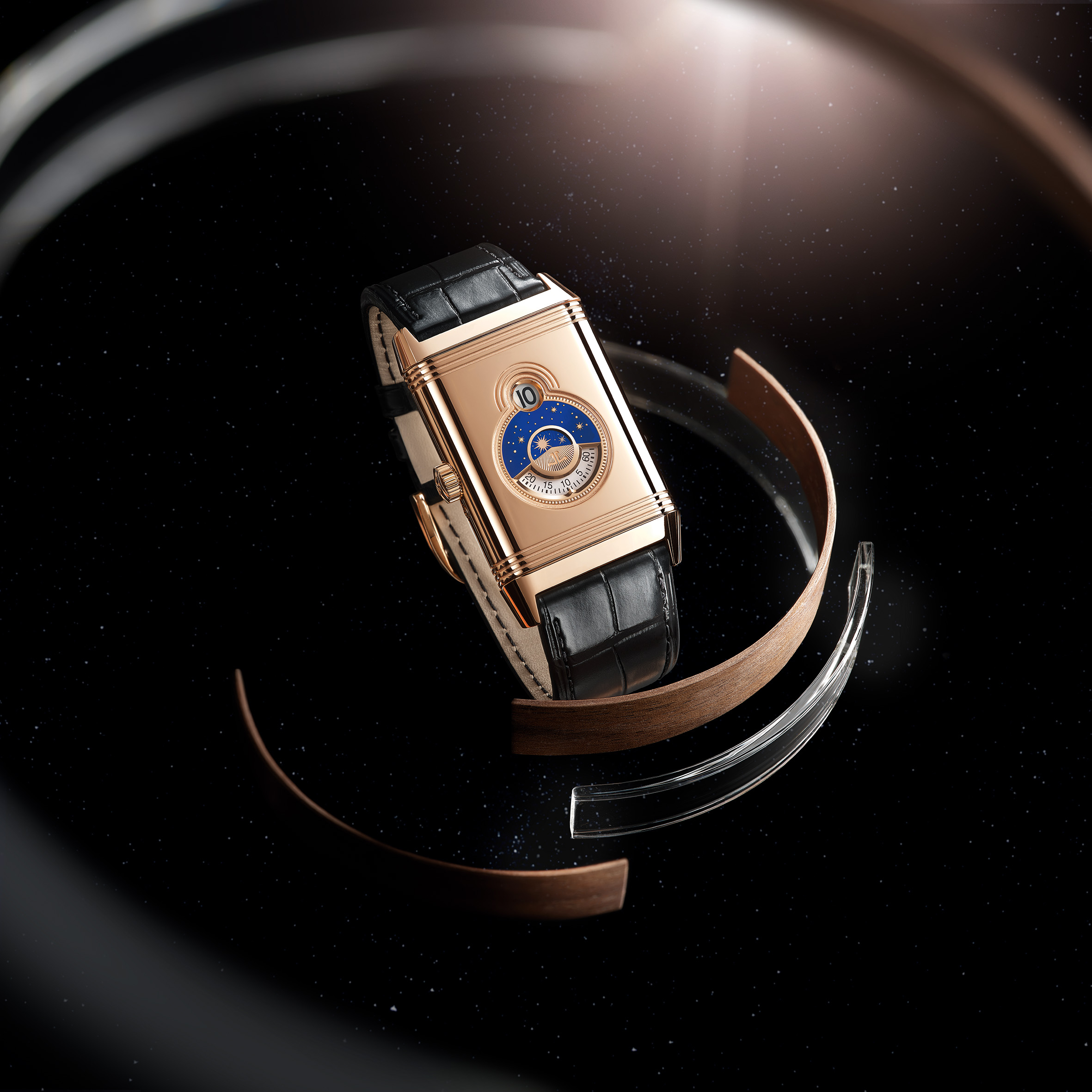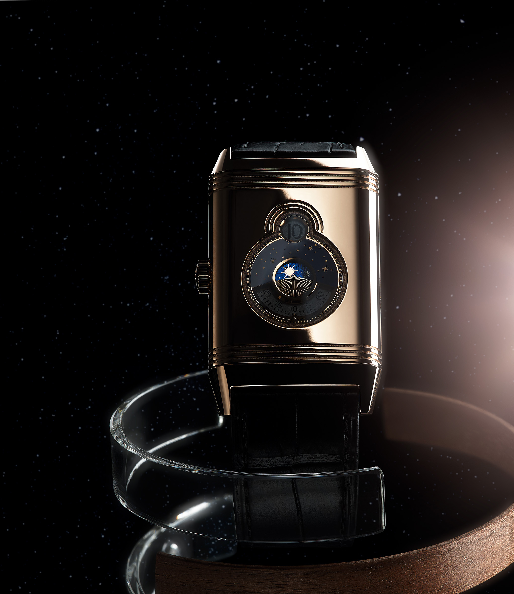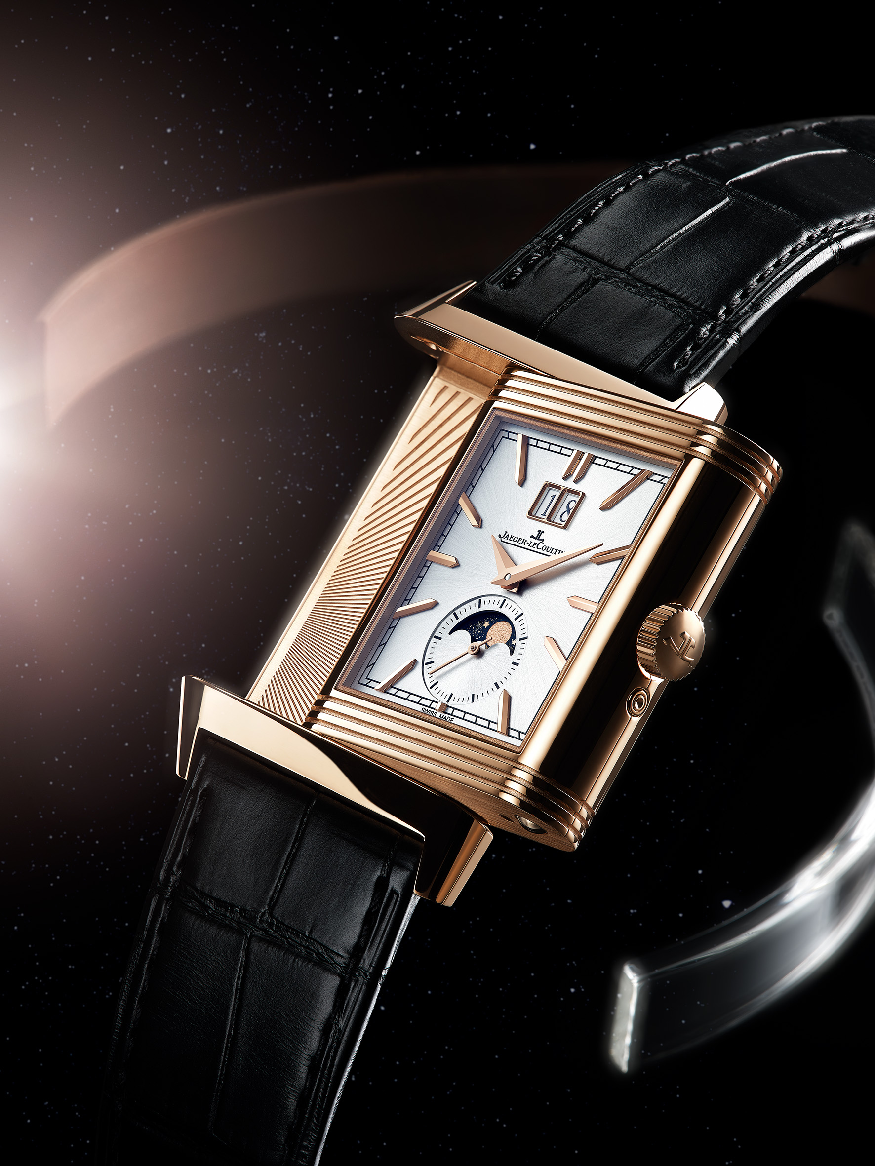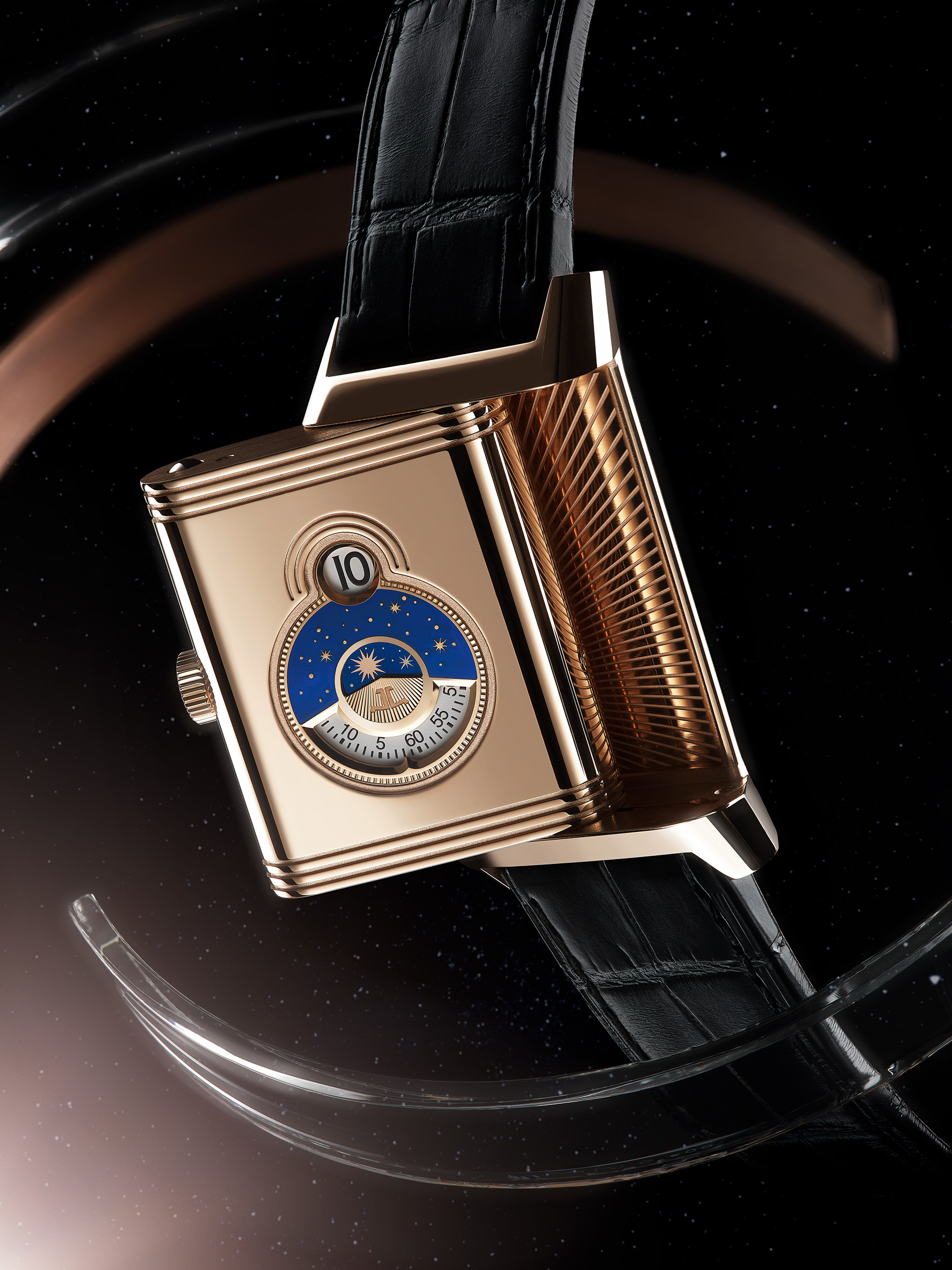 La Nonantième présente un cadran recto empreint de raffinement et d’élégance. Son boîtier en or rose à godrons signature renferme un cadran argenté soleillé, doté d’index appliqués dorés et d’aiguilles Dauphine. Sur la moitié inférieure du cadran, l’affichage phase de lune est situé à l’intérieur du cercle défini par le compteur petite seconde. Placé sous les 12 heures, le large guichet de date est bordé d’un liseré appliqué en or rose, faisant écho à la silhouette rectangulaire du cadran et du boîtier. L’élégance classique du cadran recto ne laisse rien entrevoir de l’étonnant verso de la montre. Ce dernier dévoile une toute nouvelle expression visuelle de certaines des complications horlogères les plus célèbres. À la fois captivant et spectaculaire, ce modèle arbore des détails inédits pour une Reverso. Le fond de boîtier plein en or rose se caractérise par deux ouvertures arrondies, disposées en forme de huit et entourées de godrons évoquant ceux rectilignes des parties supérieure et inférieure du boîtier. La petite ouverture supérieure affiche un indicateur des heures semi-sautant numérique. Cette complication, une première pour la Reverso, rappelle les affichages numériques développés par la Manufacture pour les montres-bracelets dans les années 30.