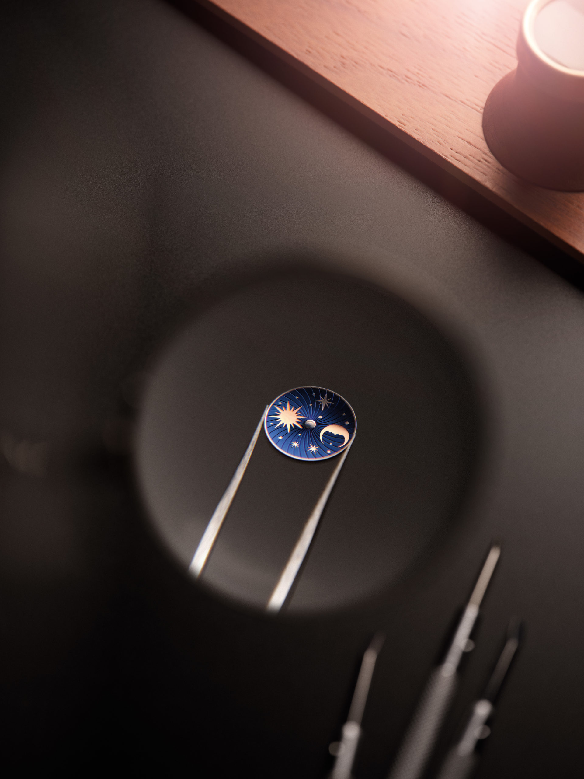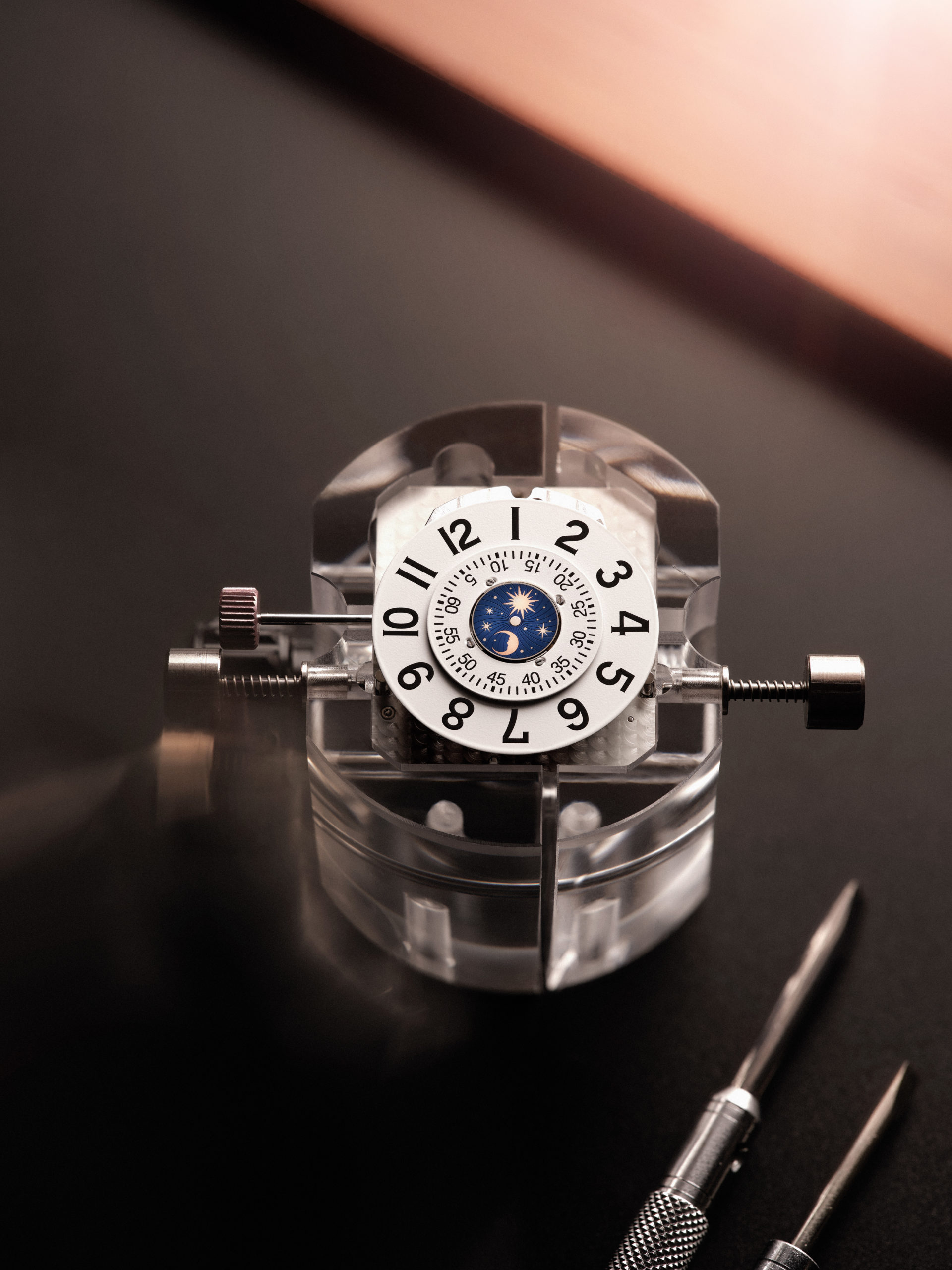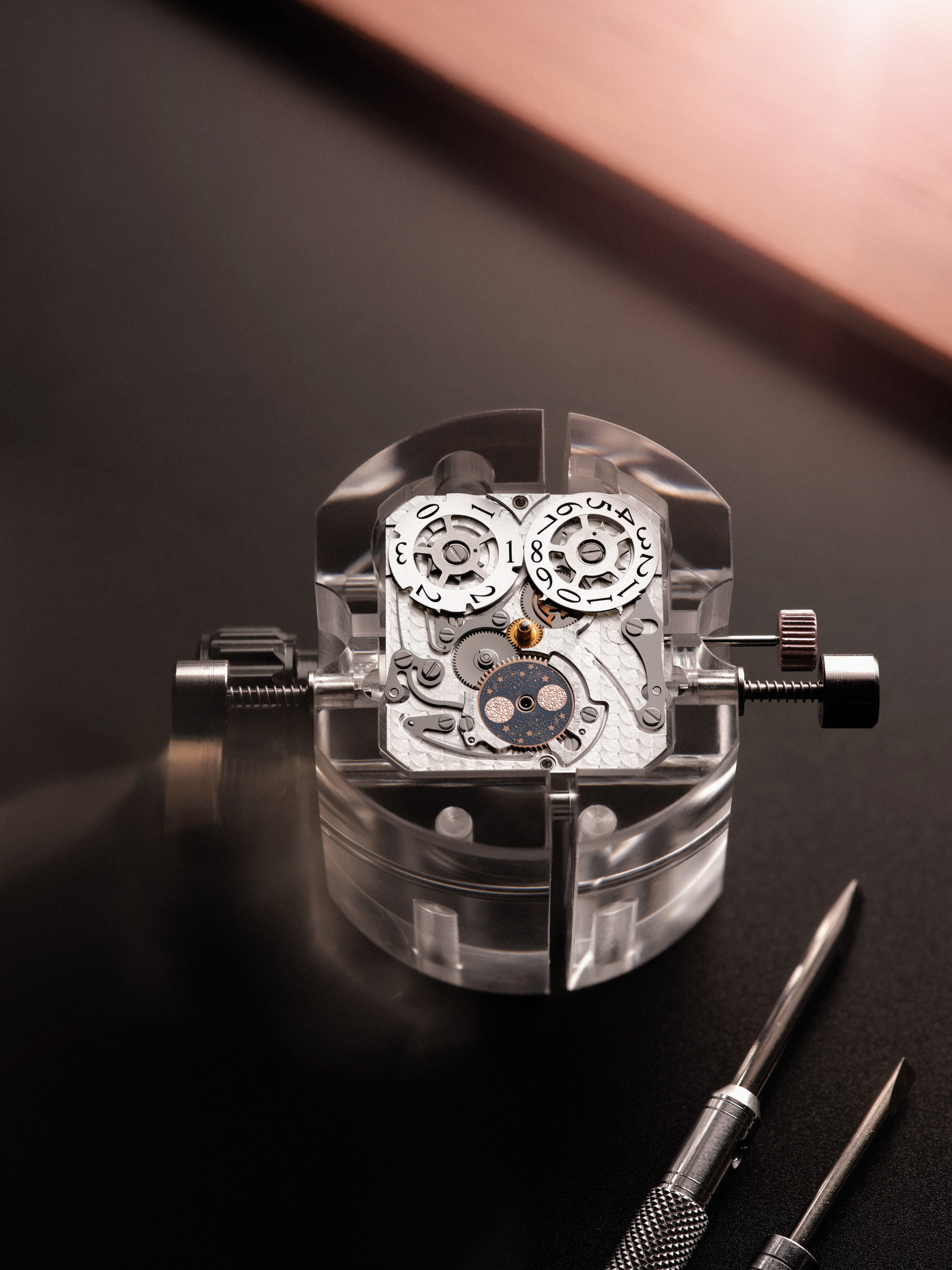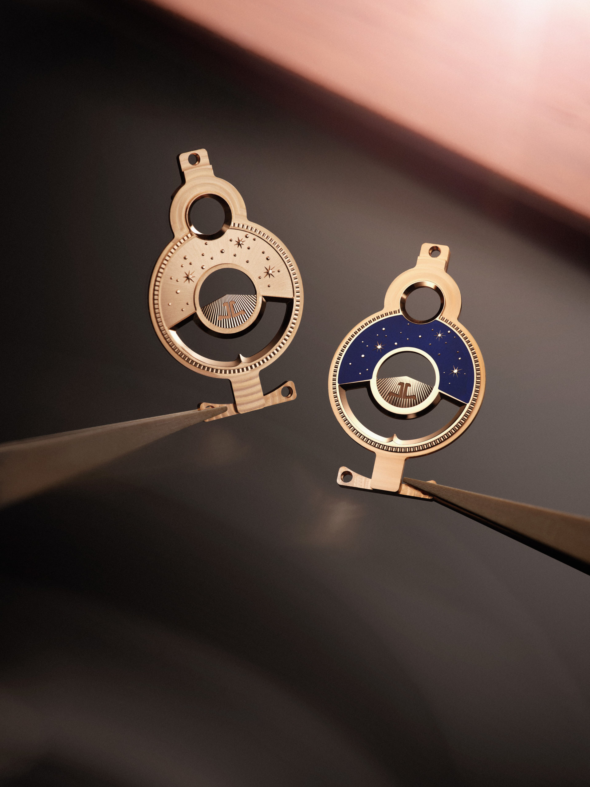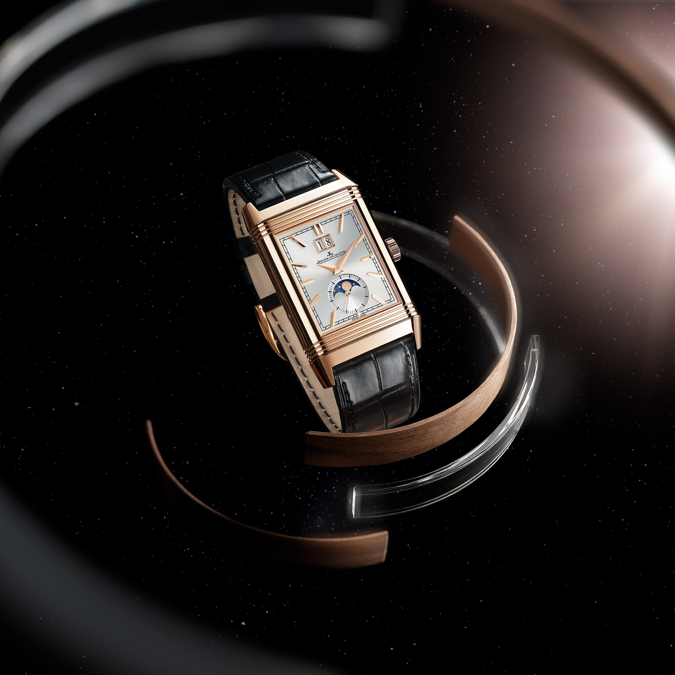 La Nonantième présente un cadran recto empreint de raffinement et d’élégance. Son boîtier en or rose à godrons signature renferme un cadran argenté soleillé, doté d’index appliqués dorés et d’aiguilles Dauphine. Sur la moitié inférieure du cadran, l’affichage phase de lune est situé à l’intérieur du cercle défini par le compteur petite seconde. Placé sous les 12 heures, le large guichet de date est bordé d’un liseré appliqué en or rose, faisant écho à la silhouette rectangulaire du cadran et du boîtier. L’élégance classique du cadran recto ne laisse rien entrevoir de l’étonnant verso de la montre. Ce dernier dévoile une toute nouvelle expression visuelle de certaines des complications horlogères les plus célèbres. À la fois captivant et spectaculaire, ce modèle arbore des détails inédits pour une Reverso. Le fond de boîtier plein en or rose se caractérise par deux ouvertures arrondies, disposées en forme de huit et entourées de godrons évoquant ceux rectilignes des parties supérieure et inférieure du boîtier. La petite ouverture supérieure affiche un indicateur des heures semi-sautant numérique. Cette complication, une première pour la Reverso, rappelle les affichages numériques développés par la Manufacture pour les montres-bracelets dans les années 30.