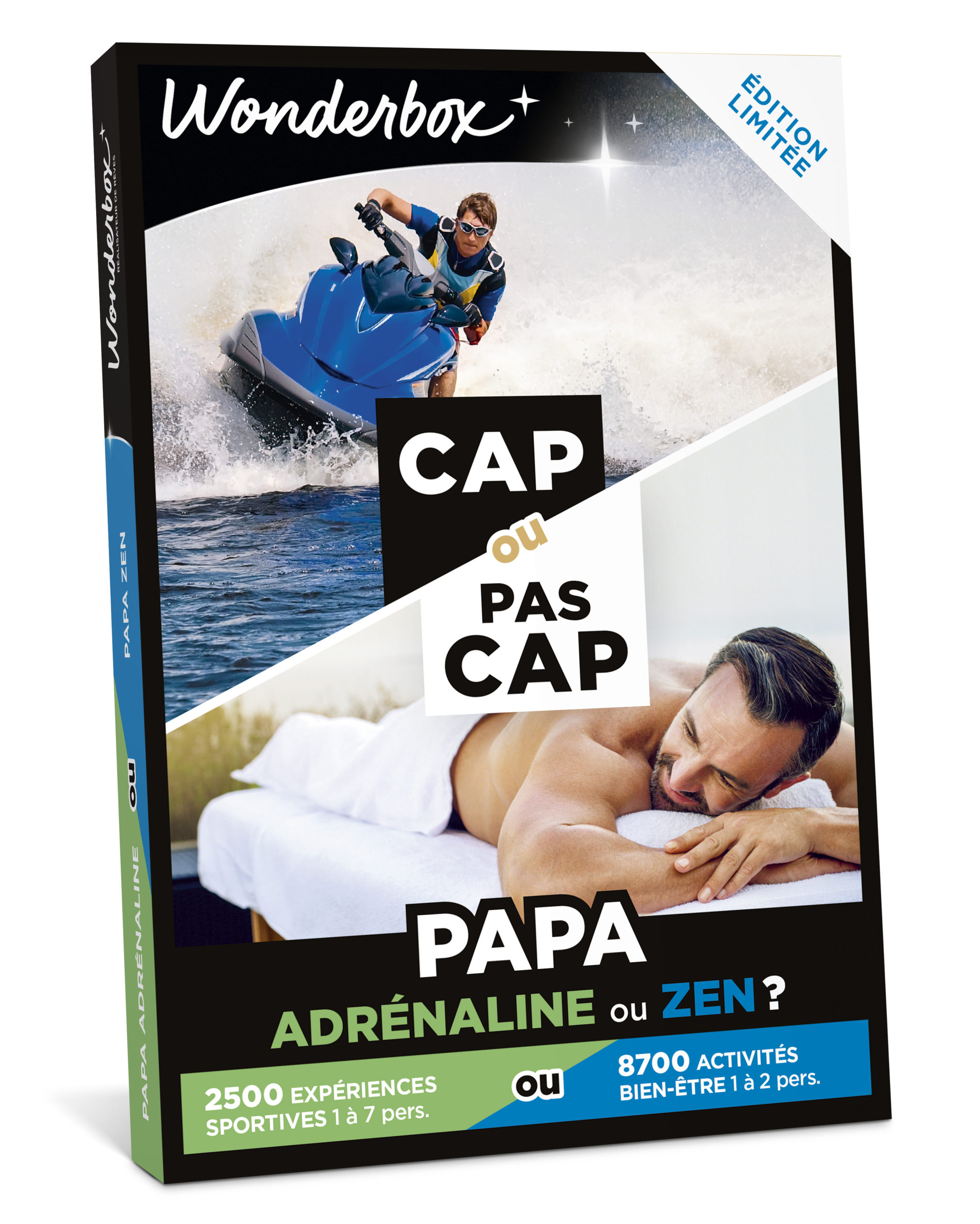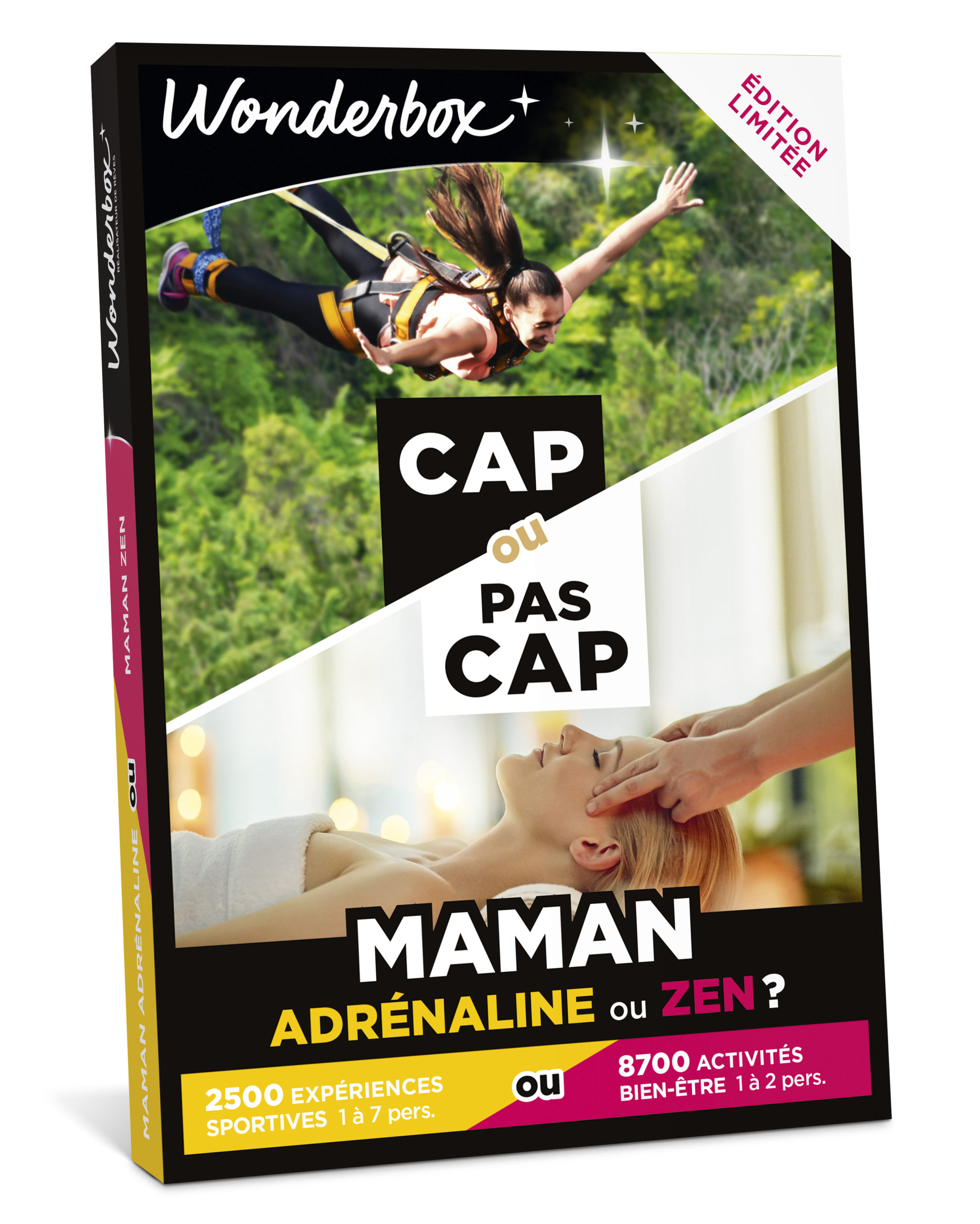 Pour les plus courageuses : CAP OU PAS CAP – Maman adrénaline ou zen ? 2500 expériences sportives ou 8700 activités bien-être. Défiez votre Wonder-maman avec ce coffret inédit aux challenges 100% gagnants ! Un concept original qui lui permet de choisir entre une activité à sensations et un instant zen. Saut à l’élastique ou massage relaxant, pilotage d’un bolide ou soin du visage, via ferrata ou balnéothérapie… Entre pression et décompression, le plaisir sera en tout cas au rendez-vous avec son lot d’émotions ! Alors, la meilleure des mamans sera-t-elle cap ou pas cap ?