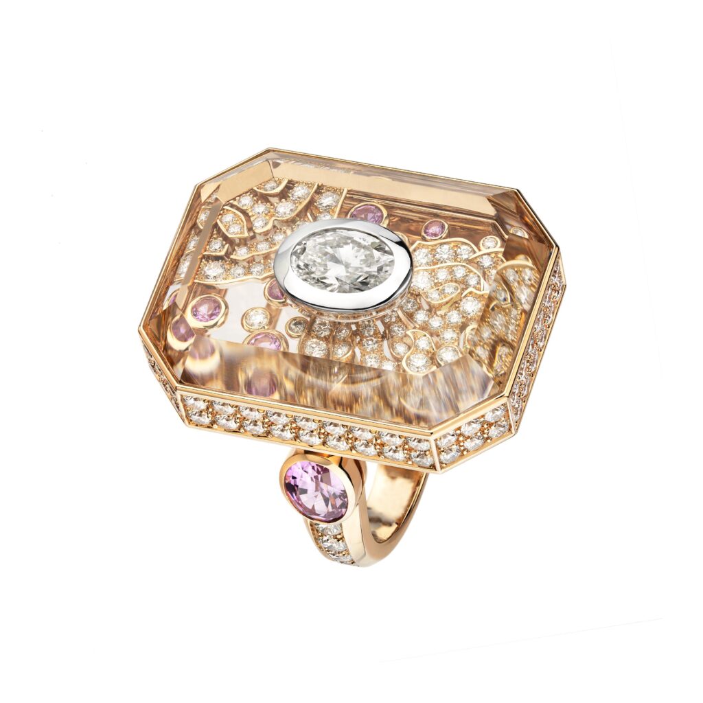 De ces flacons aux lignes aériennes s’échappent des larmes de diamants poire et de morganites rosées qui coulent sur la peau, telles des gouttes de parfum divin.