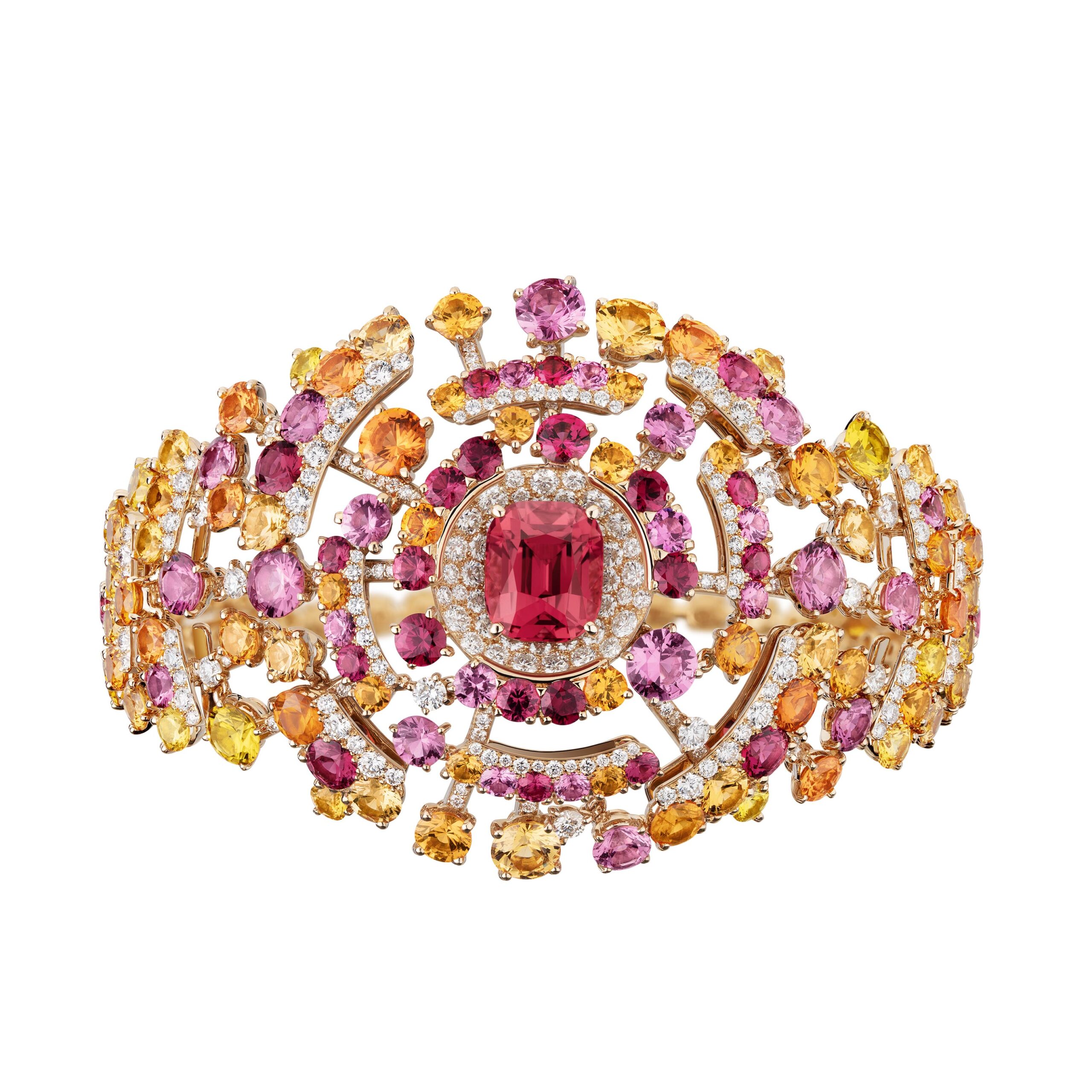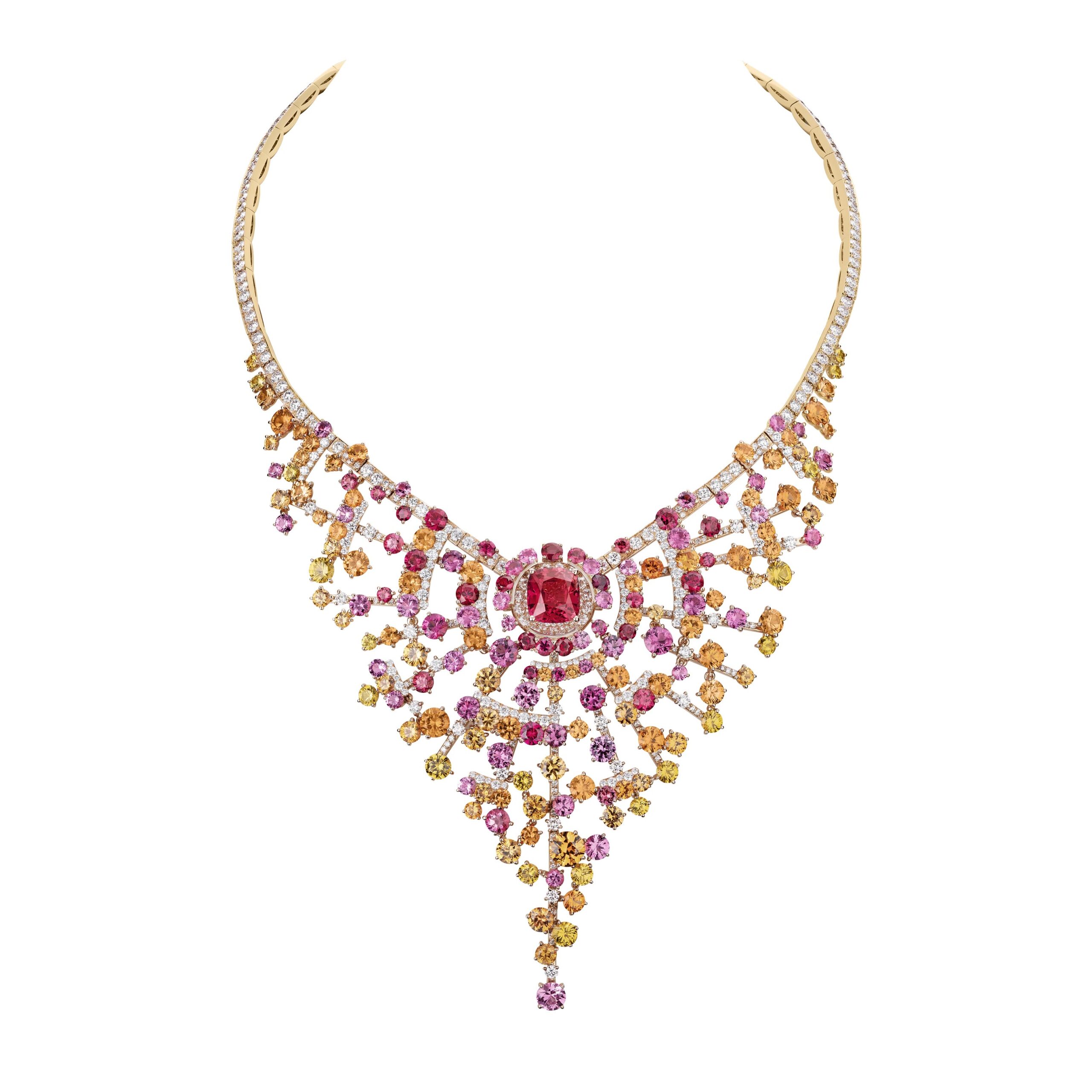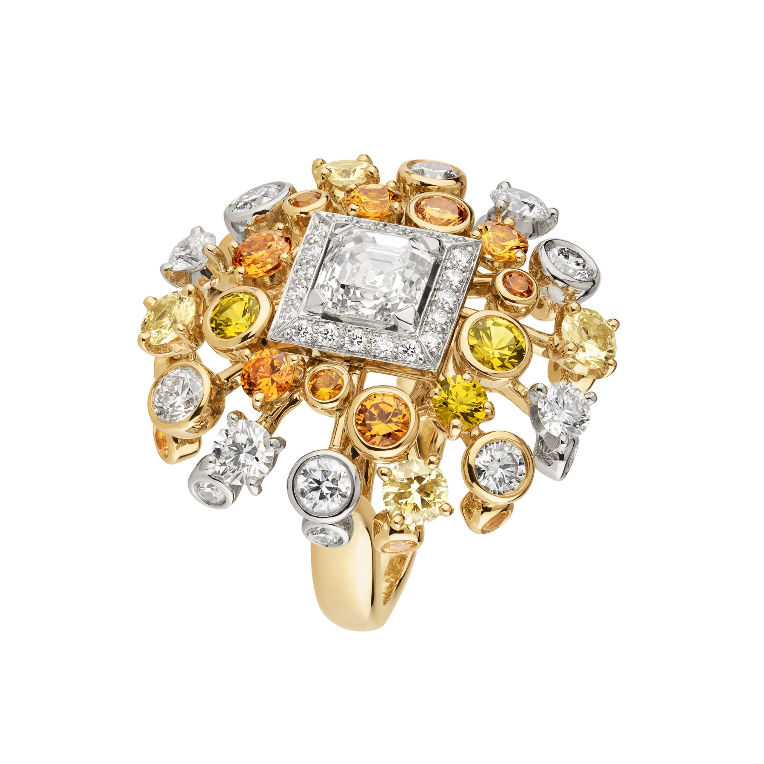 Afin de traduire la révolution olfactive du parfum N°5, CHANEL a imaginé des pièces aux motifs abstraits qui rayonnent et se fondent sur le corps comme un parfum. Les couleurs solaires et ambrées d’une somptueuse composition de plus de 350 carats de topazes impériales donnent un air incandescent, presque baroque au collier Golden Burst. Dans des harmonies de roses, CHANEL joue la carte de la féminité au travers de la parure Blushing Sillage en diamants, rubis, grenats, saphirs jaunes et spinelles roses et rouges formant un dégradé de couleurs qui rappelle l’or du jus du parfum N°5. Du côté monochrome, un nuage de diamants illumine la composition en étoile du collier Diamond Sillage où brille une pierre immaculée de 10 carats. Tout autour, les gemmes semblent former de brillants ricochets sur la peau du décolleté.